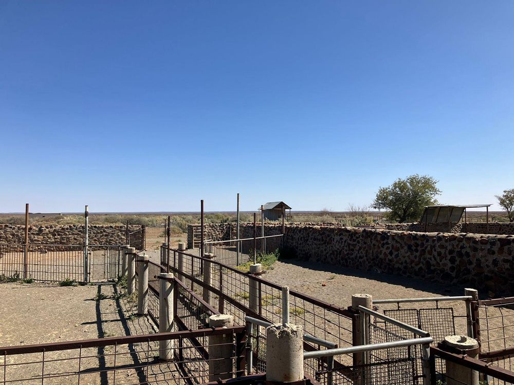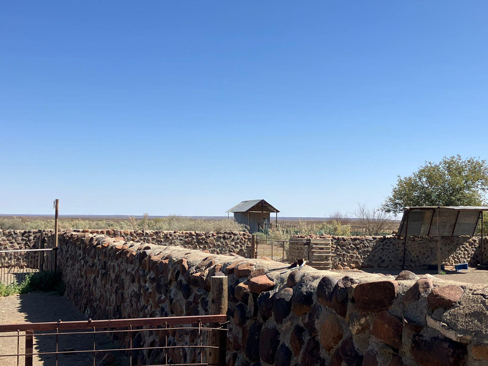 Netjiese klipkrale en veehanteringsgeriewe met 'n laaibank. Die plaas is met jakkalsdraad omhein.