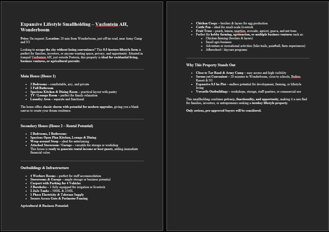 Outbuildings & Features: 4 workers rooms, storerooms, carport for 4 cars, 3 boreholes (1 equipped), 2 JoJo tanks, fruit trees, cattle pen, chicken coops – ready for broilers & layers!