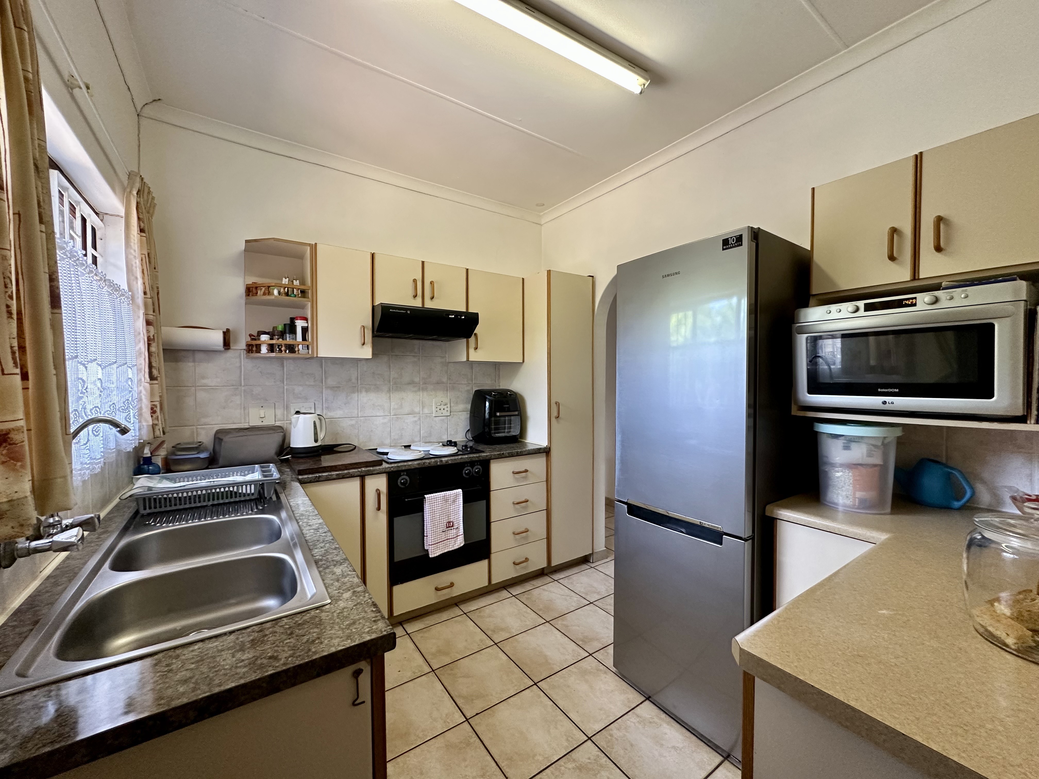 The separate lounge provides the perfect space to unwind or entertain, while the neat kitchen is fitted with an oven, hob, and double sink — making meal prep a breeze.