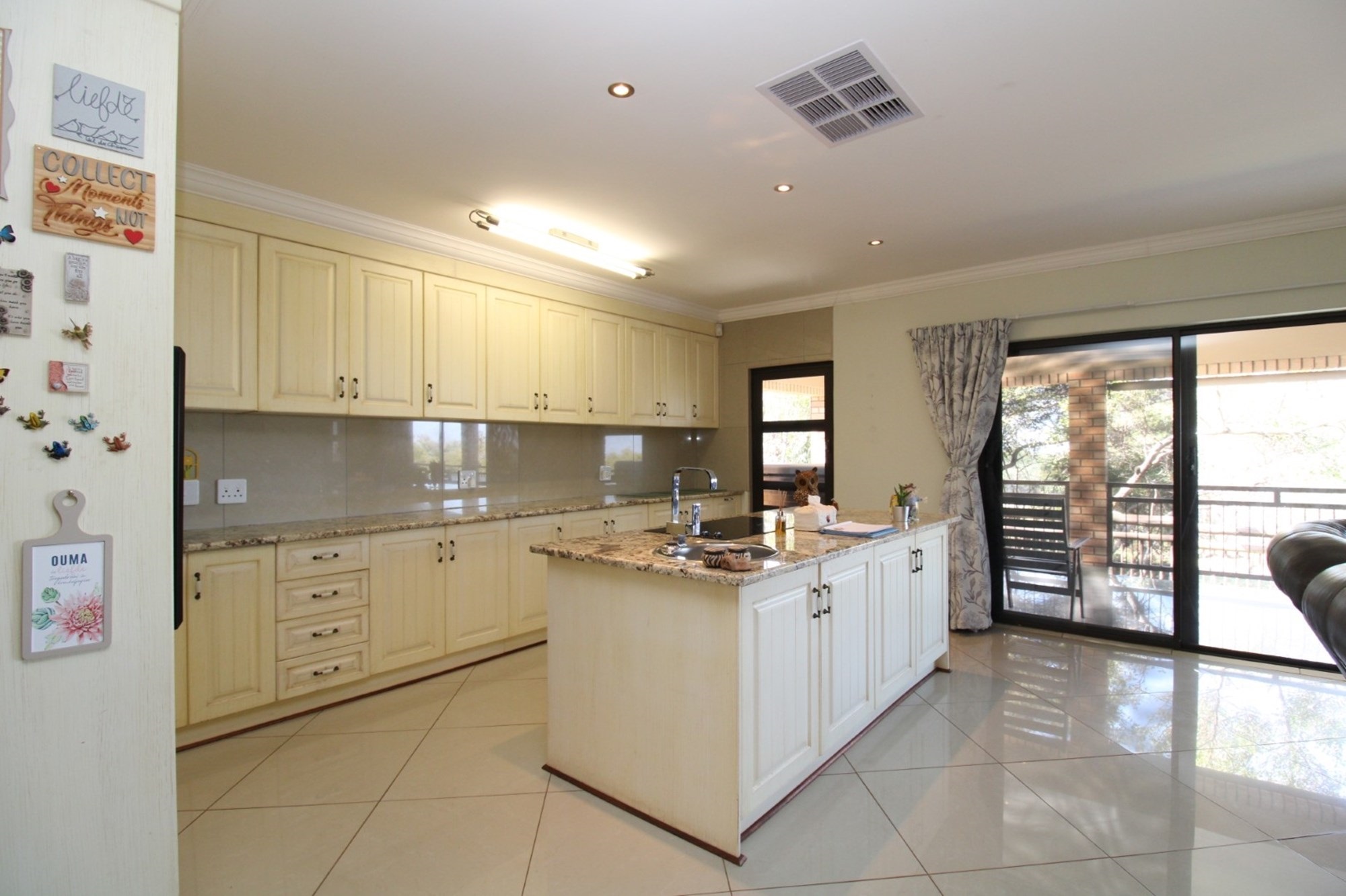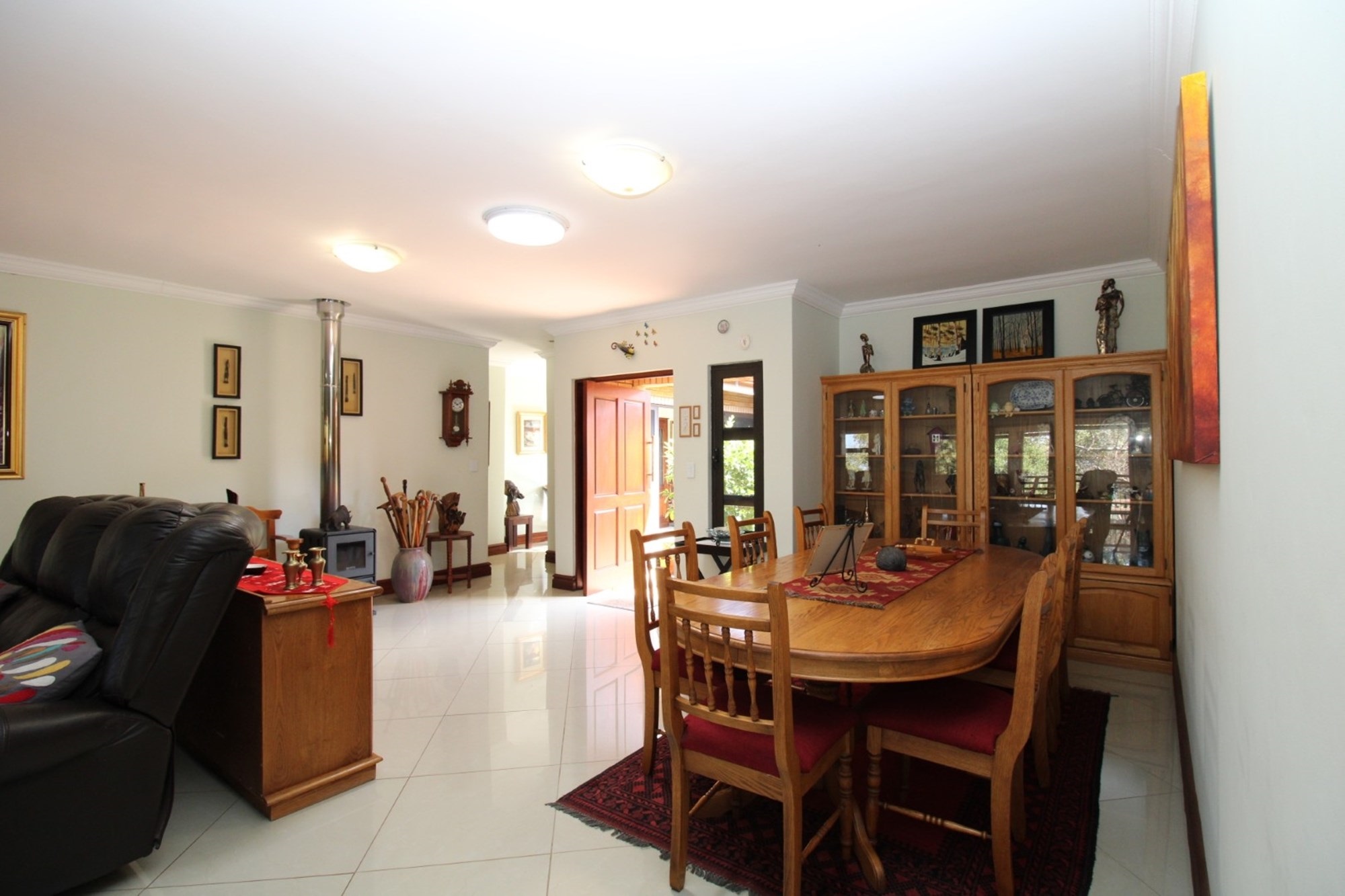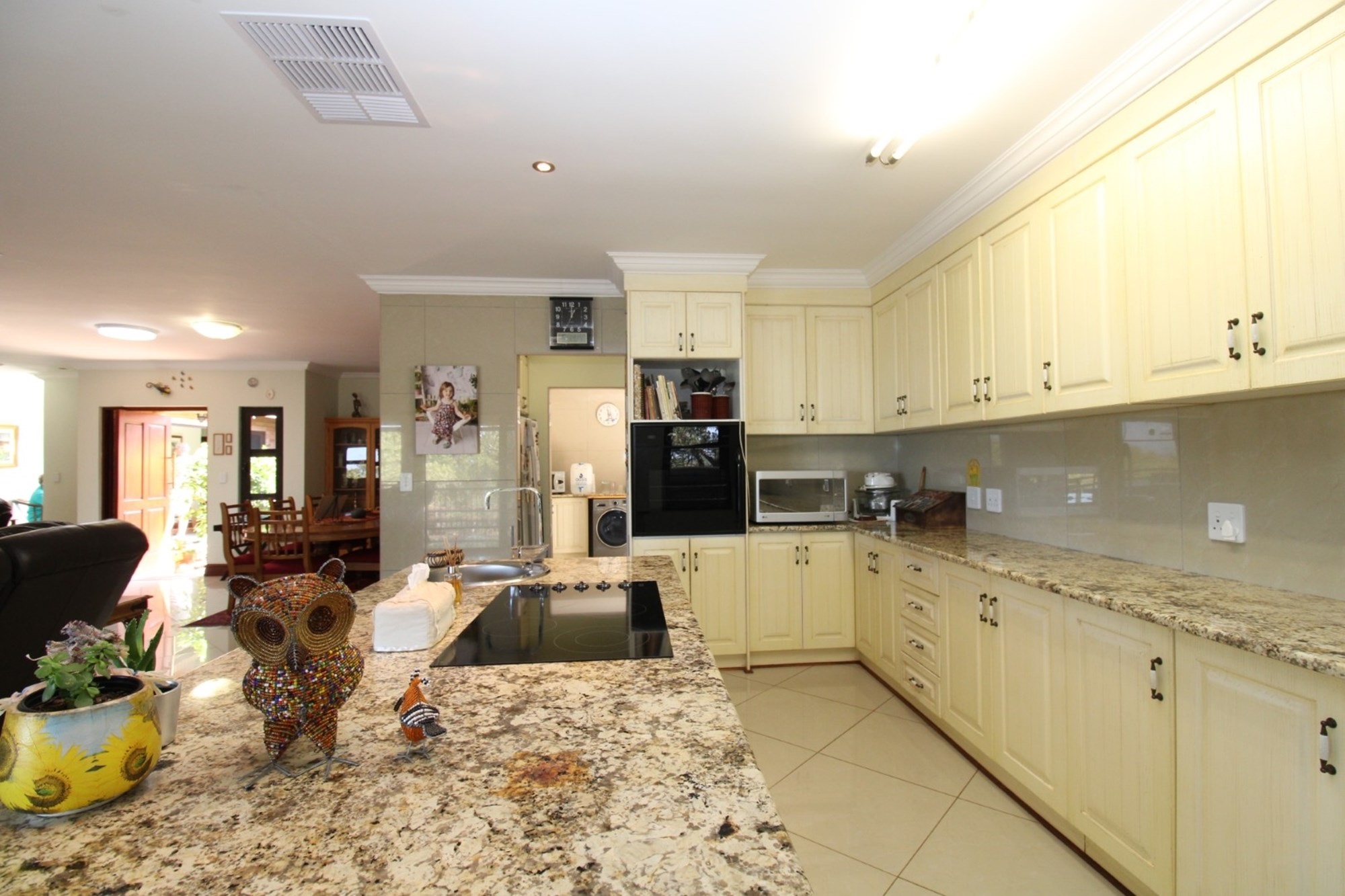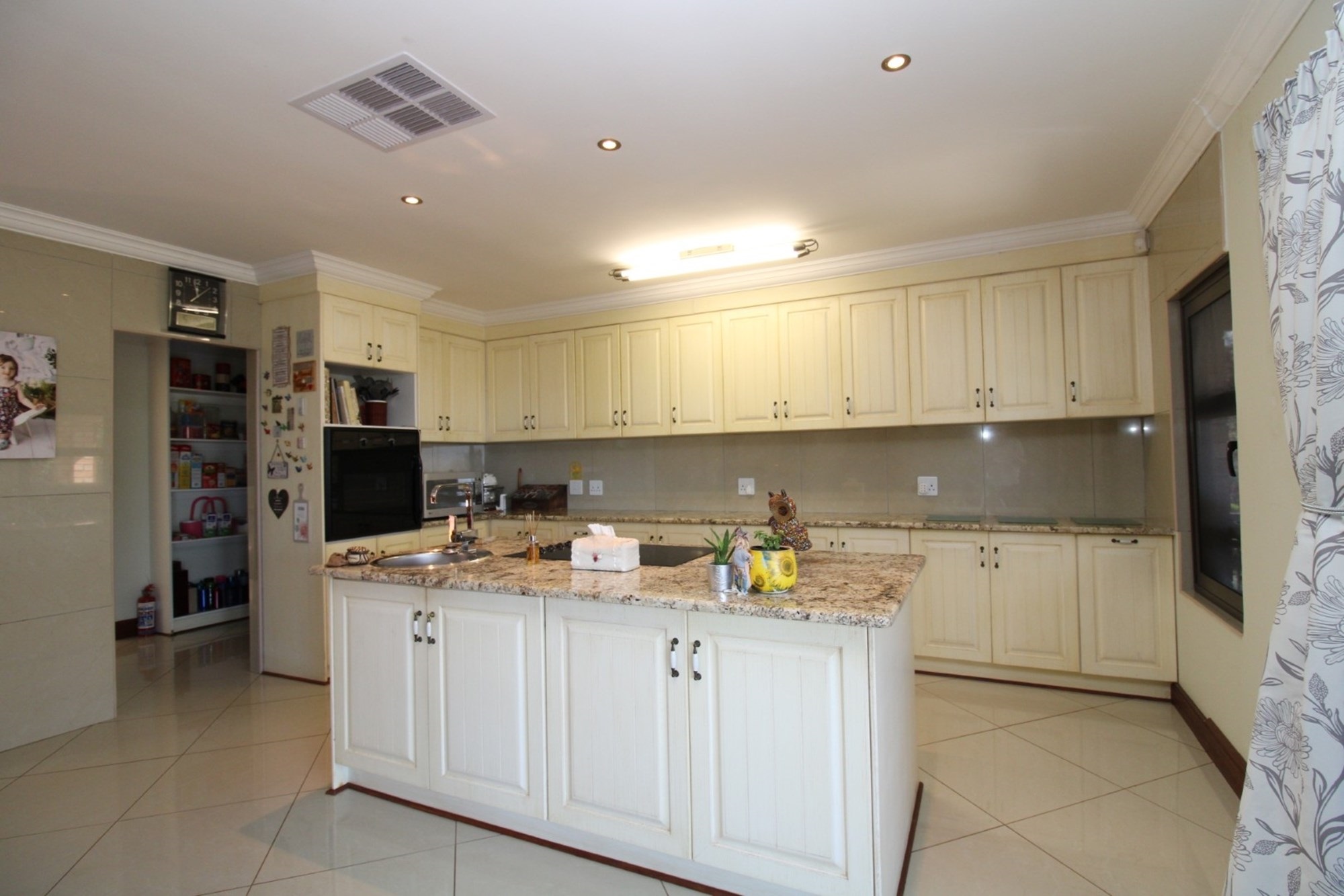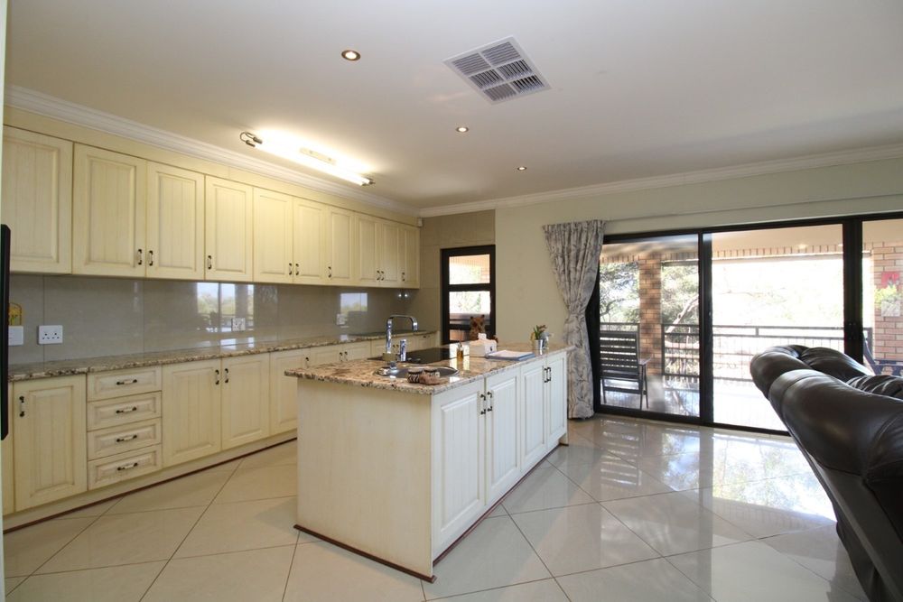 Step through the entrance into an expansive open-plan living area where the lounge, dining room, and kitchen seamlessly merge to create an inviting space for family gatherings and elegant entertaining. A cozy fireplace in the lounge area adds a warm, intimate ambiance, perfect for relaxing evenings, while large glass sliding doors open onto an equally impressive large patio that extends your living space into the outdoors. The kitchen features a separate scullery and laundry area and large pantry.