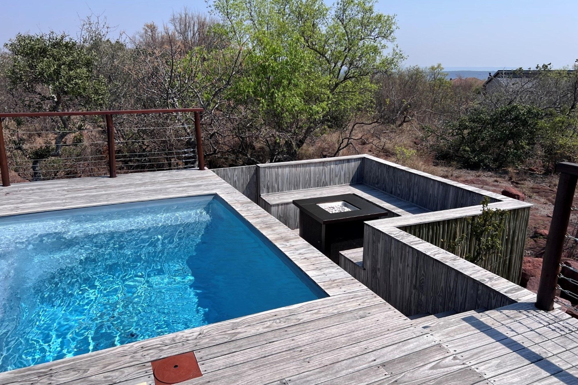 A custom sunken gas firepit, creating an intimate gathering space under the stars.