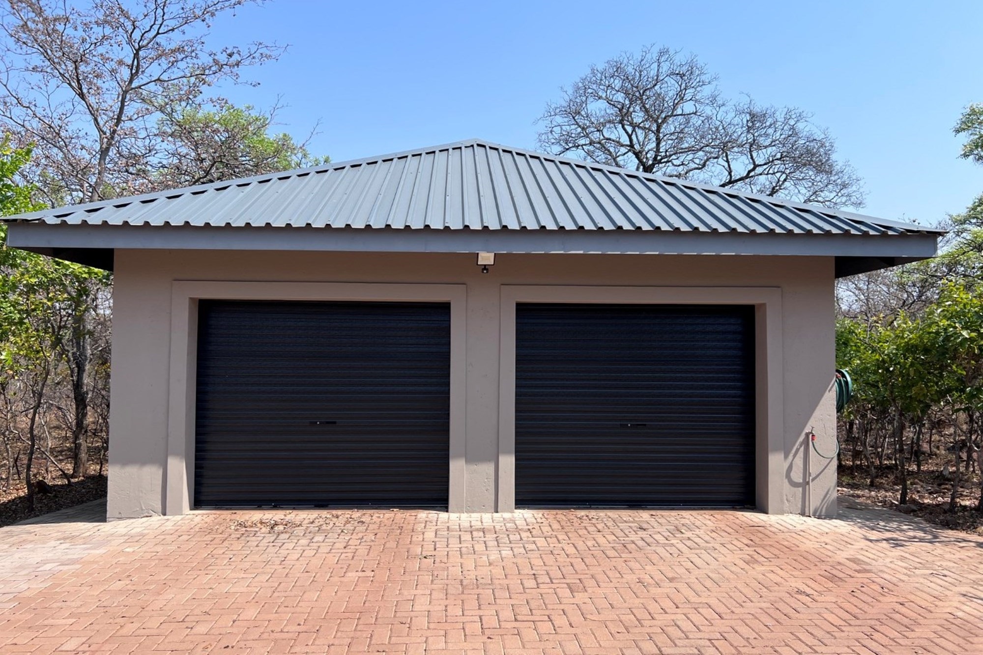 A spacious double garage with motorised doors and additional storage, easily convertible into a guest cottage if additional accommodation is desired.