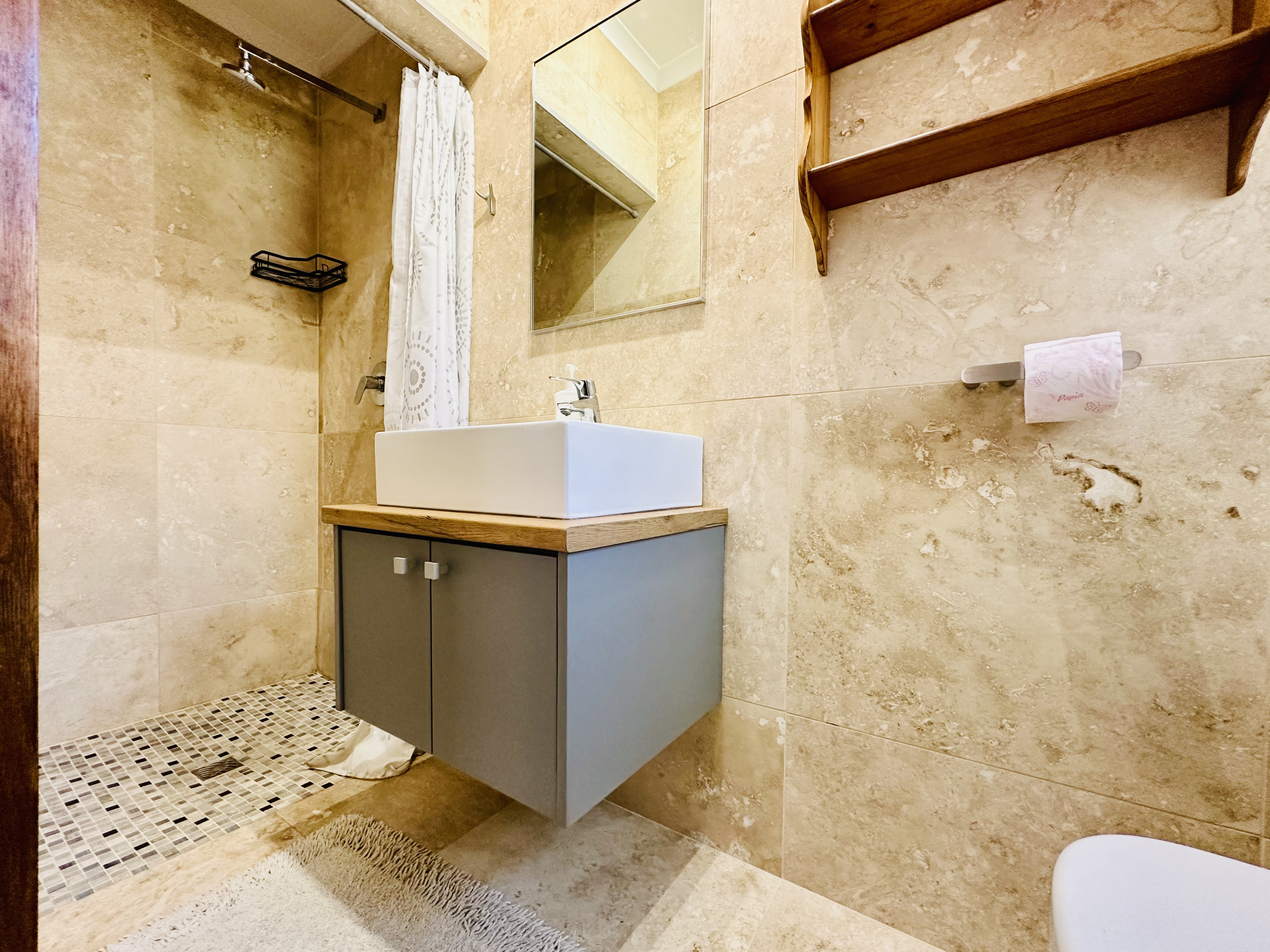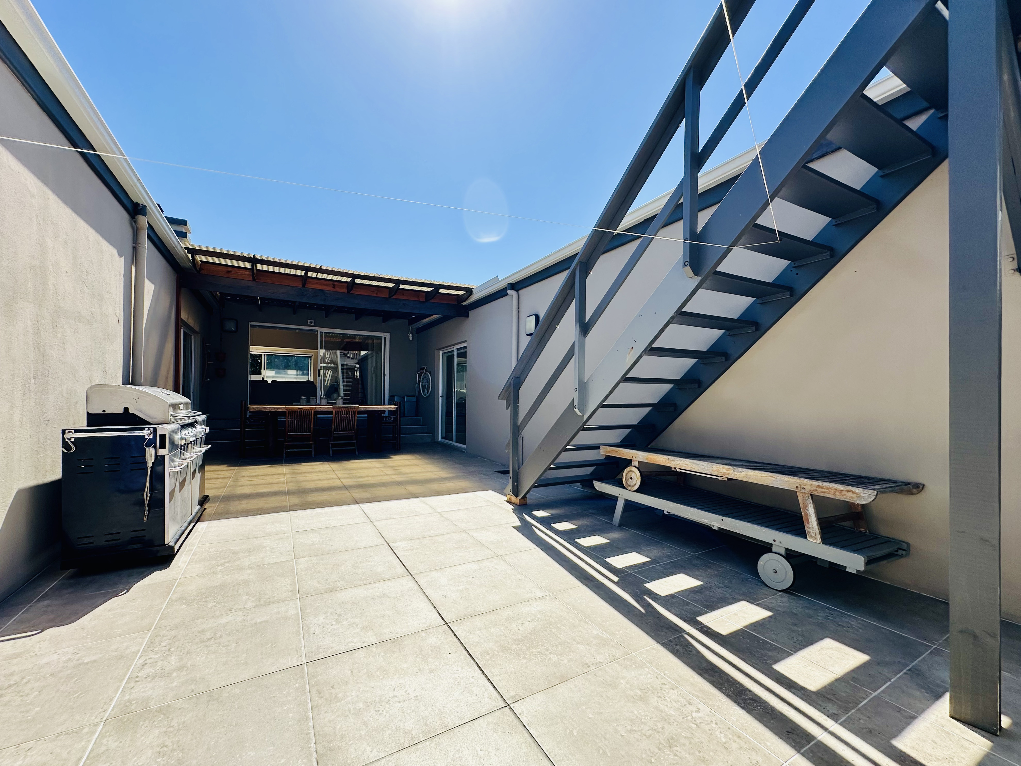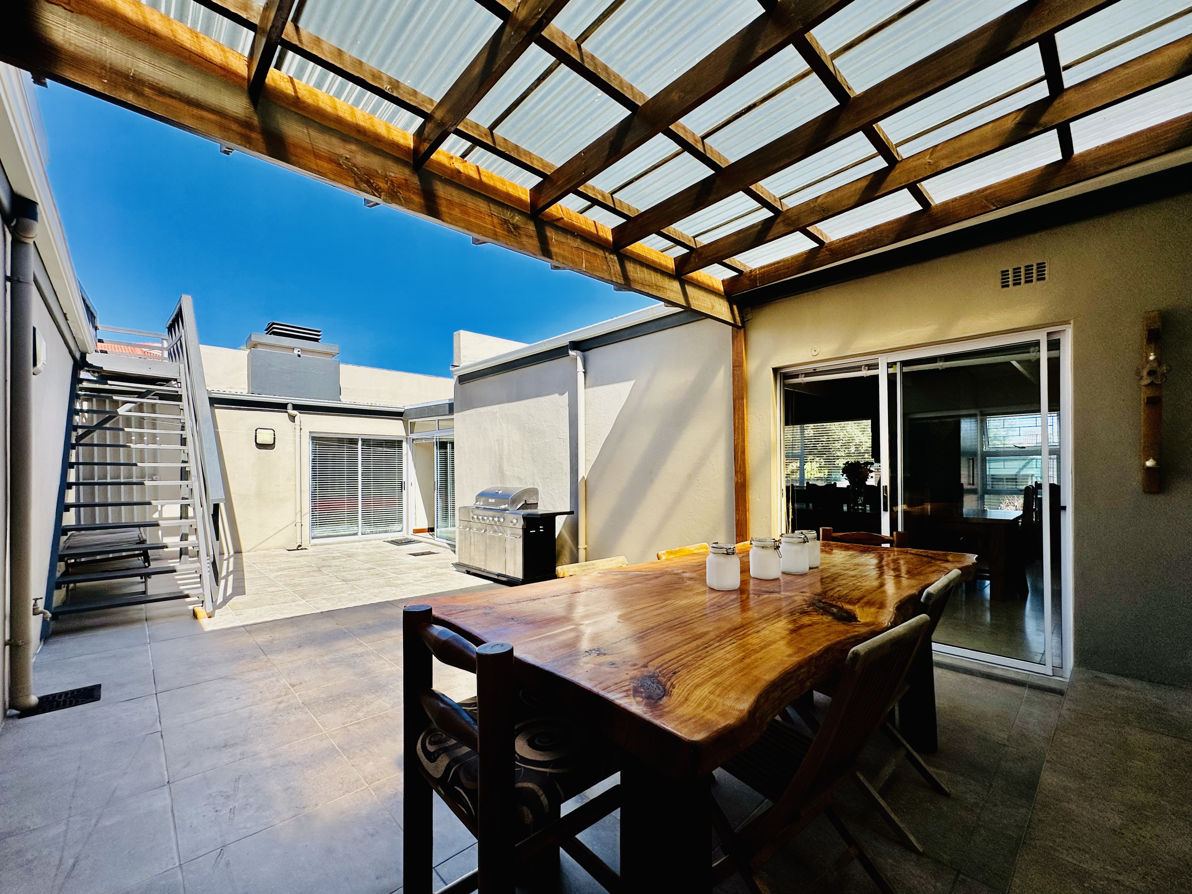 A rooftop balcony, accessed from the internal courtyard, captures both mountain and ocean views — an elevated space ideal for entertaining or a quiet retreat.