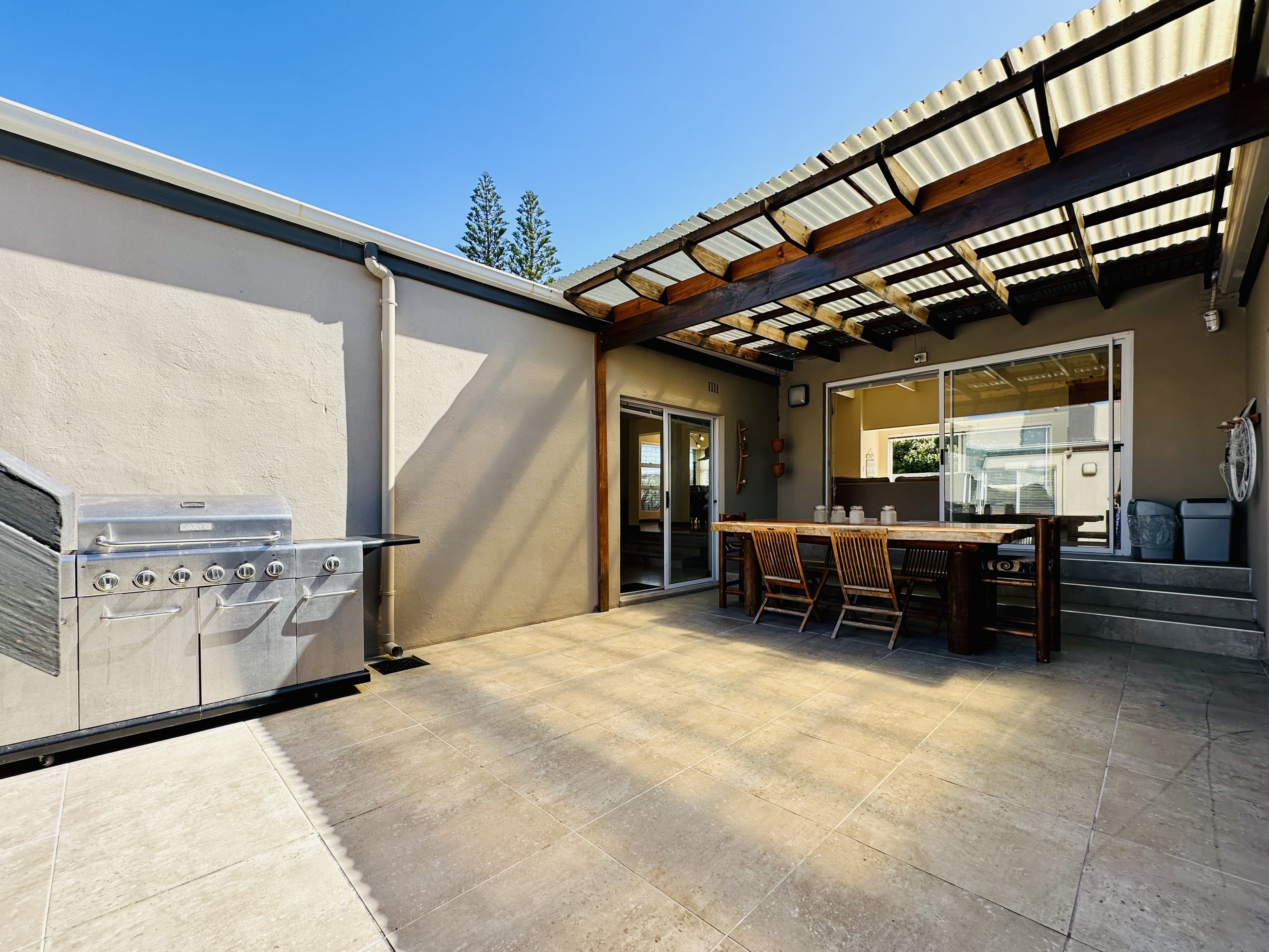The open-plan lounge features an indoor fireplace and extends onto a sunlit patio with ocean views. The kitchen connects directly to an additional entertainment space, which includes an indoor braai, creating a practical and social hub.
