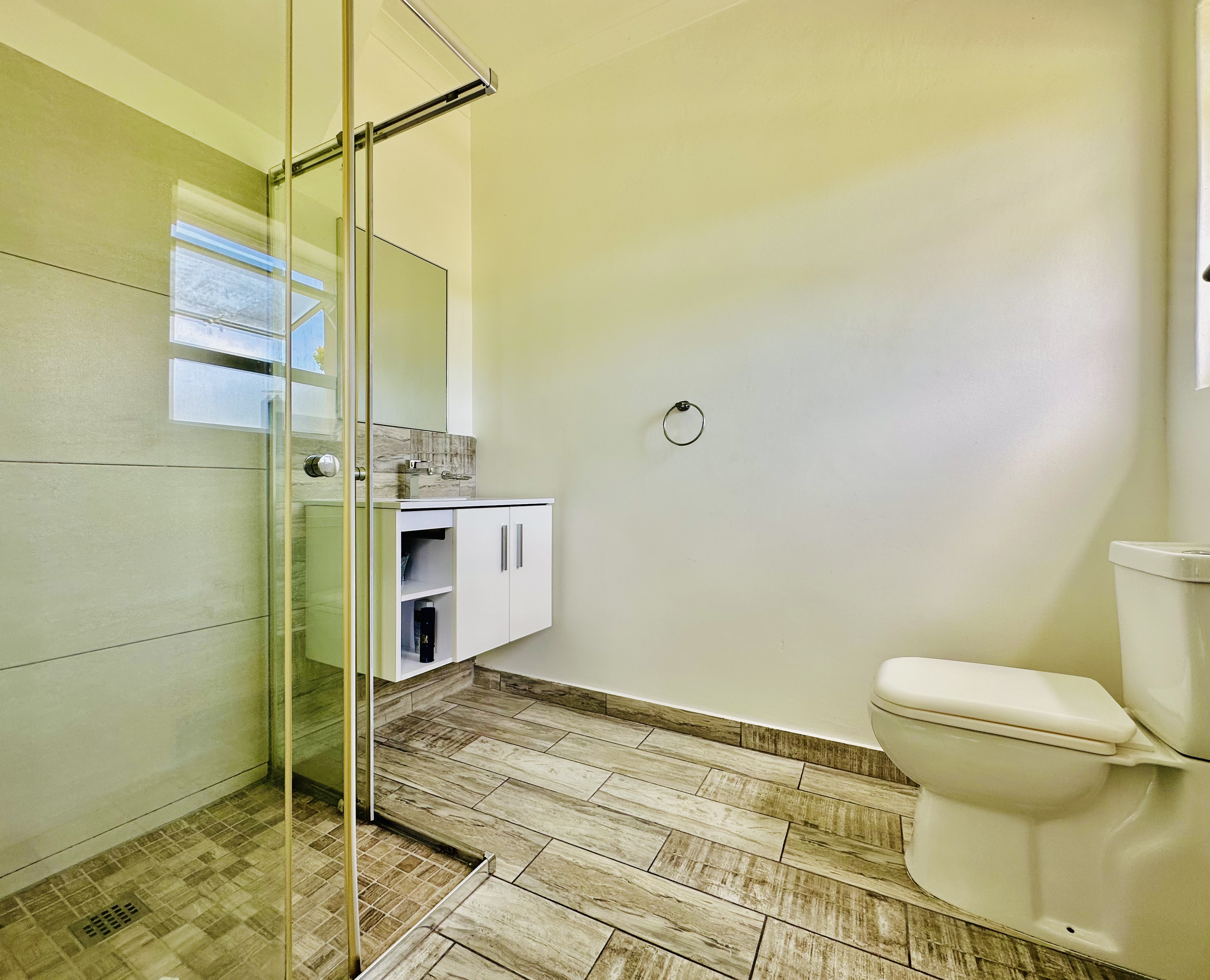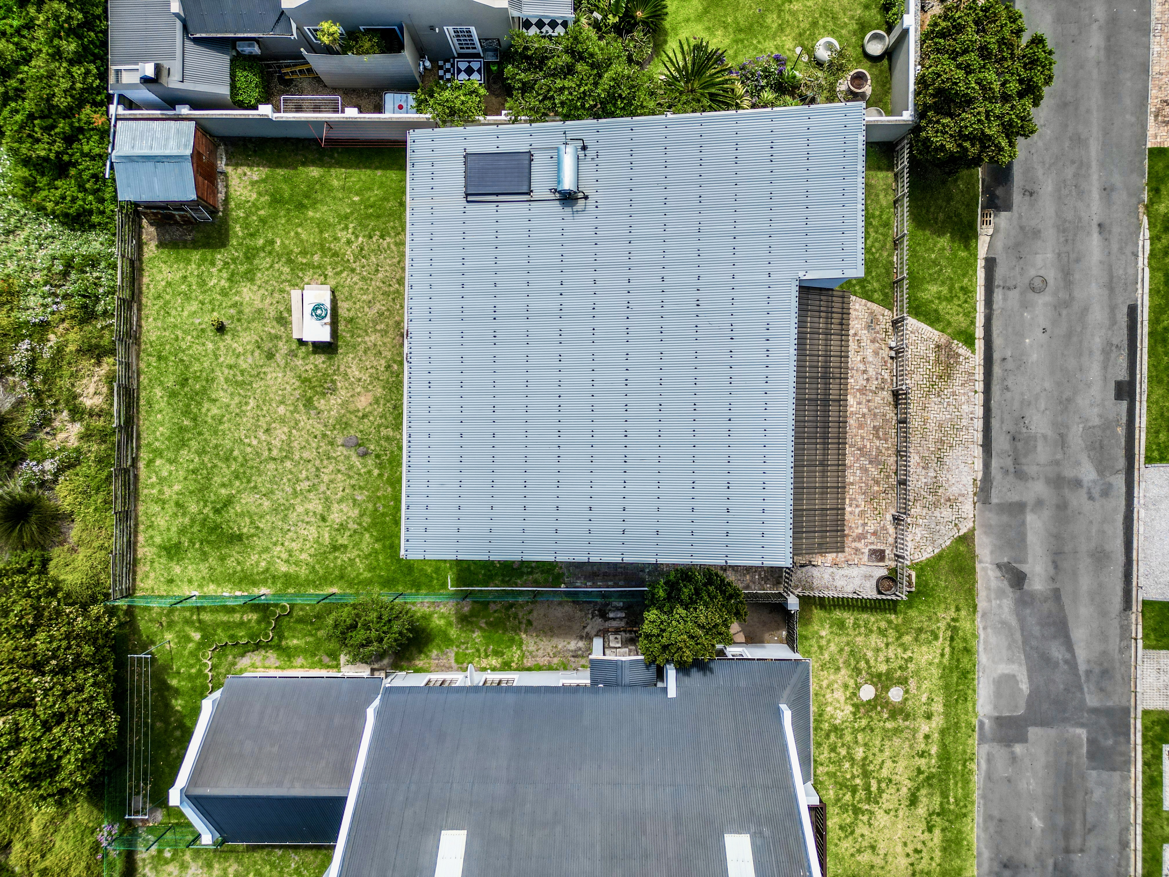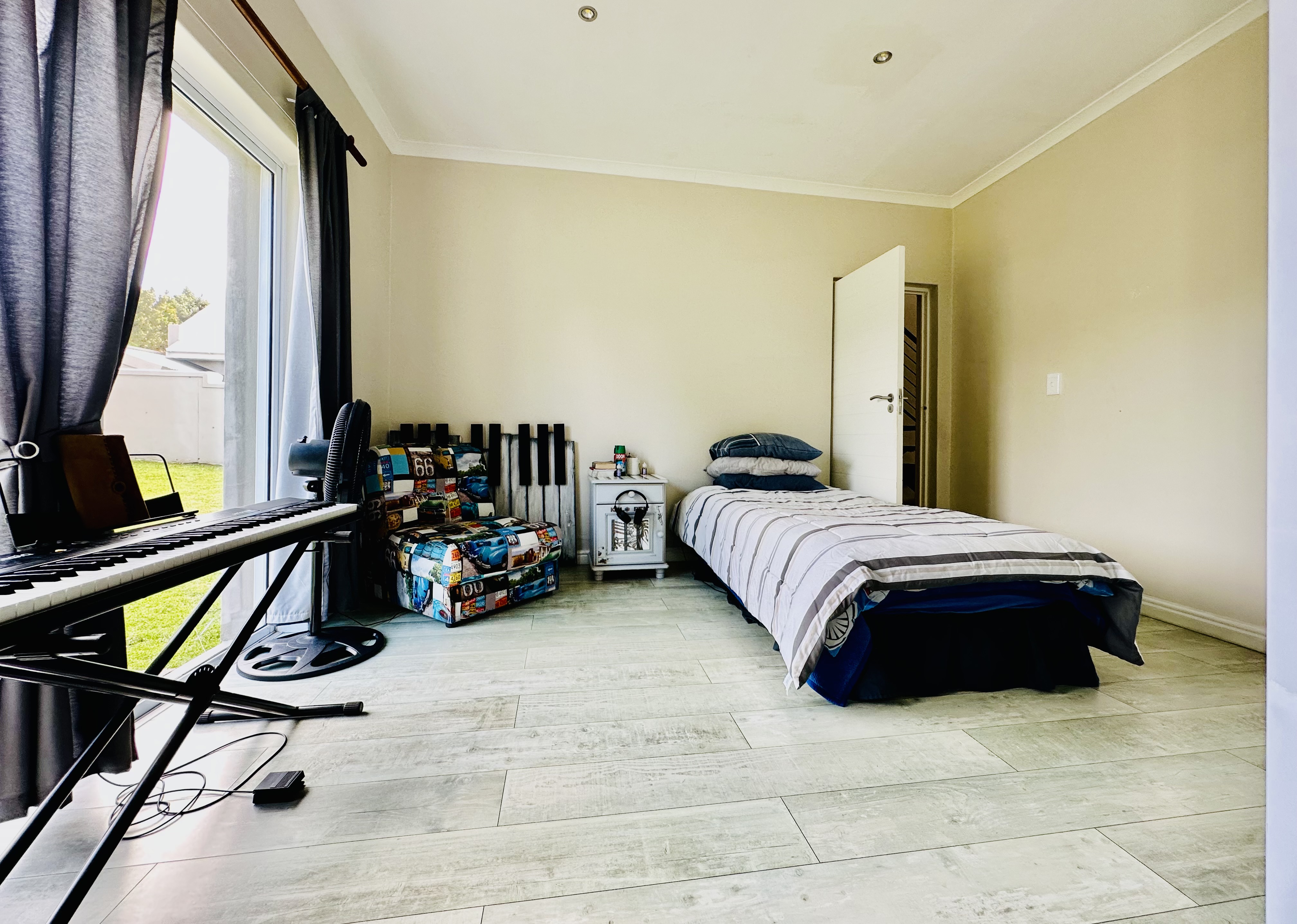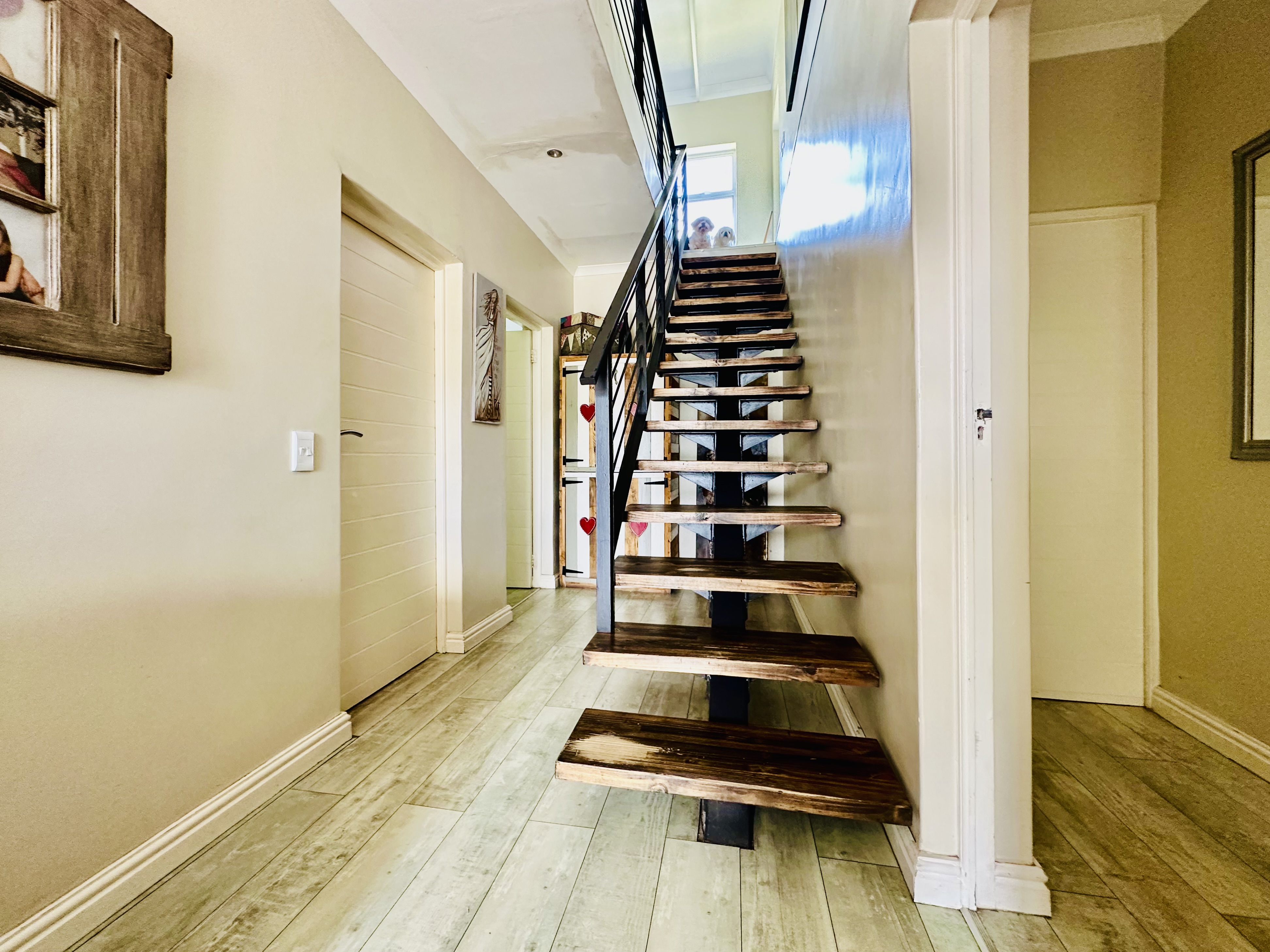 A double garage with automated doors offers direct access into the entrance hall for easy entry and security. From the garage, a separate laundry room leads out to the backyard. Added features include a solar geyser and a full security system with outside beams.
