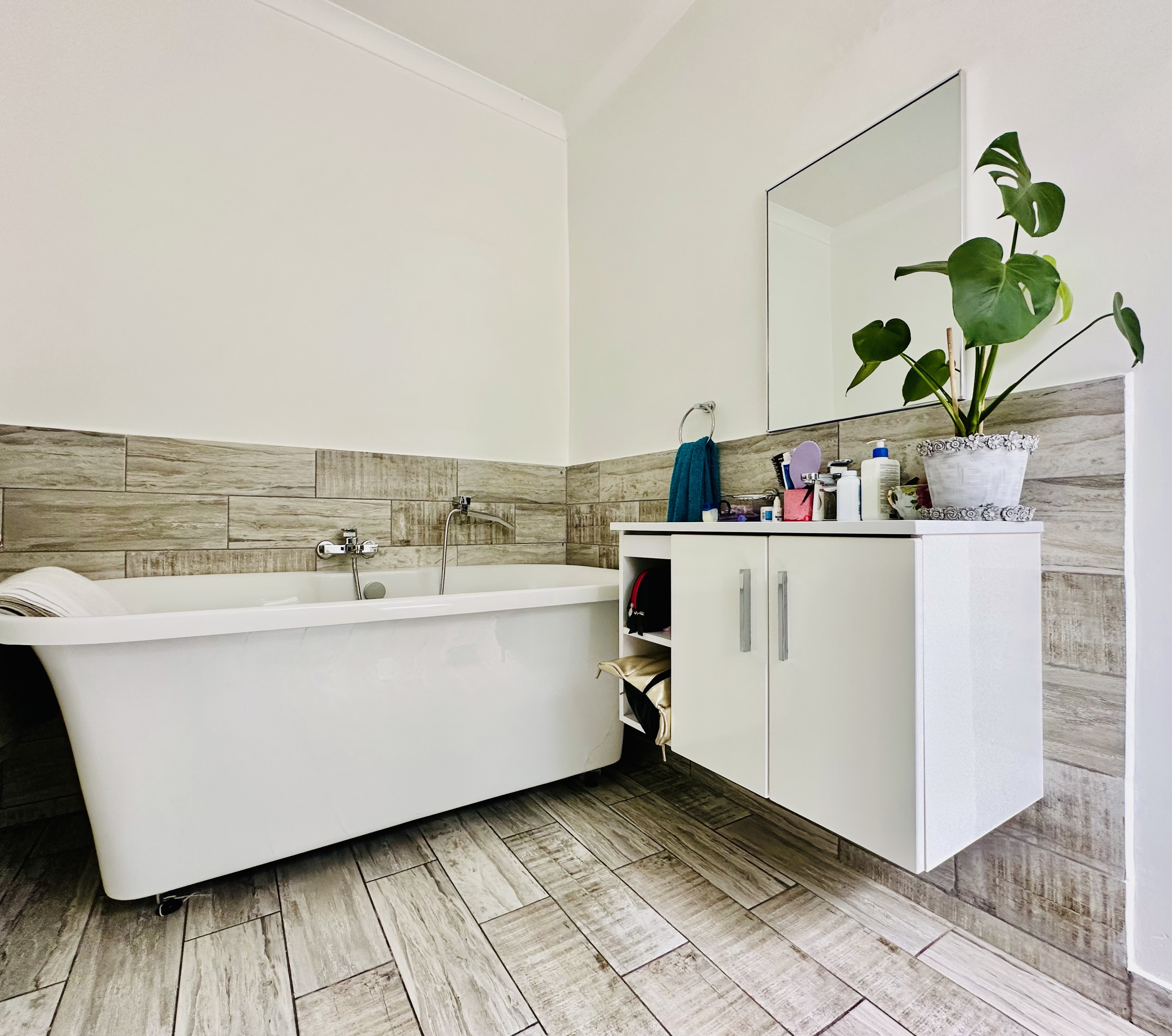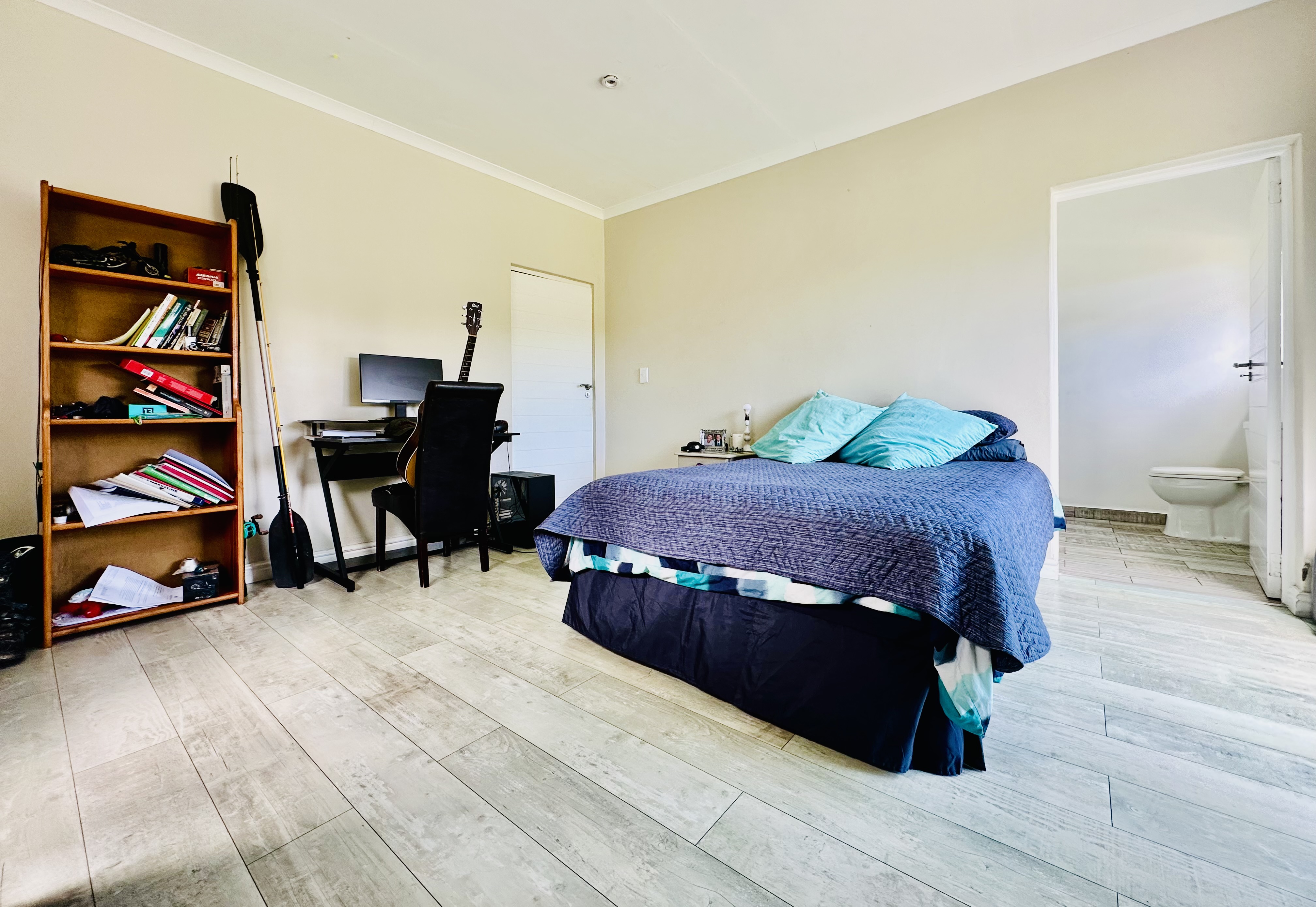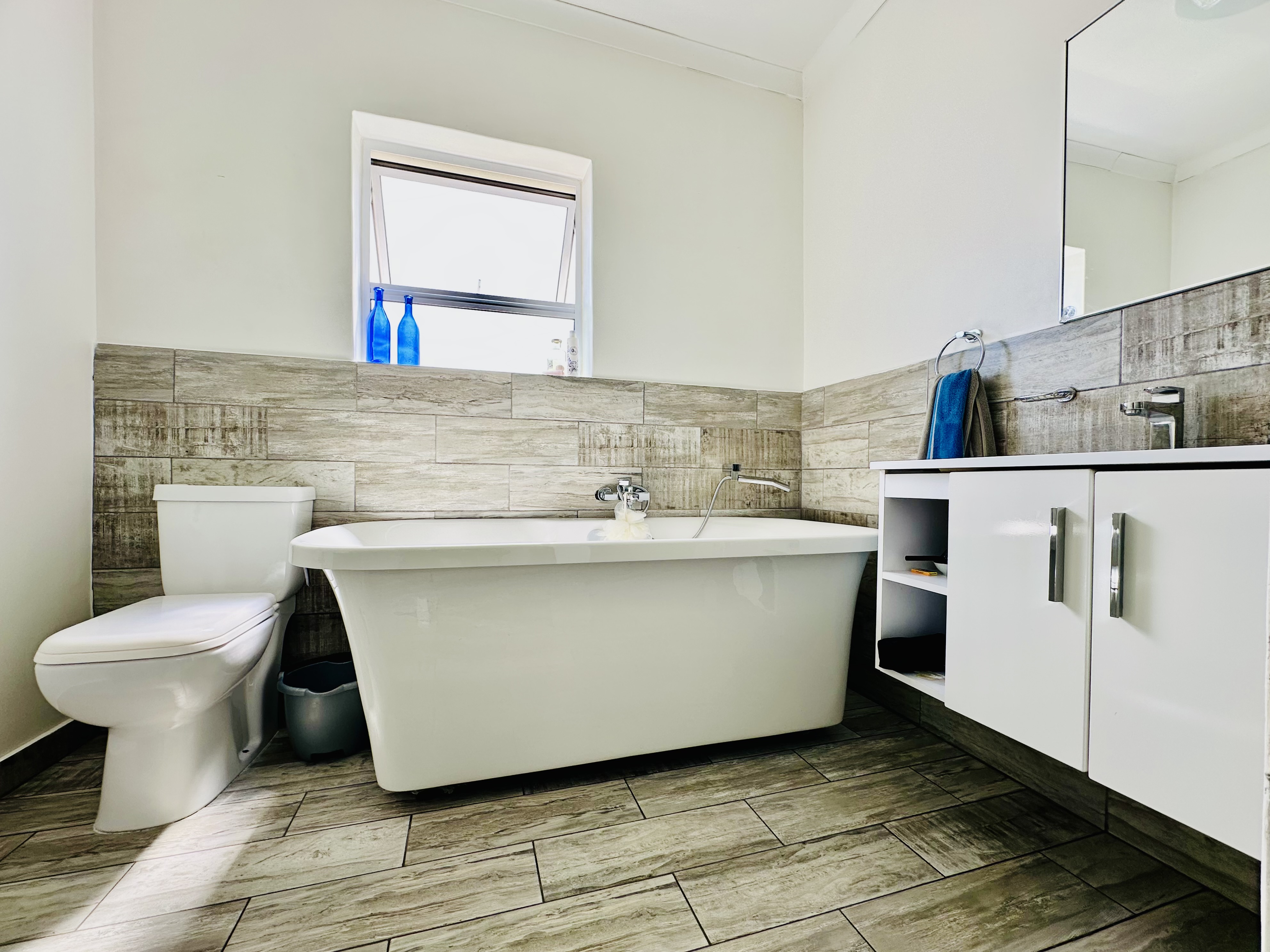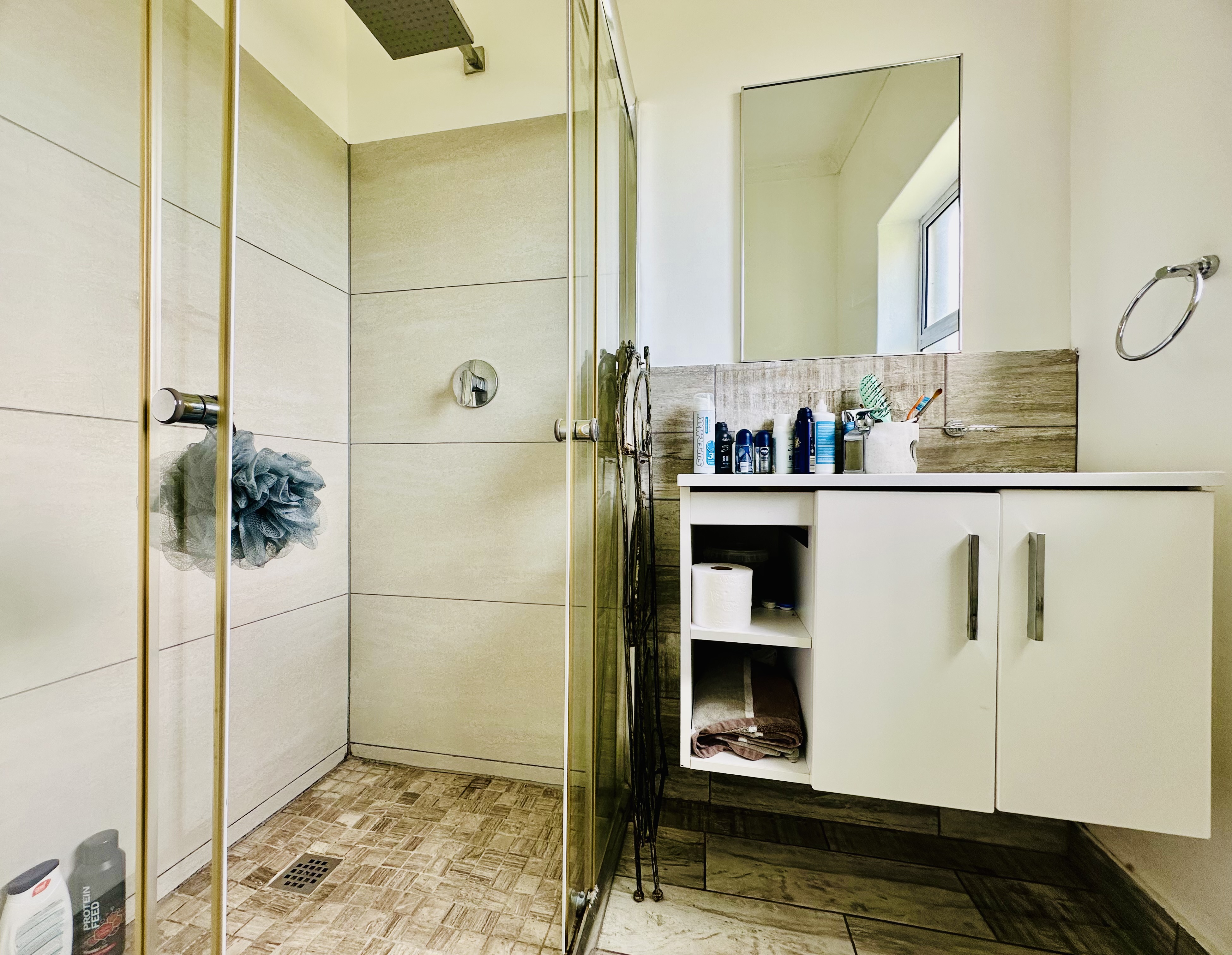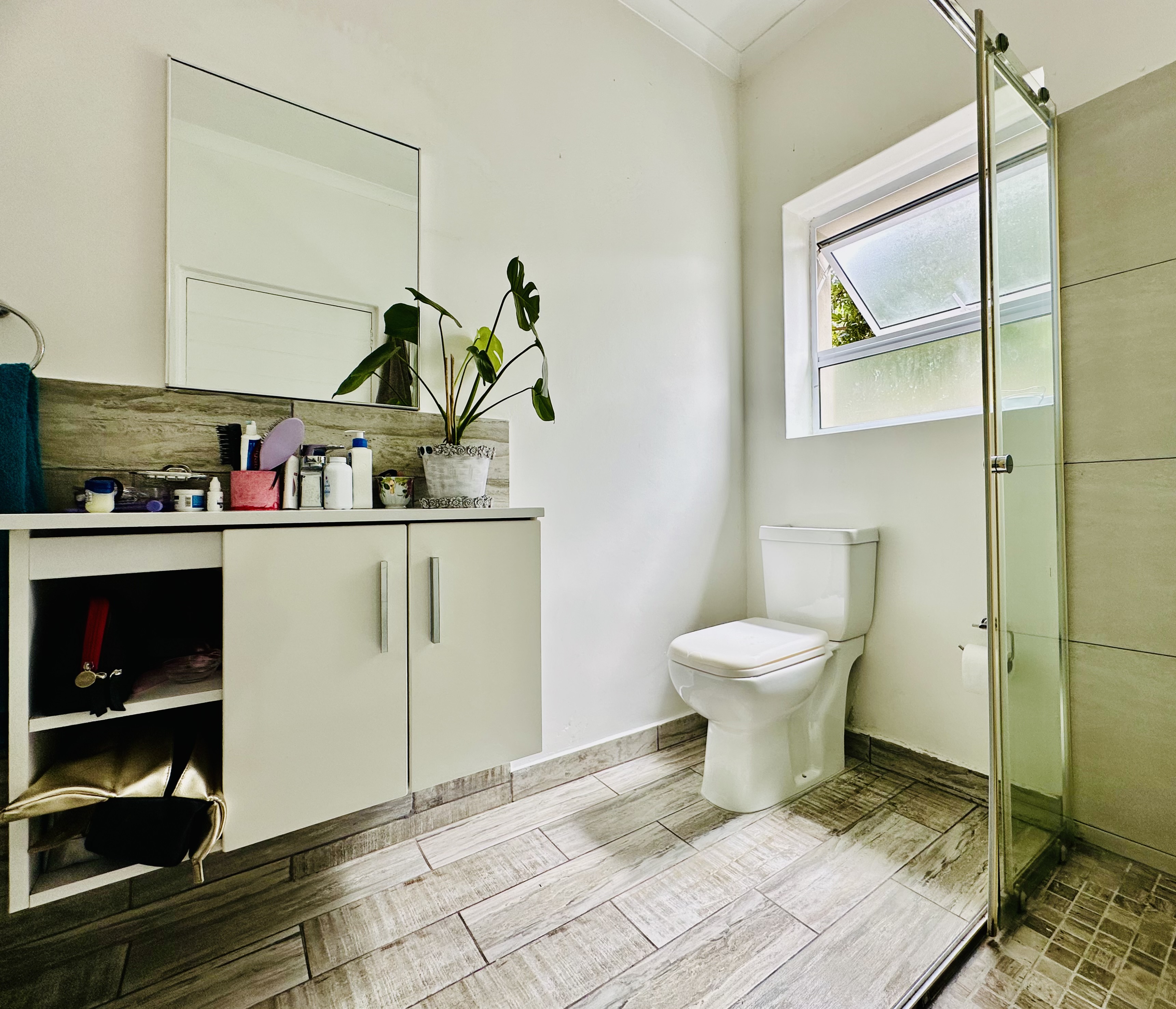 A double garage with automated doors offers direct access into the entrance hall for easy entry and security. From the garage, a separate laundry room leads out to the backyard. Added features include a solar geyser and a full security system with outside beams.