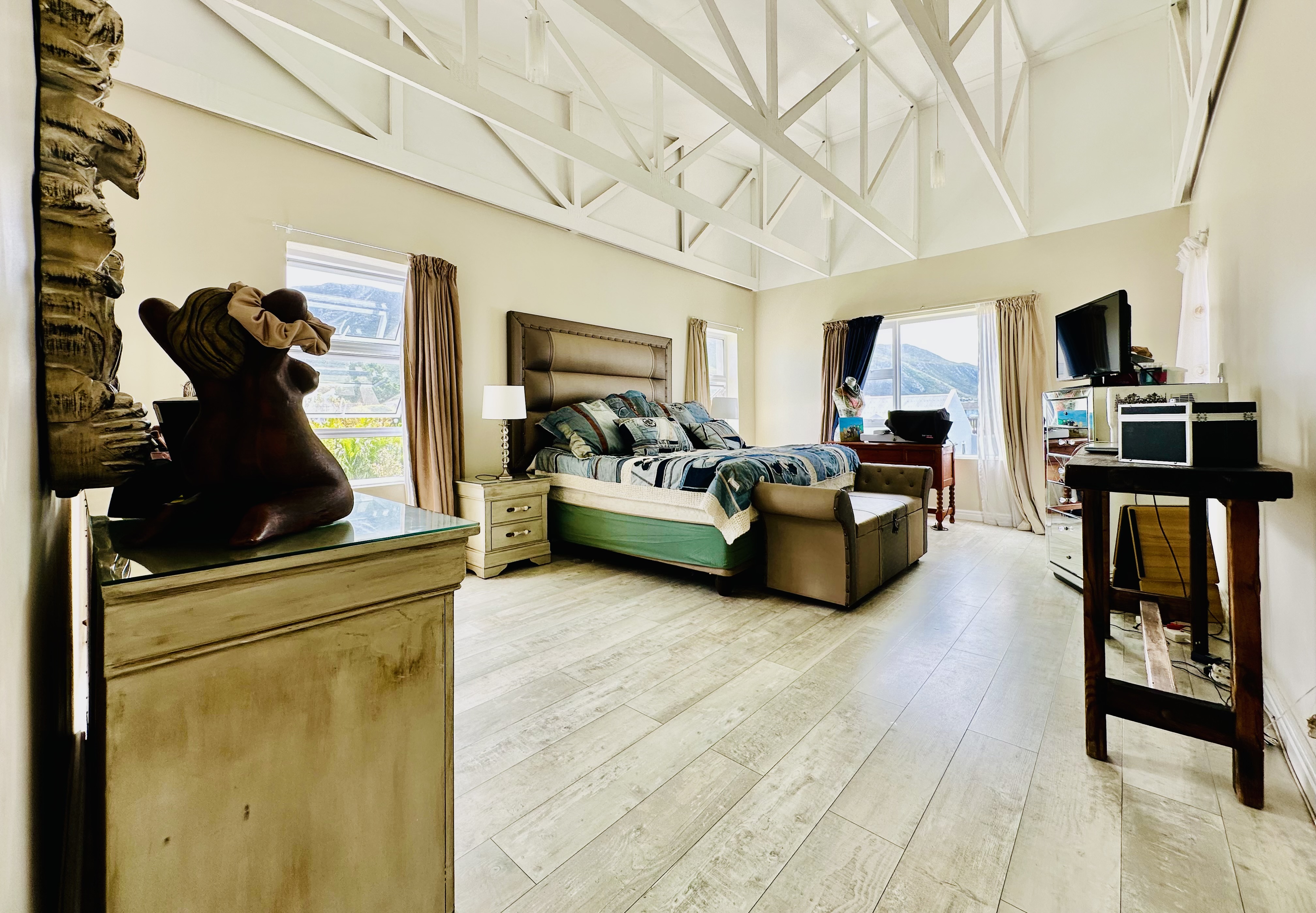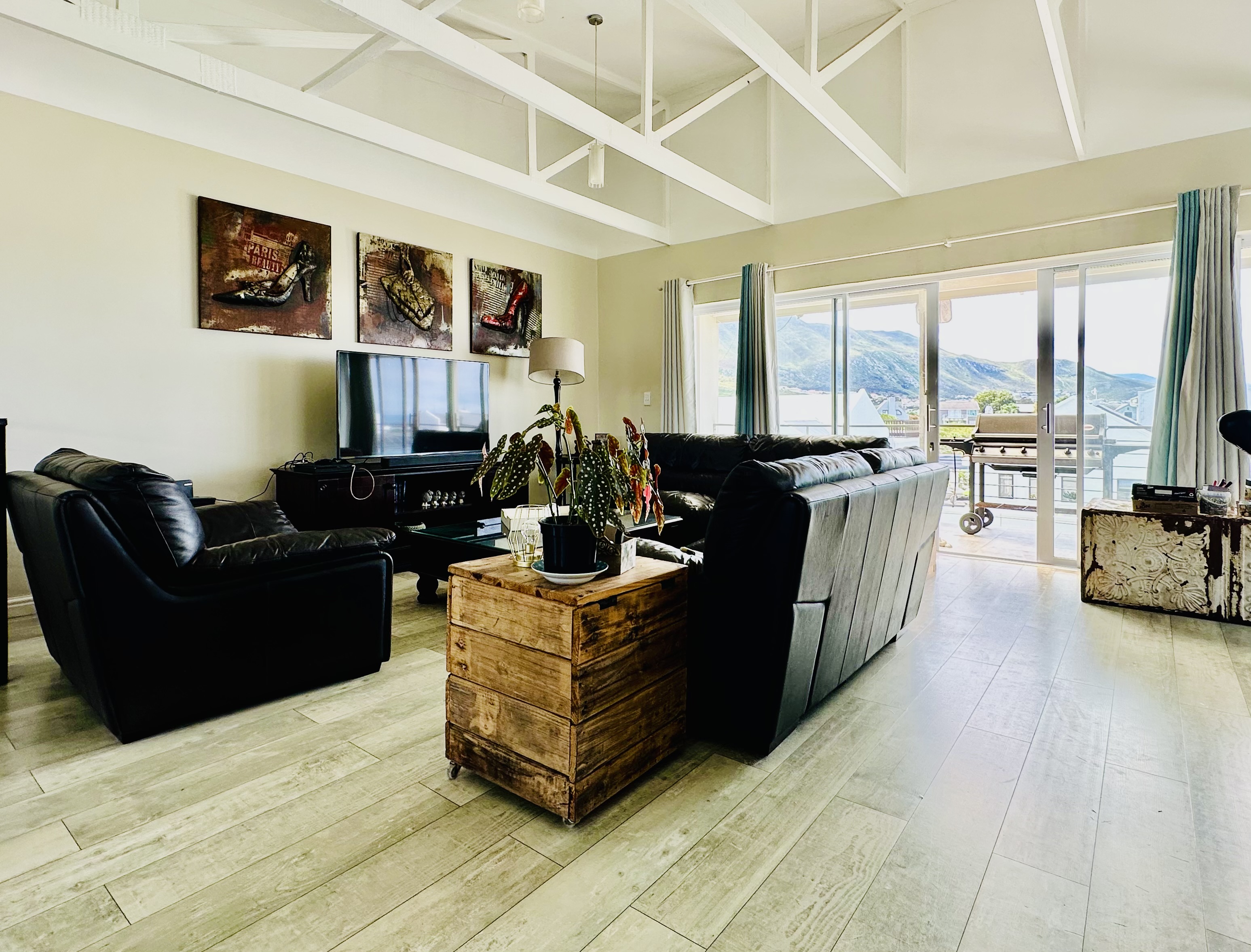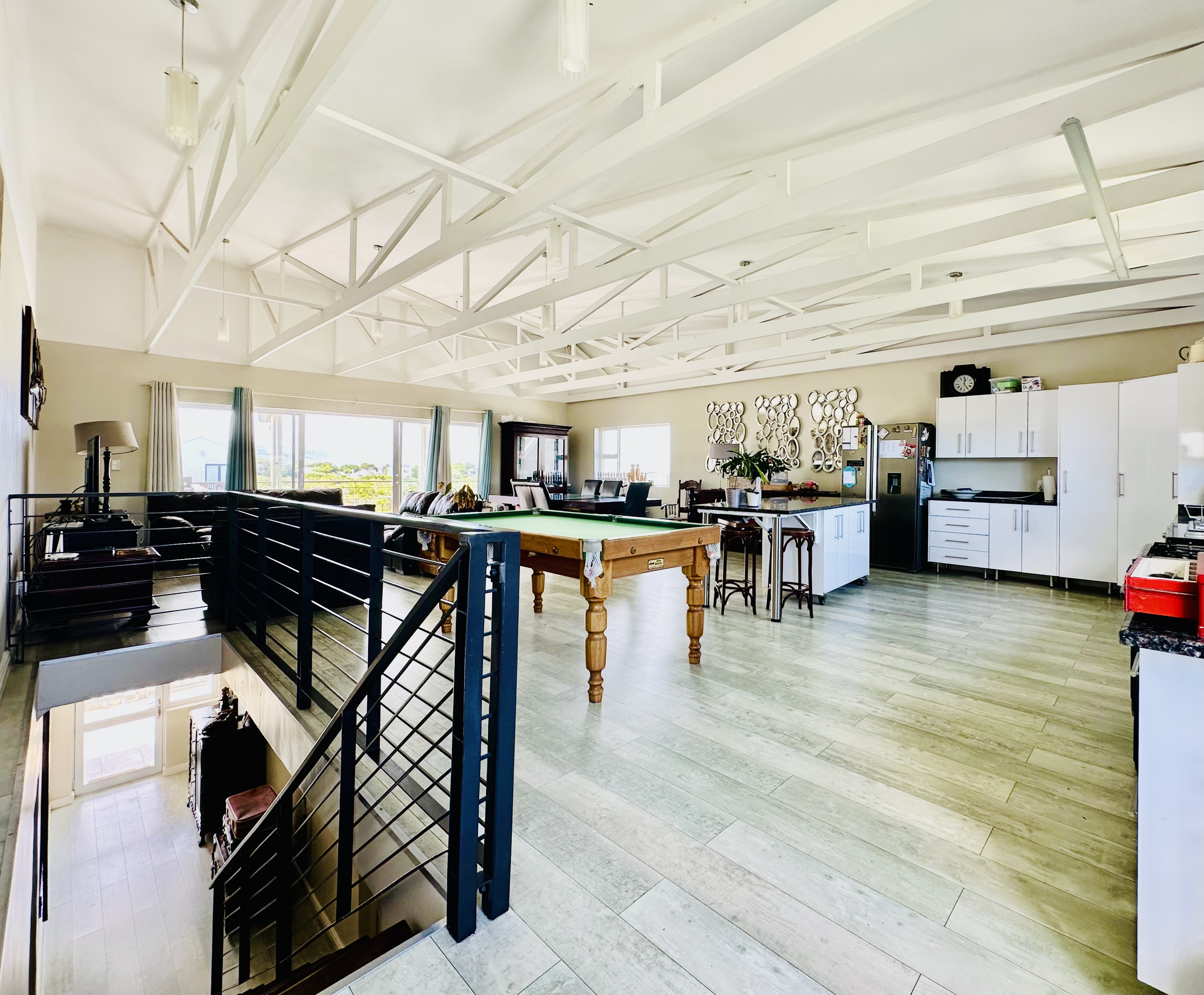 The upper level opens into a striking, airy space with vaulted ceilings that amplify the light and volume, connecting the kitchen and front balcony in one effortless flow. The layout offers endless possibilities to design your ideal lounge and dining setup, all while taking in the surrounding mountain scenery and glimpses of the ocean.