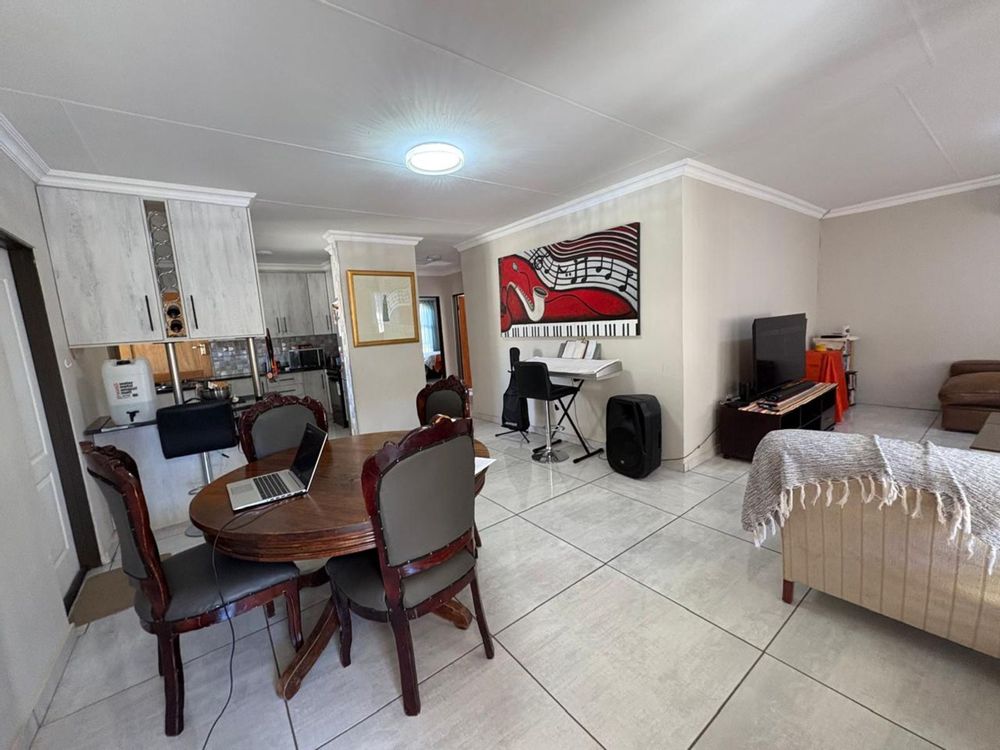 Open-plan lounge, dining room, and kitchen with built-in cupboards, eye-level oven, hob, and extractor fan