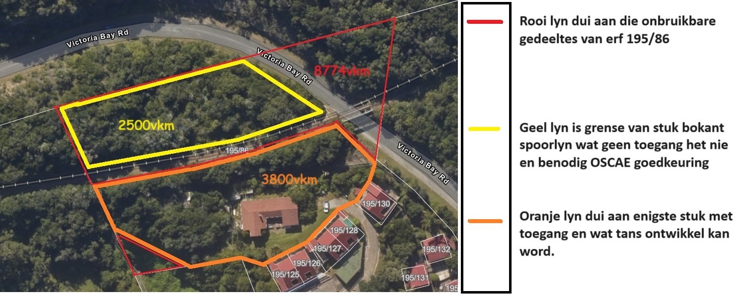 An interesting piece of land! Available above Seabreeze Cabana's at Victoria Bay. An existing wooden house stands on 3000sqm of the property, above Seabreeze and below the railway line. The house would more than likely have to be demolished however an engineers professional opinion would be needed in this regard. Electricity, water and sewerage connections are all in place as well as a secure fence which surrounds the 3000sqm. Secure access via a registered right of way is through the Seabreeze Cabana Complex. Possibilities are endless! One could build a couple or more holiday lets! There is also potential for a sectional title development on the remaining land above the railway line, (subject to access from the provincial road) however applications to the municipality would be necessary. This land is looking for someone with imagination!