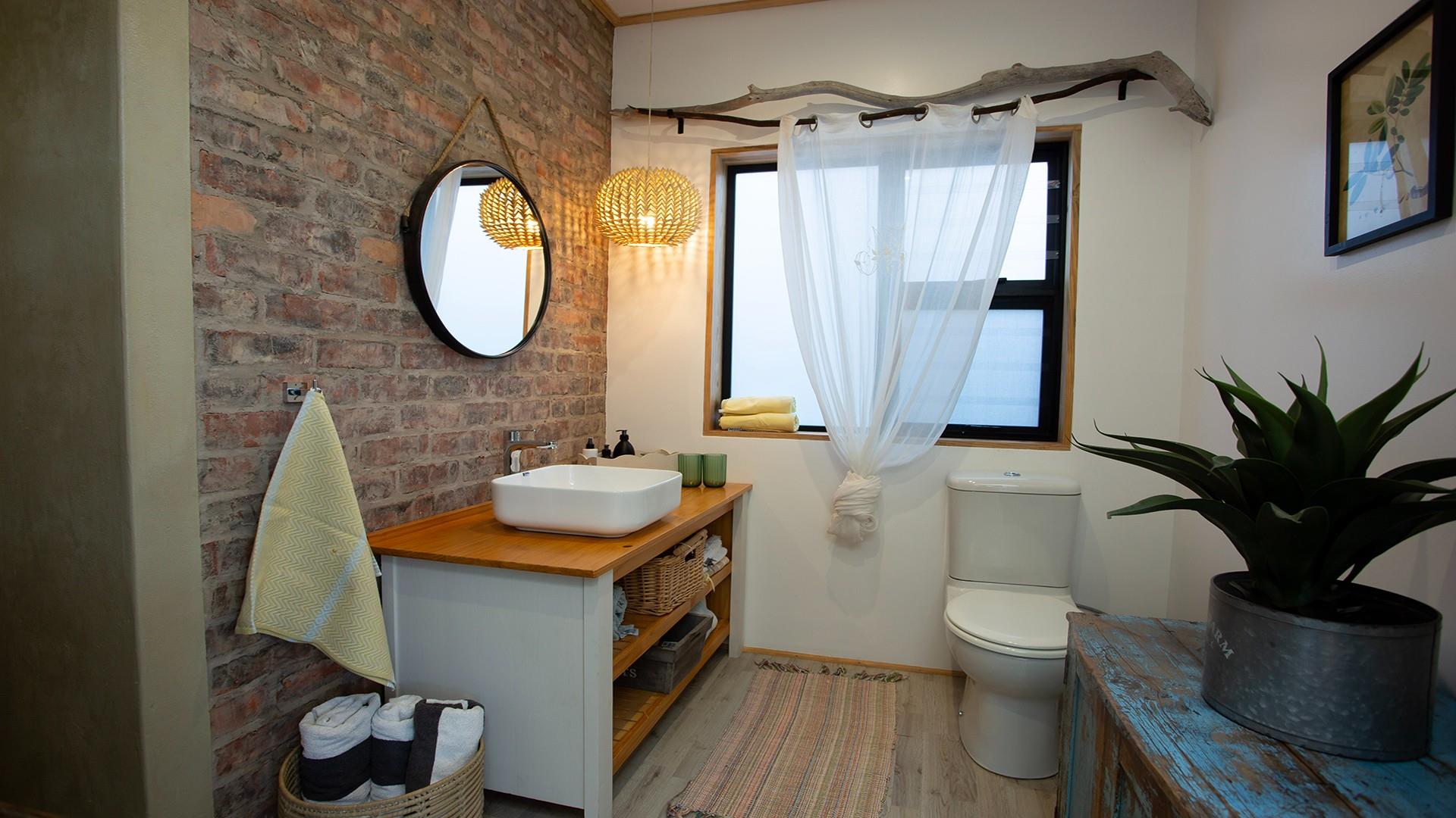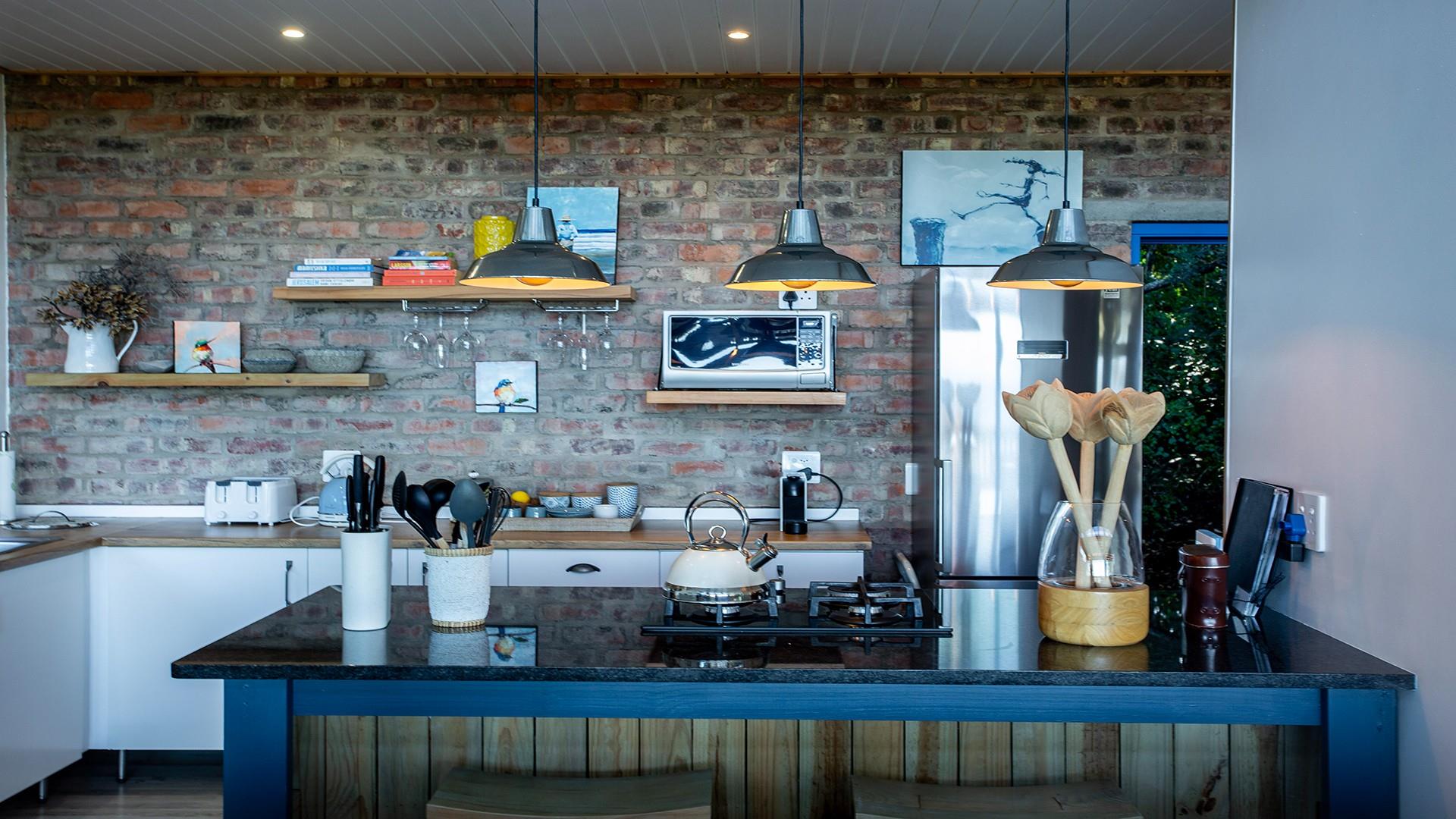 Every detail has been thoughtfully curated — from the exposed brick kitchen accented by soft blue appliances, to the handcrafted wooden finishes and designer coastal décor. The result is a space that feels both grounded and luxurious — a retreat that invites you to slow down and breathe.
