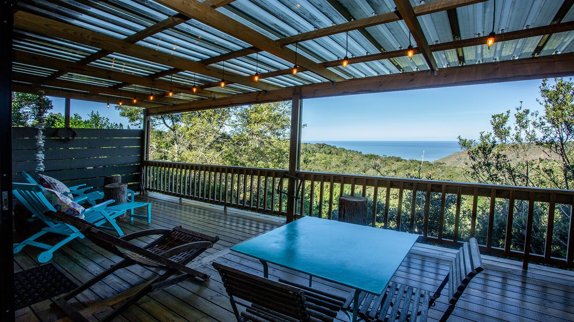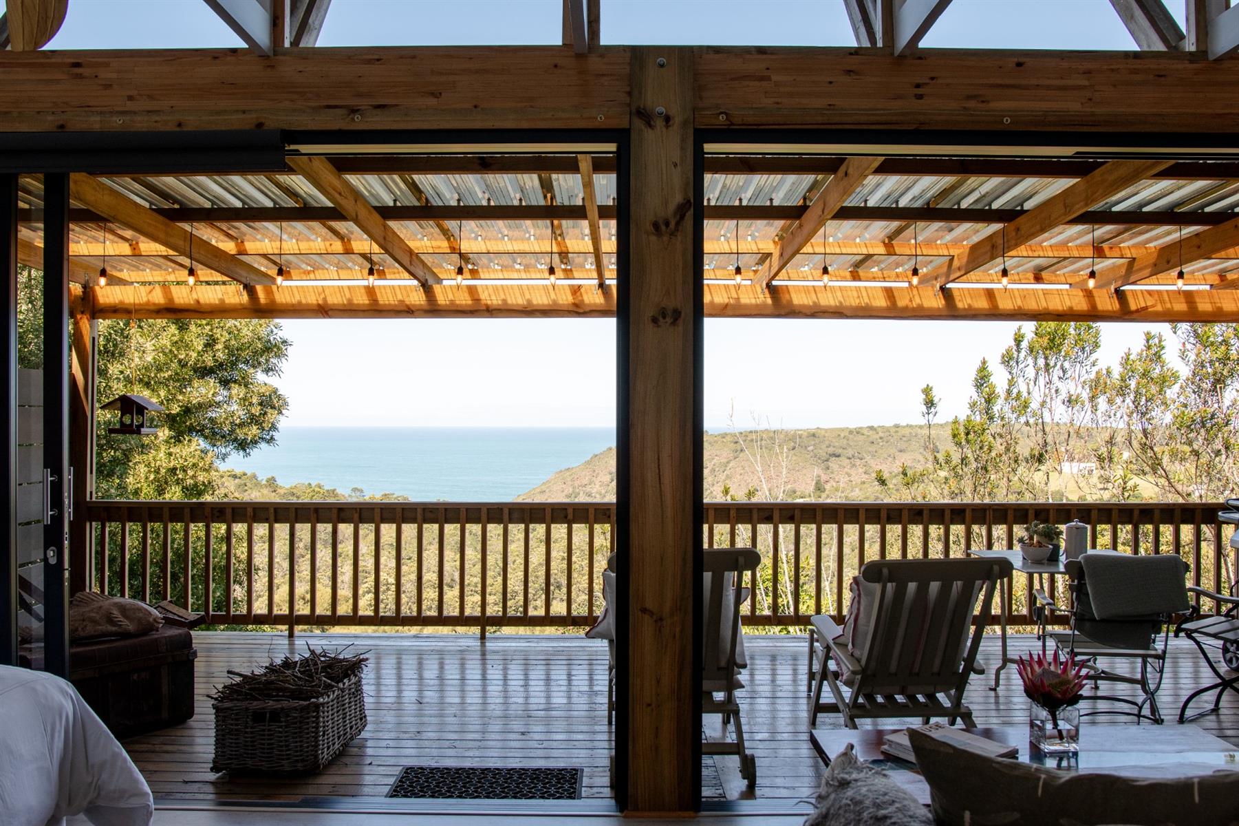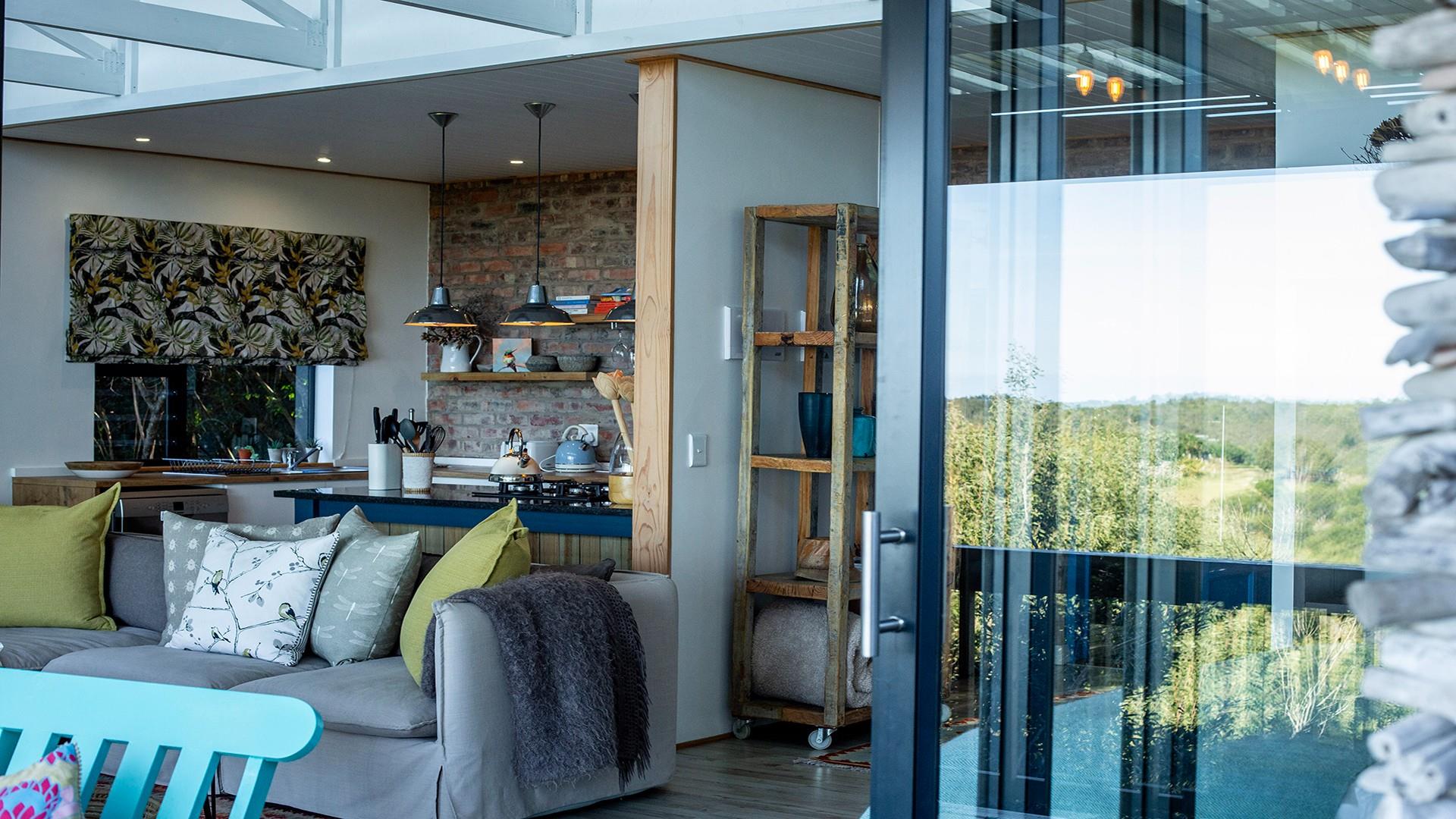 Open-plan kitchen, lounge, and living area flowing seamlessly to a covered wooden deck with panoramic ocean views