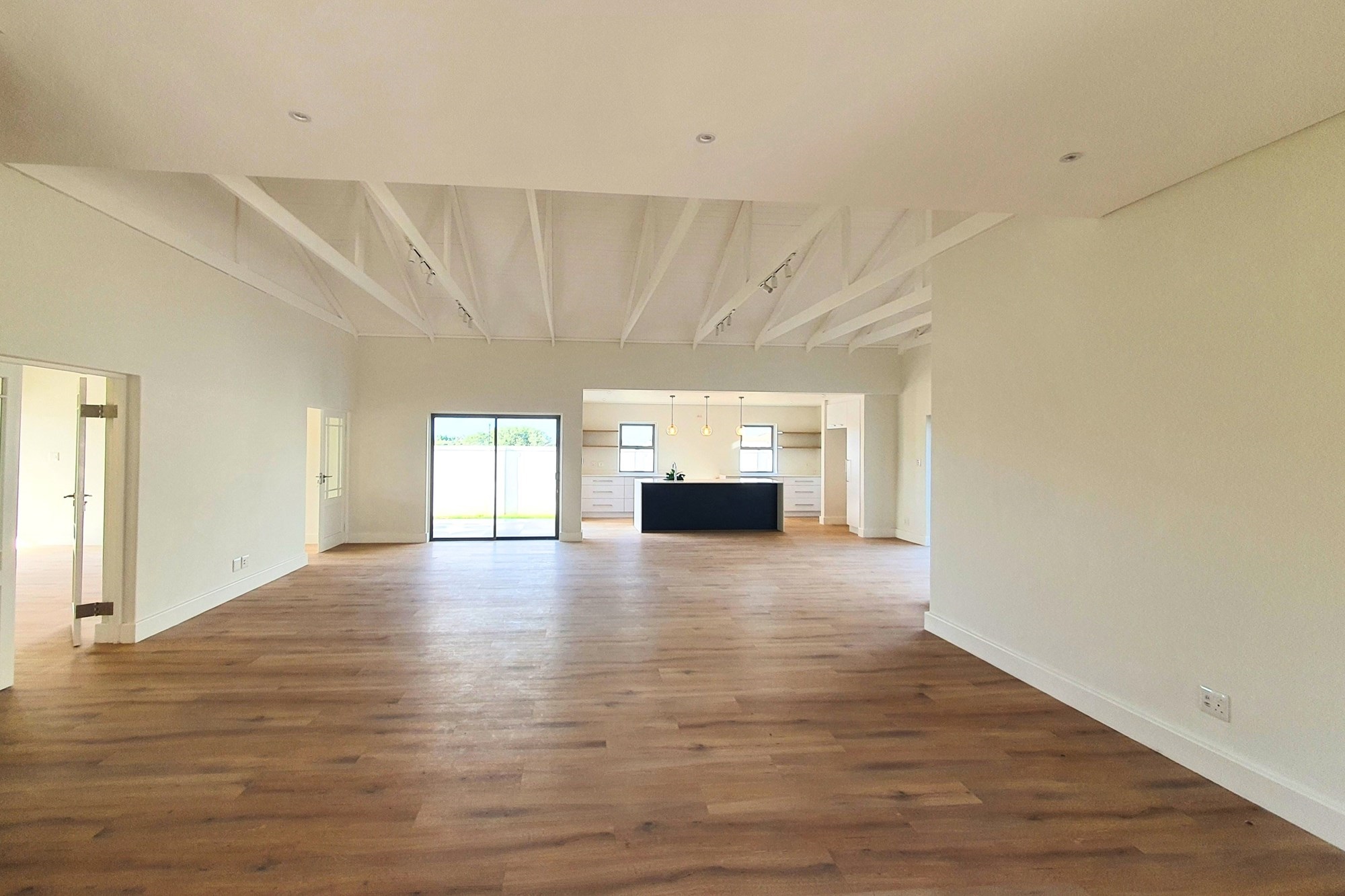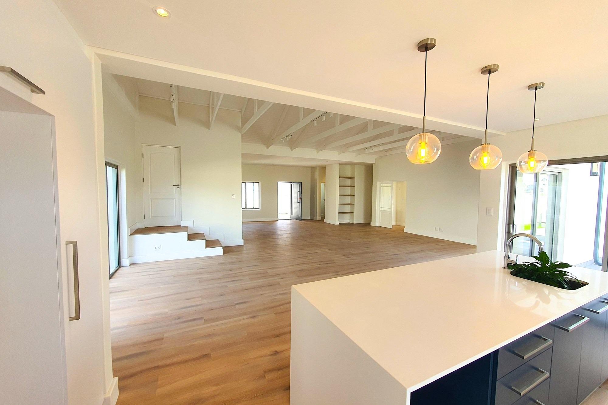 From the moment you step inside, you’re welcomed by open-plan spaces under high-beam ceilings and exposed trusses that create a bright, airy atmosphere that seamlessly connects the designer kitchen, dining, and lounge areas to an enclosed indoor entertainment room. The gourmet kitchen is a chef`s dream, featuring a 900mm SMEG oven, gas hob, polished chrome finishes, a central island with stone countertops, and a tucked-away scullery designed for a neat and elegant cooking environment.