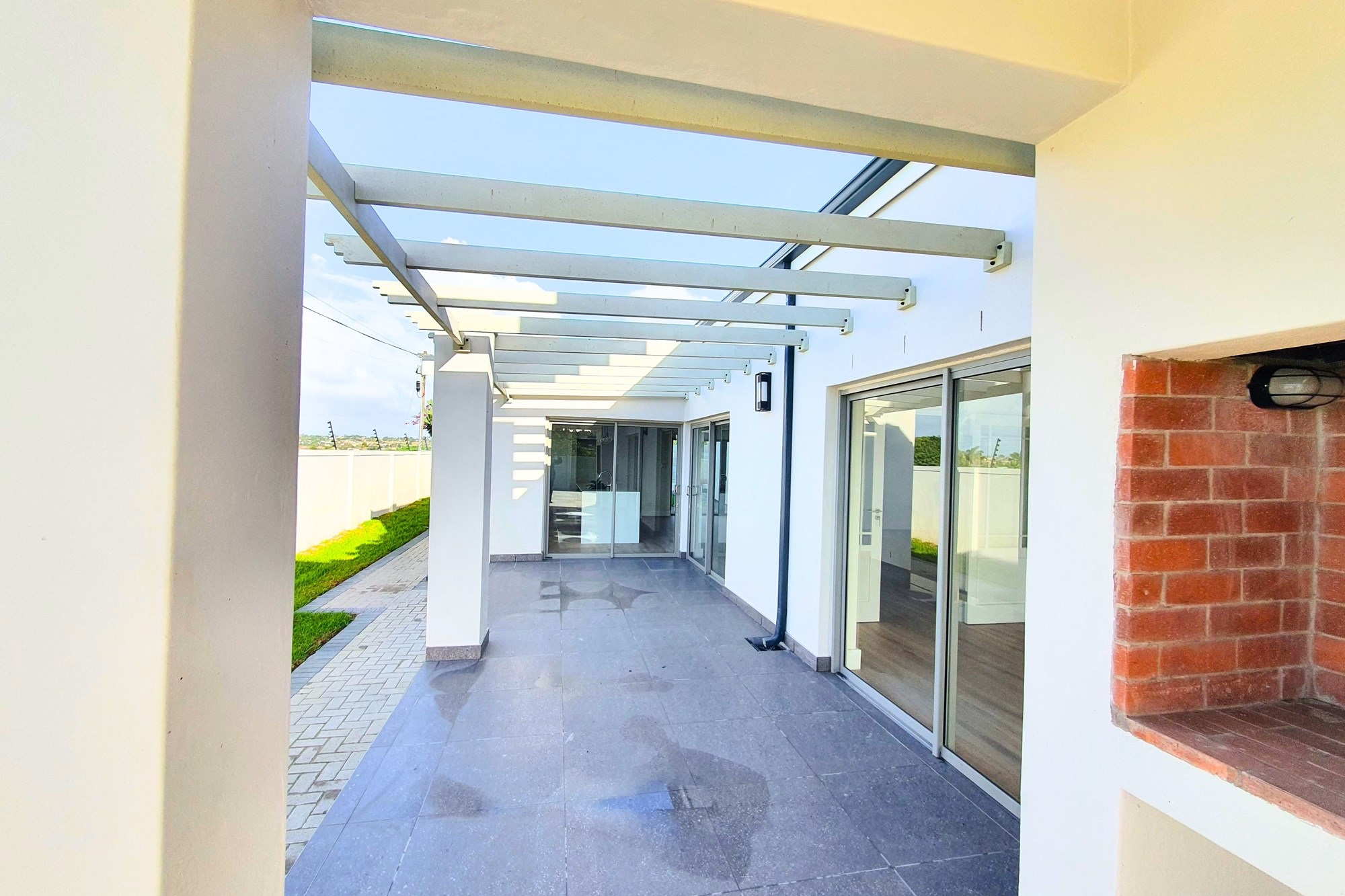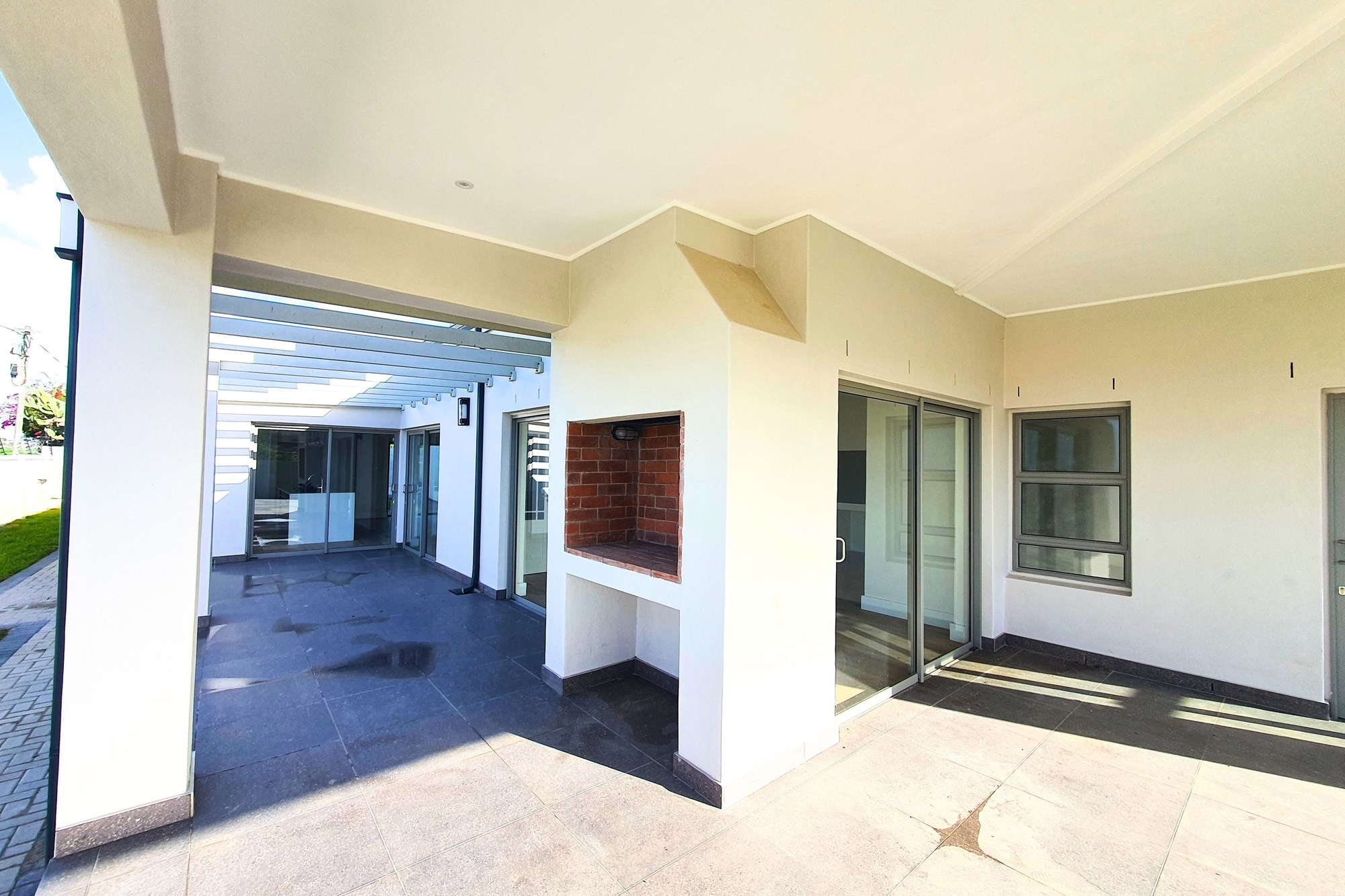 The living and dining areas flow effortlessly into an enclosed entertainment room, which extends to a covered patio featuring a built-in braai and a stylish pergola with mountain views - perfect for relaxed evenings or festive entertaining.