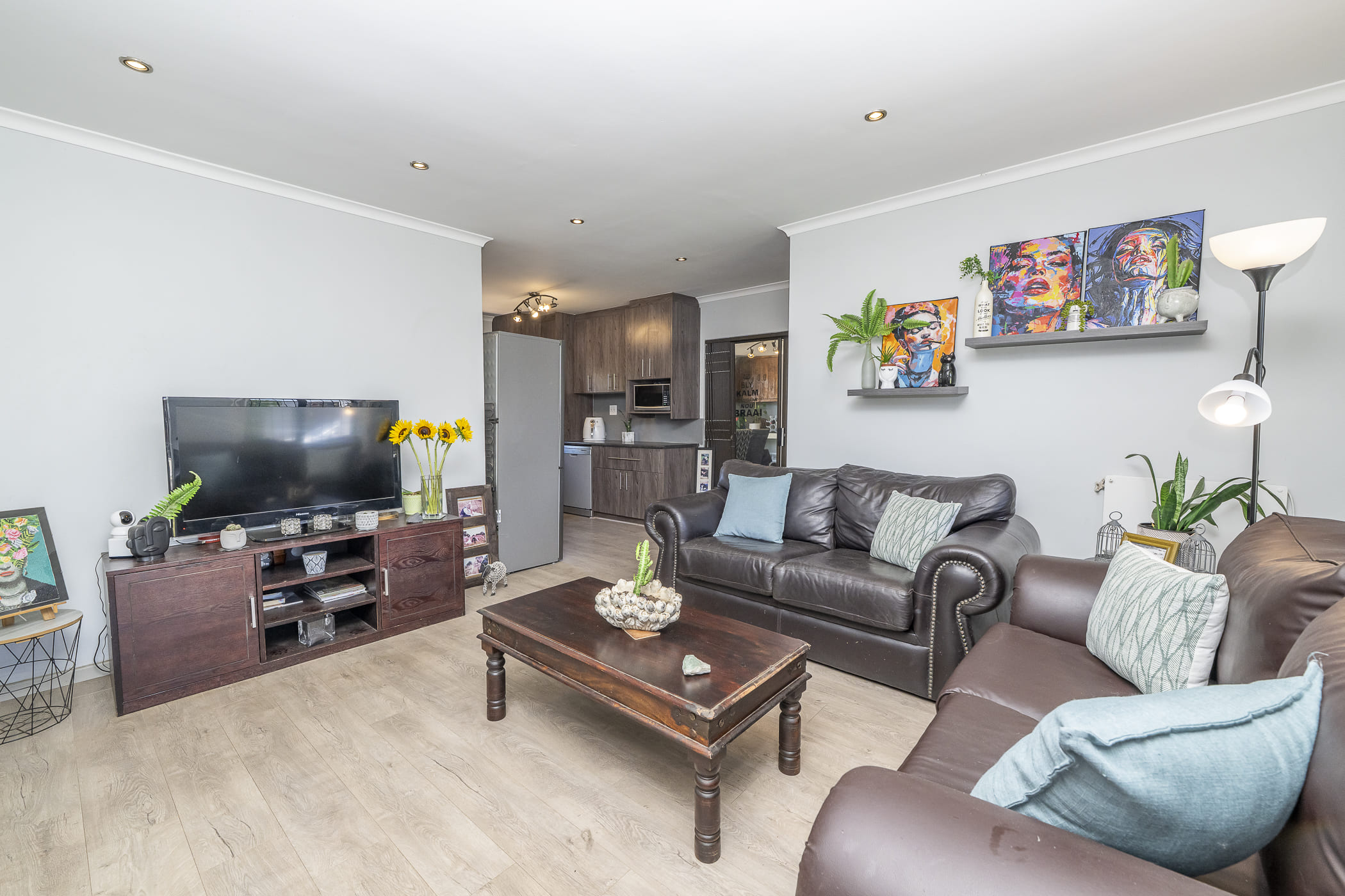 The property is beautifully maintained and offers a fresh, modern atmosphere throughout. The light-filled lounge flows seamlessly into a stylish, well-equipped kitchen featuring ample built-in cupboards, a water point, double basin, oven, hob, and extractor fan—perfect for everyday living and hosting guests.