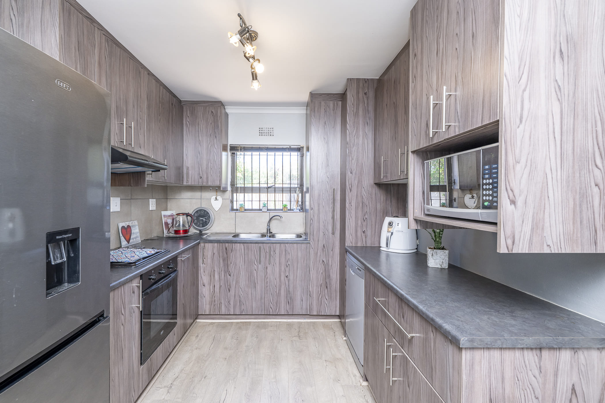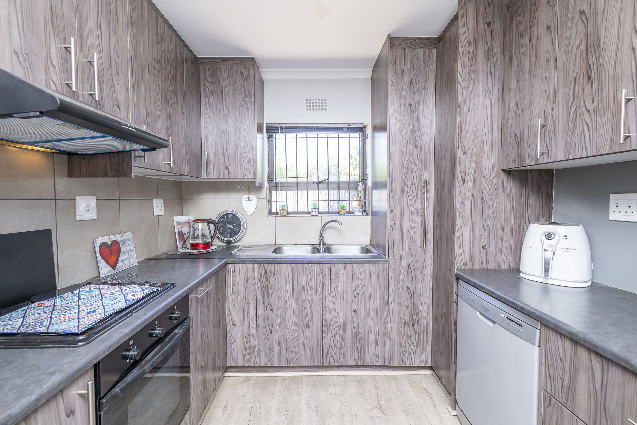 Parking is secure and convenient with a double garage and additional driveway space. For peace of mind, all windows are fitted with burglar bars, all doors have security gates, and the home is equipped with an alarm system.