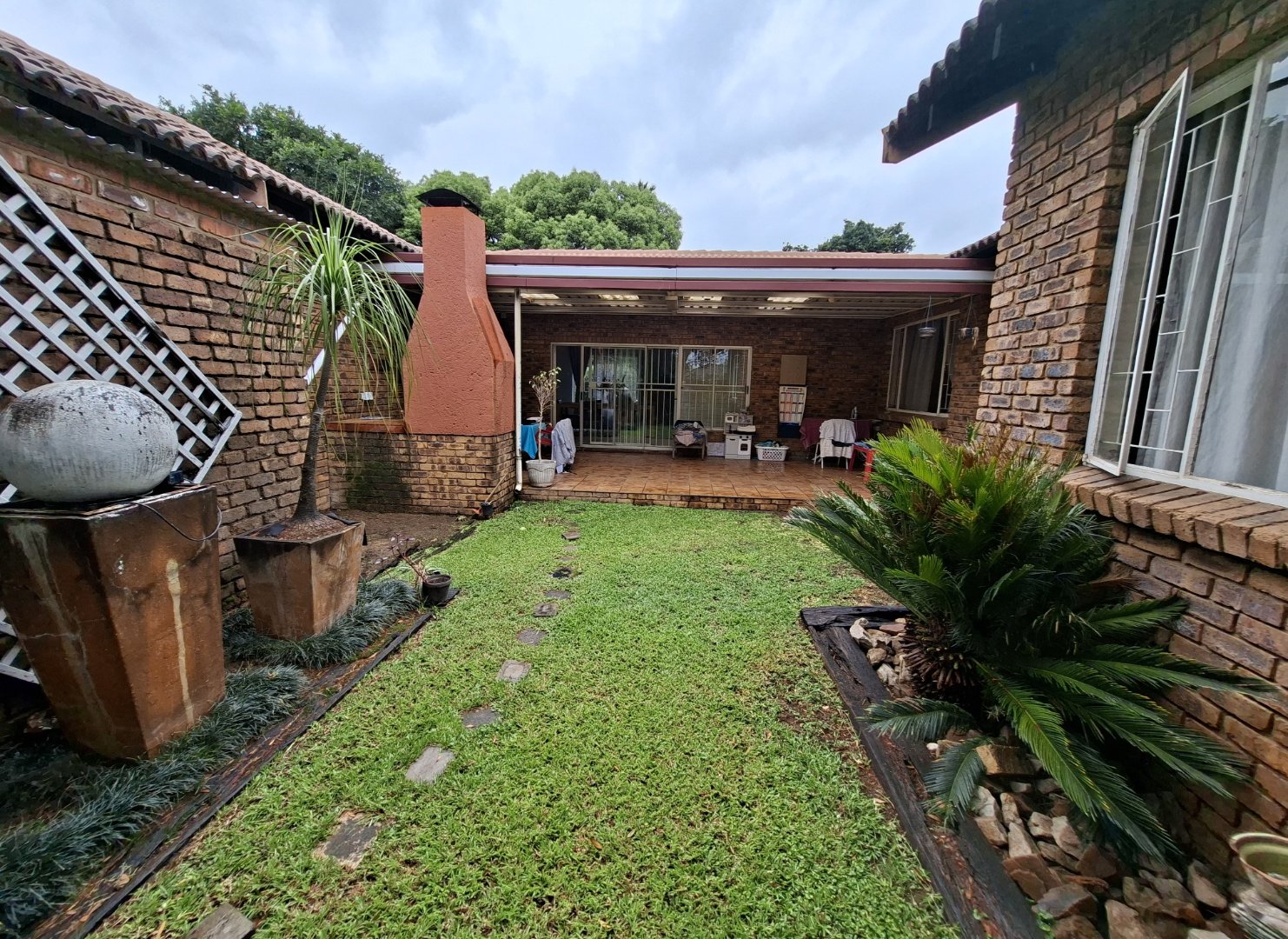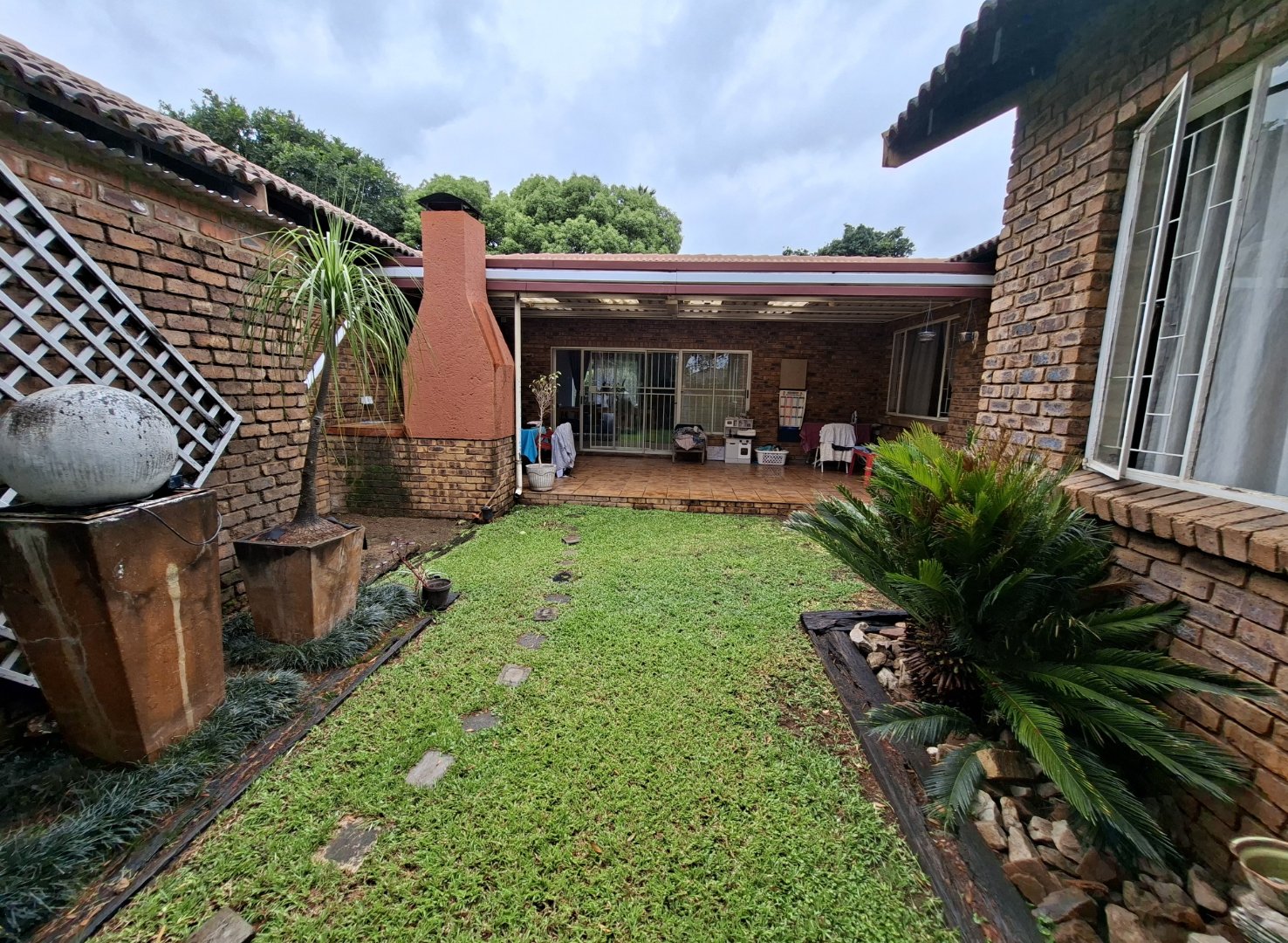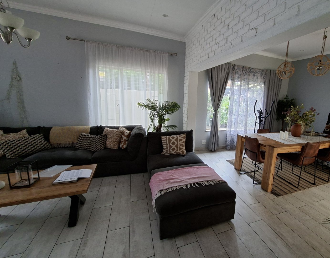 Open-plan dining room and lounge leading to a charming patio/courtyard with a braai area