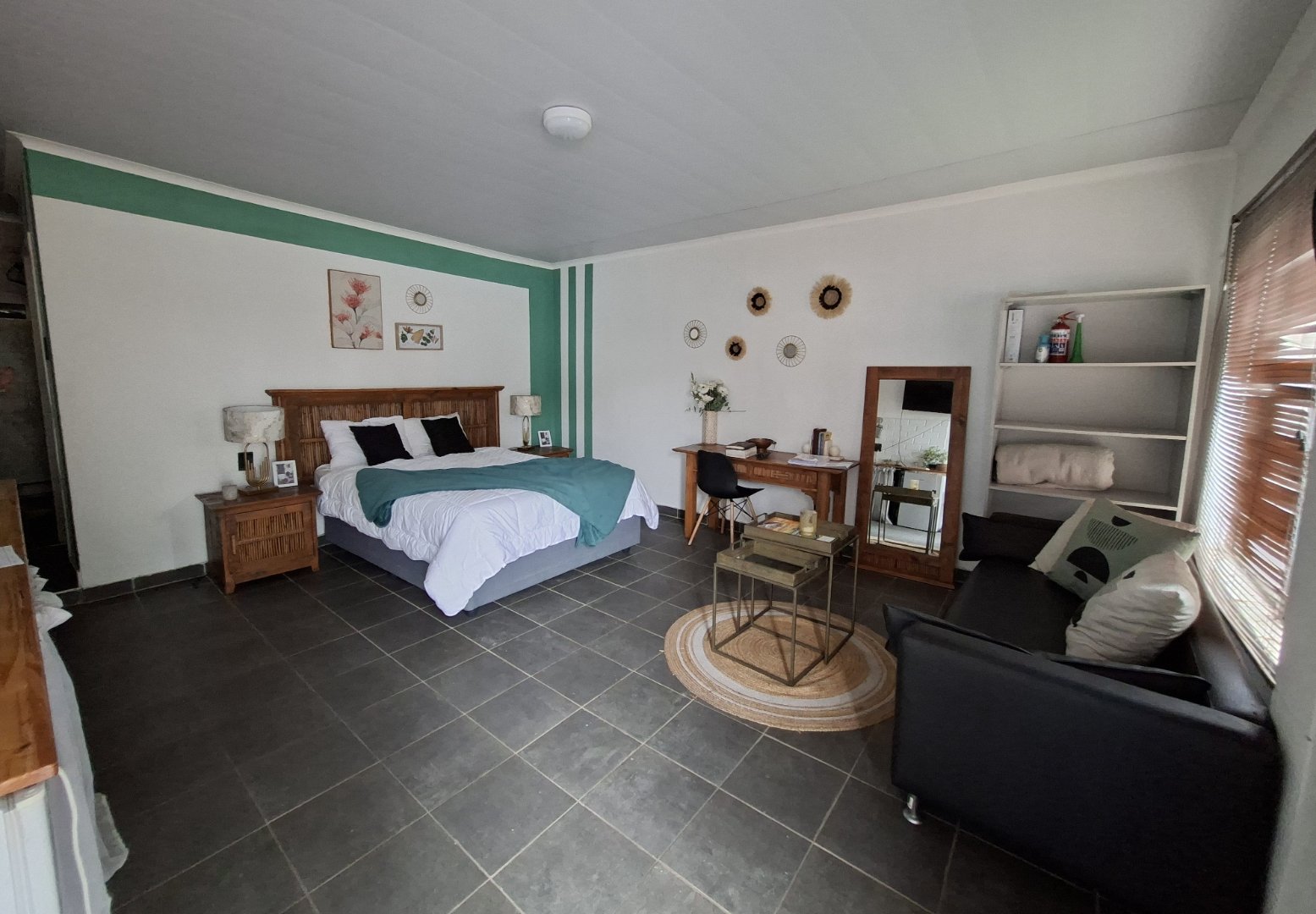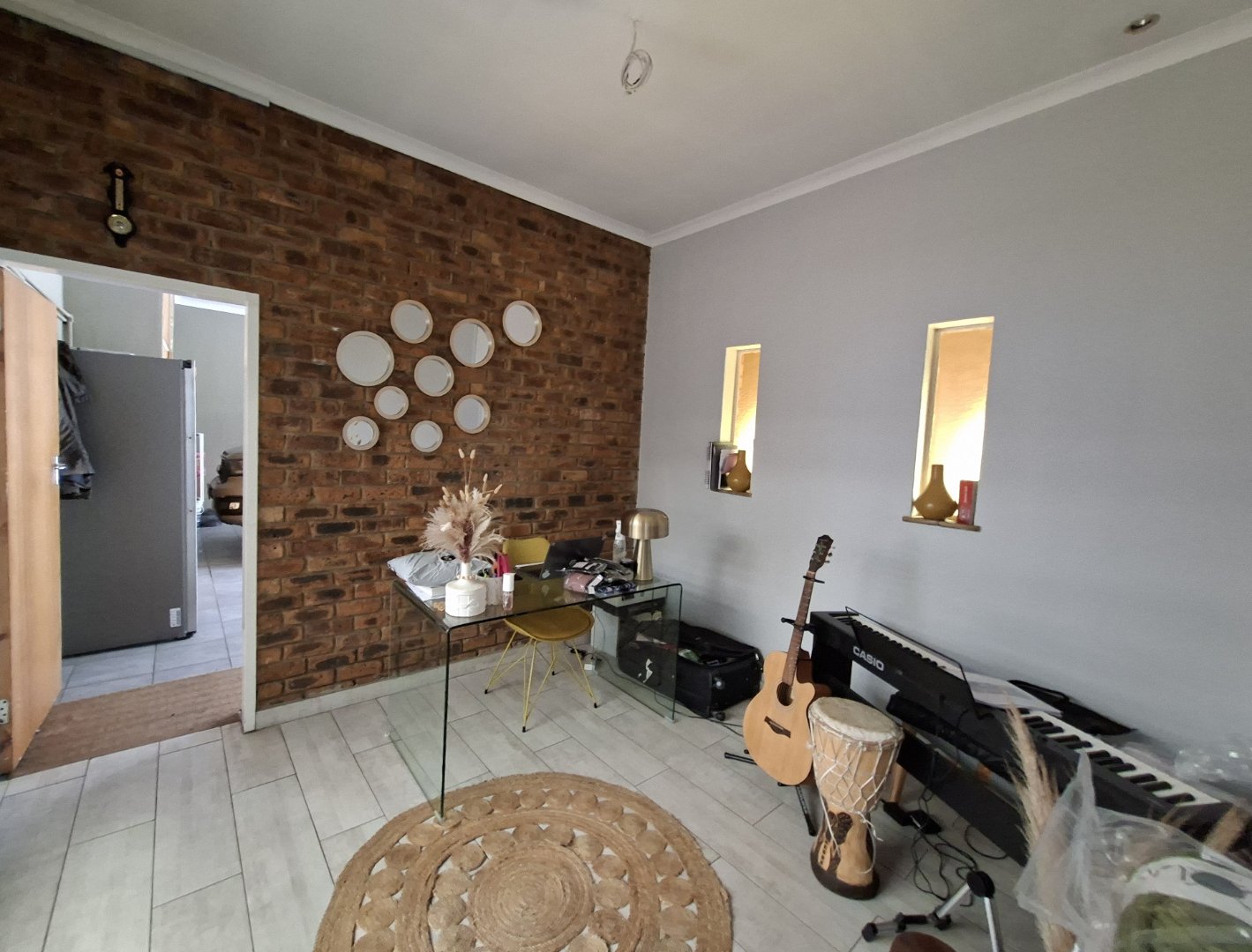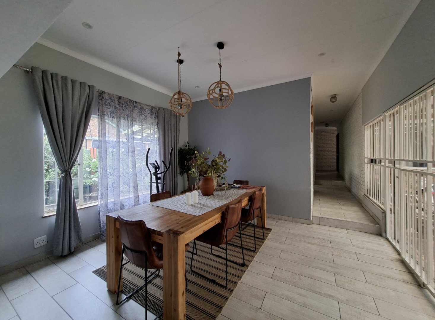 Open-plan dining room and lounge leading to a charming patio/courtyard with a braai area