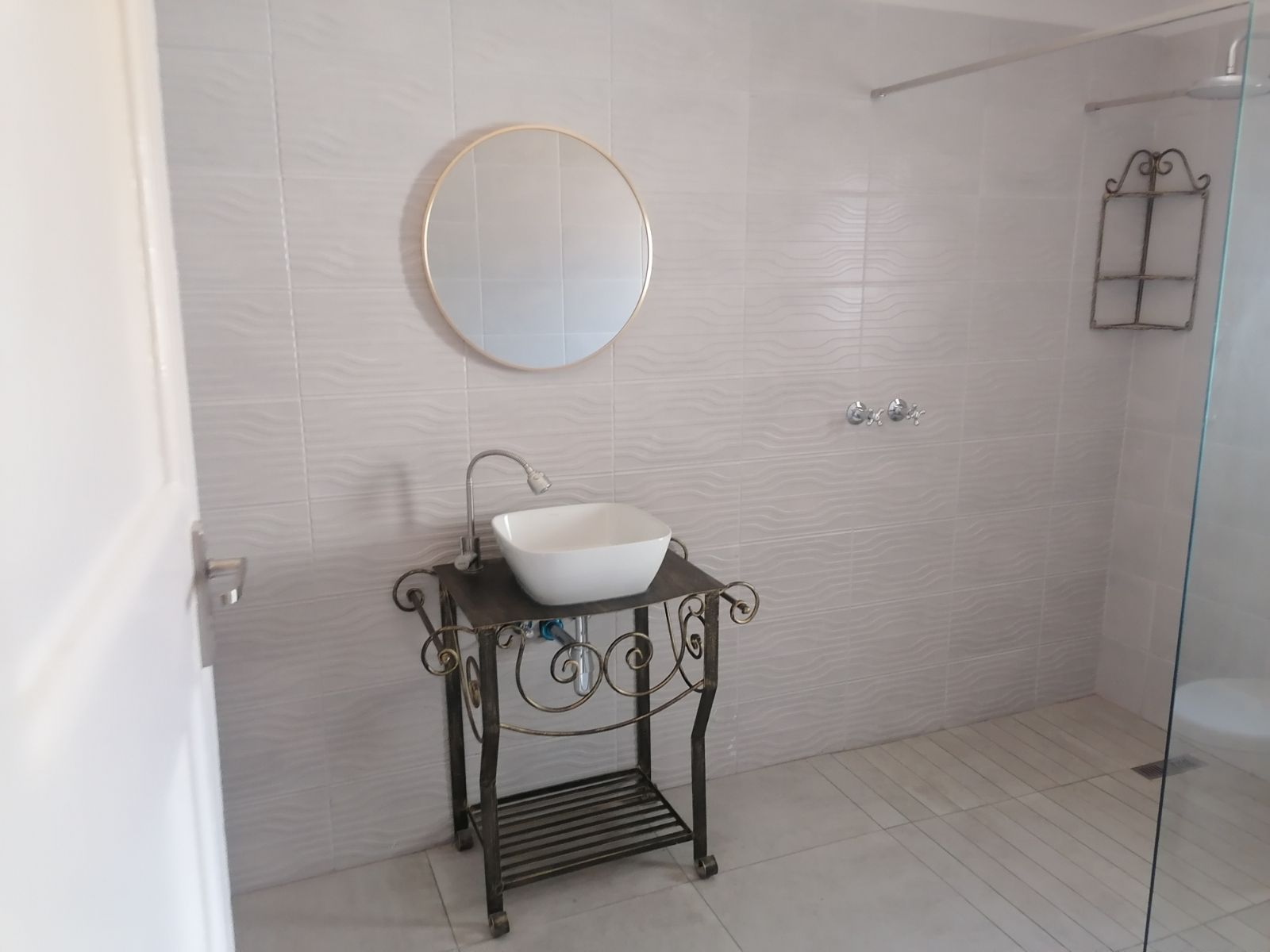 From the kitchen, a well-designed hallway leads to two modern, newly renovated bathrooms, each fitted with stylish baths, showers, toilets, and basins. An additional guest bathroom ensures comfort and privacy for visitors.
