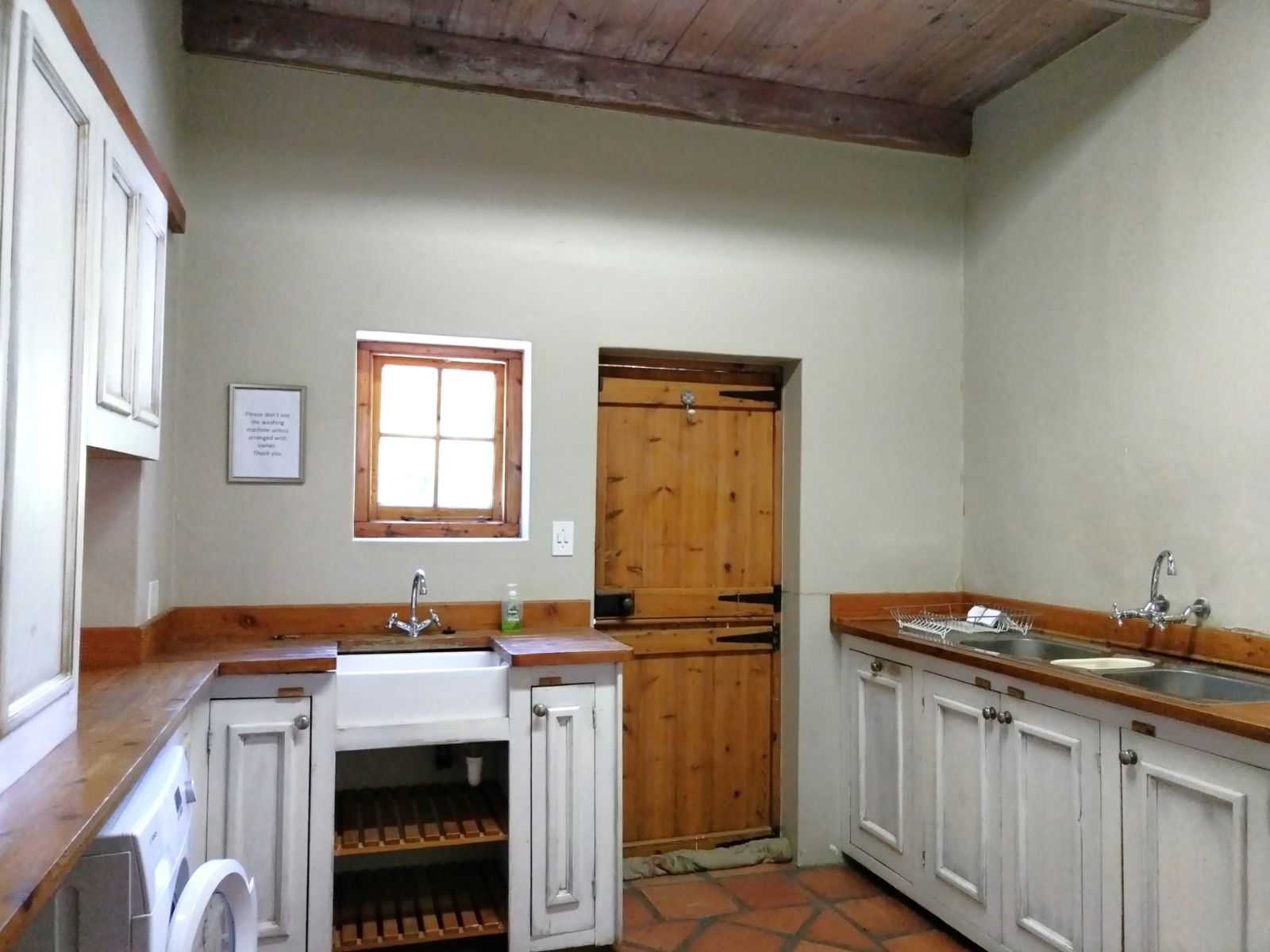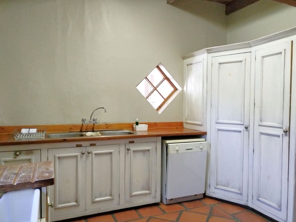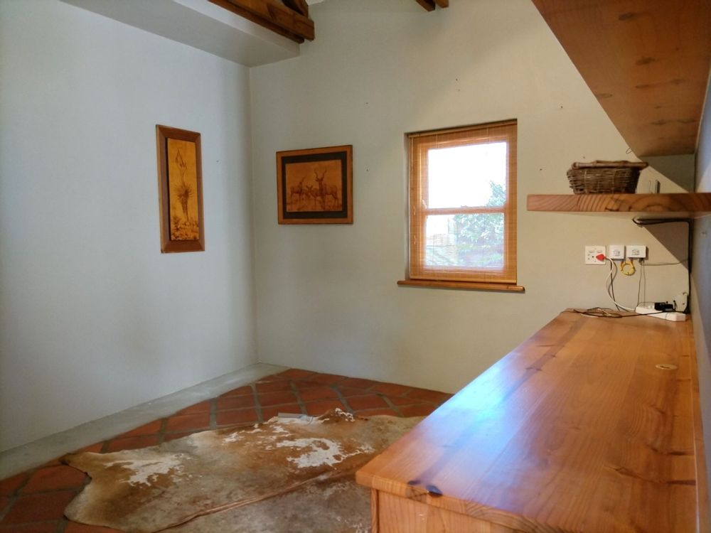 The country style kitchen with its double volume and exposed beams lends the sense of spaciousness. The scullery and laundry blends in well with the charm of the kitchen and offers ample storage space. The media room, complete with a fireplace, is strategically positioned to the kitchen, fostering a seamless blend of family gatherings and culinary activities. In addition, a built in braai area adjacent to the kitchen makes this a practical area for informal entertainment.