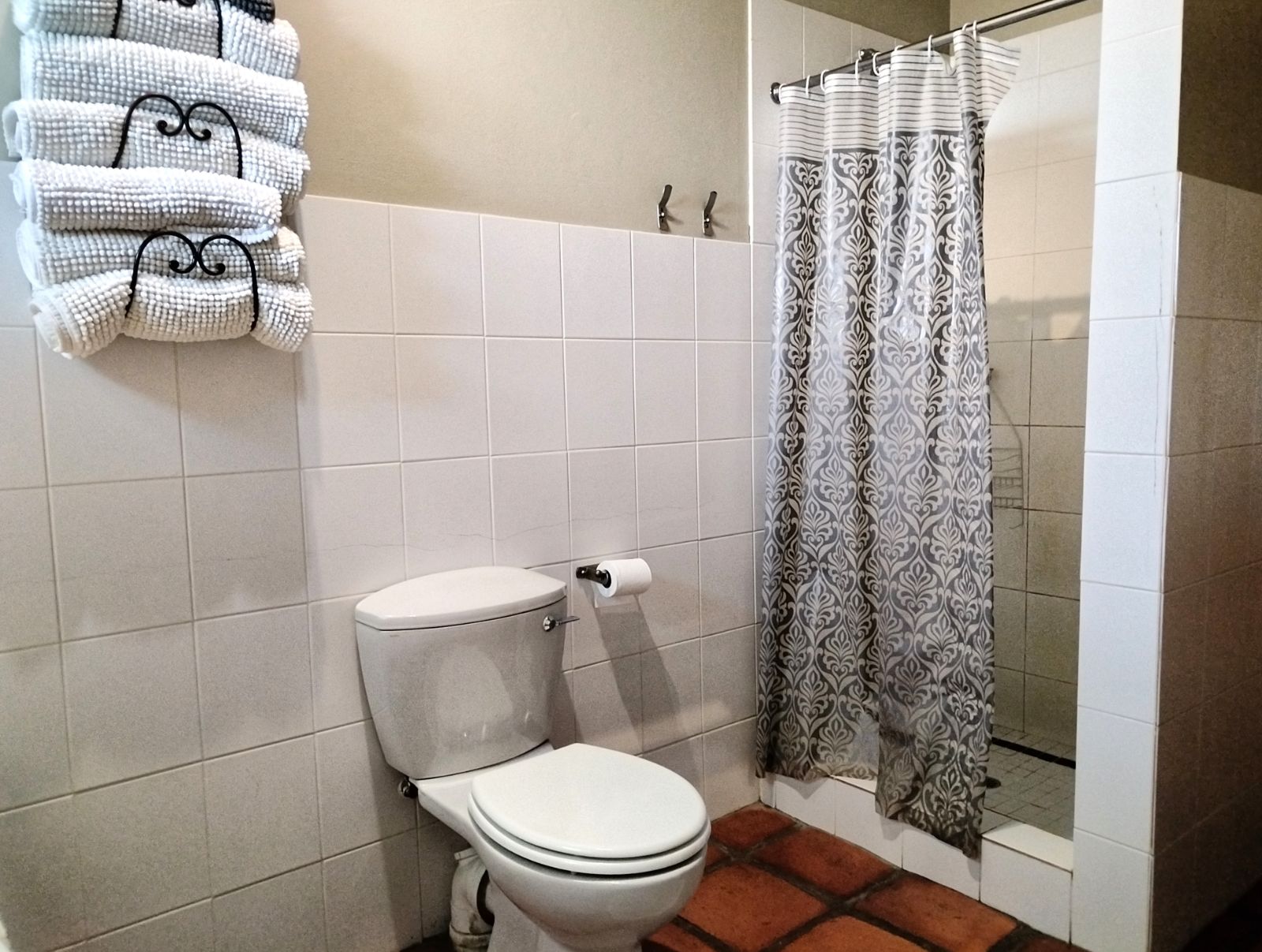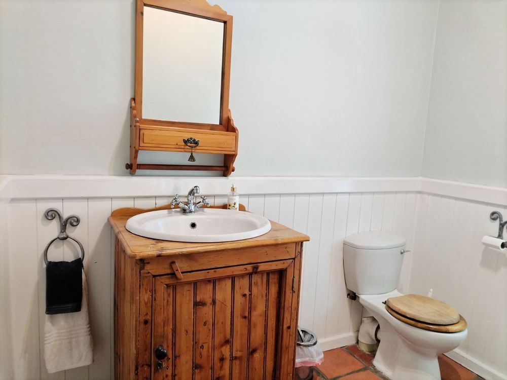 Three generous bedrooms with main en-suite. All bedrooms have built in cupboards. The family bathroom with terracotta tiles offers a bath, shower, loo and basin.