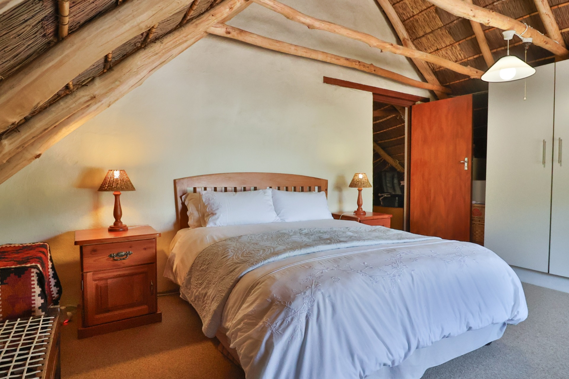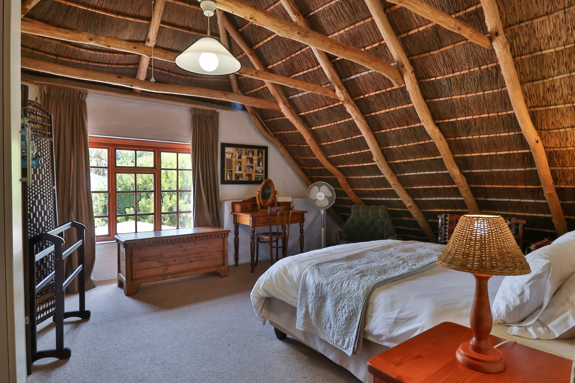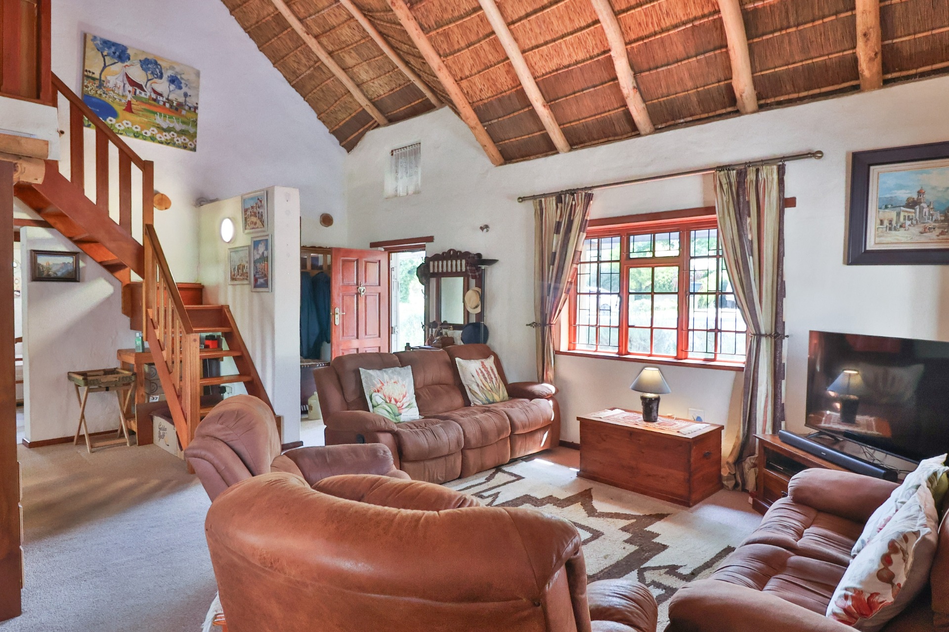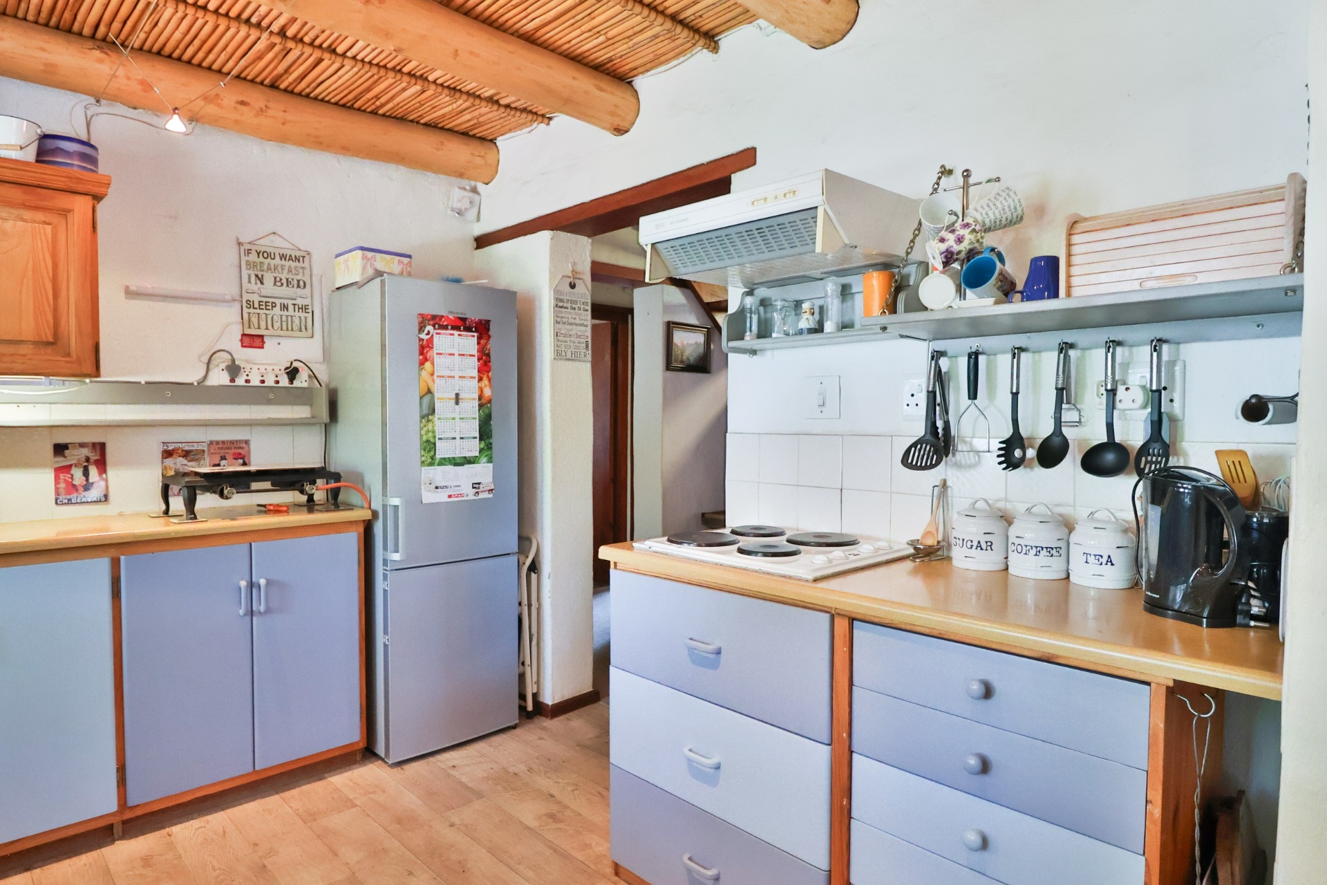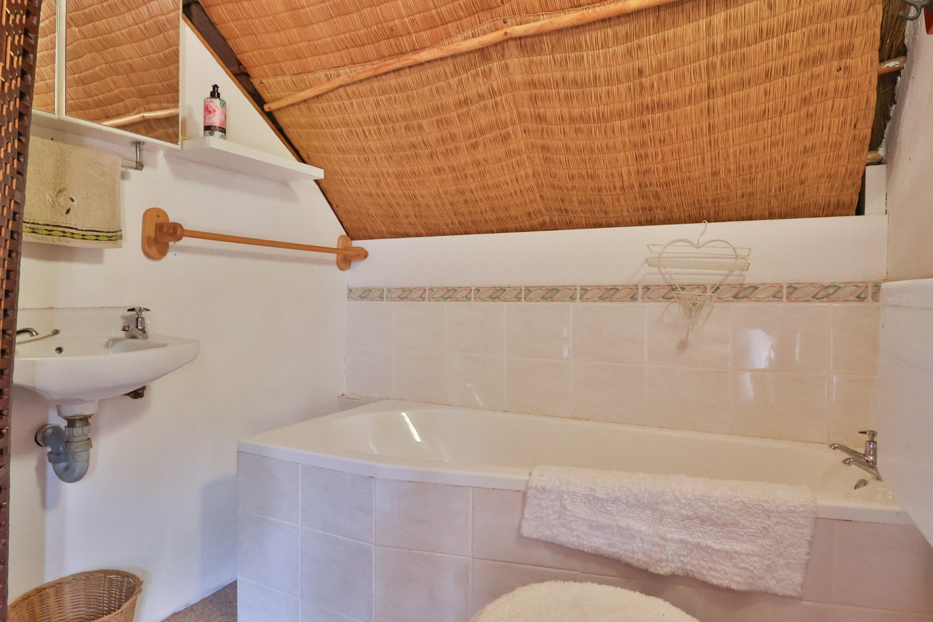 The downstairs area features an open-plan lounge and dining room with a beautiful thatch loft ceiling, creating a warm, welcoming space. The country-style kitchen, while compact, exudes charm and functionality. A cozy bar area opens via double wooden doors to the back garden, ideal for entertaining or simply enjoying the outdoors. The cottage-style wooden windows add to the character of the home, enhancing the connection to the natural surroundings.