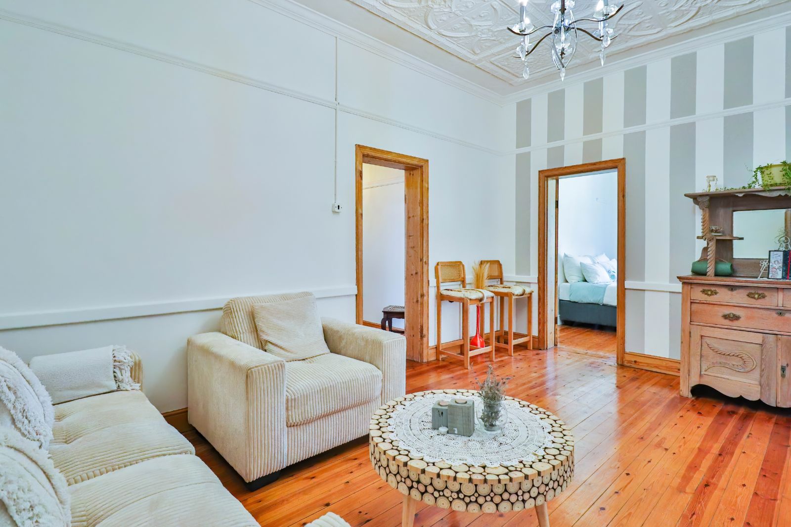 Next you’ll find the elegant living area / TV room with the pressed metal ceiling and wooden floors. Off the lounge to the right is a smaller bedroom with built in cupboards, wooden floors and wooden ceiling. This is ideal for a guest bedroom.