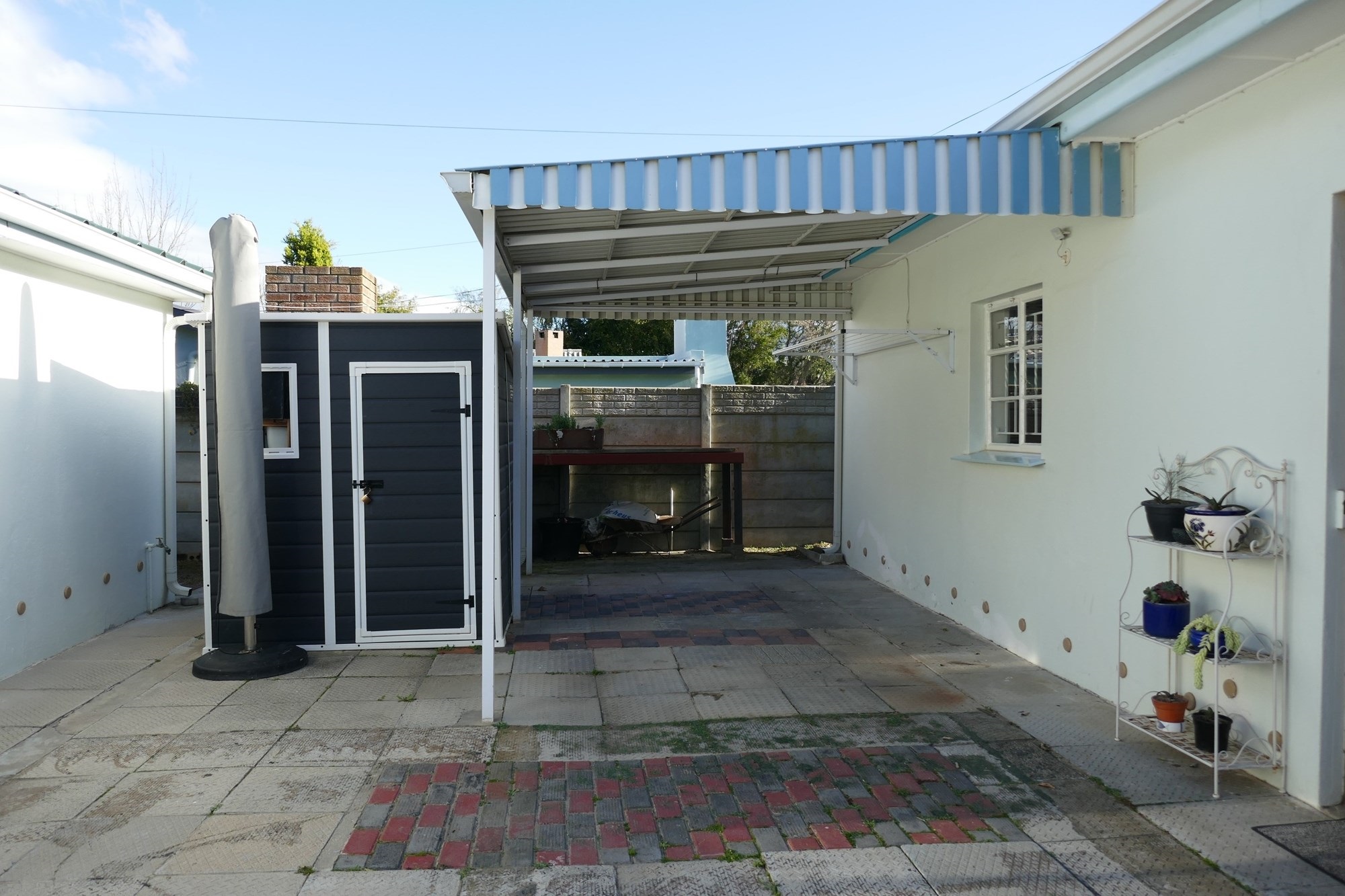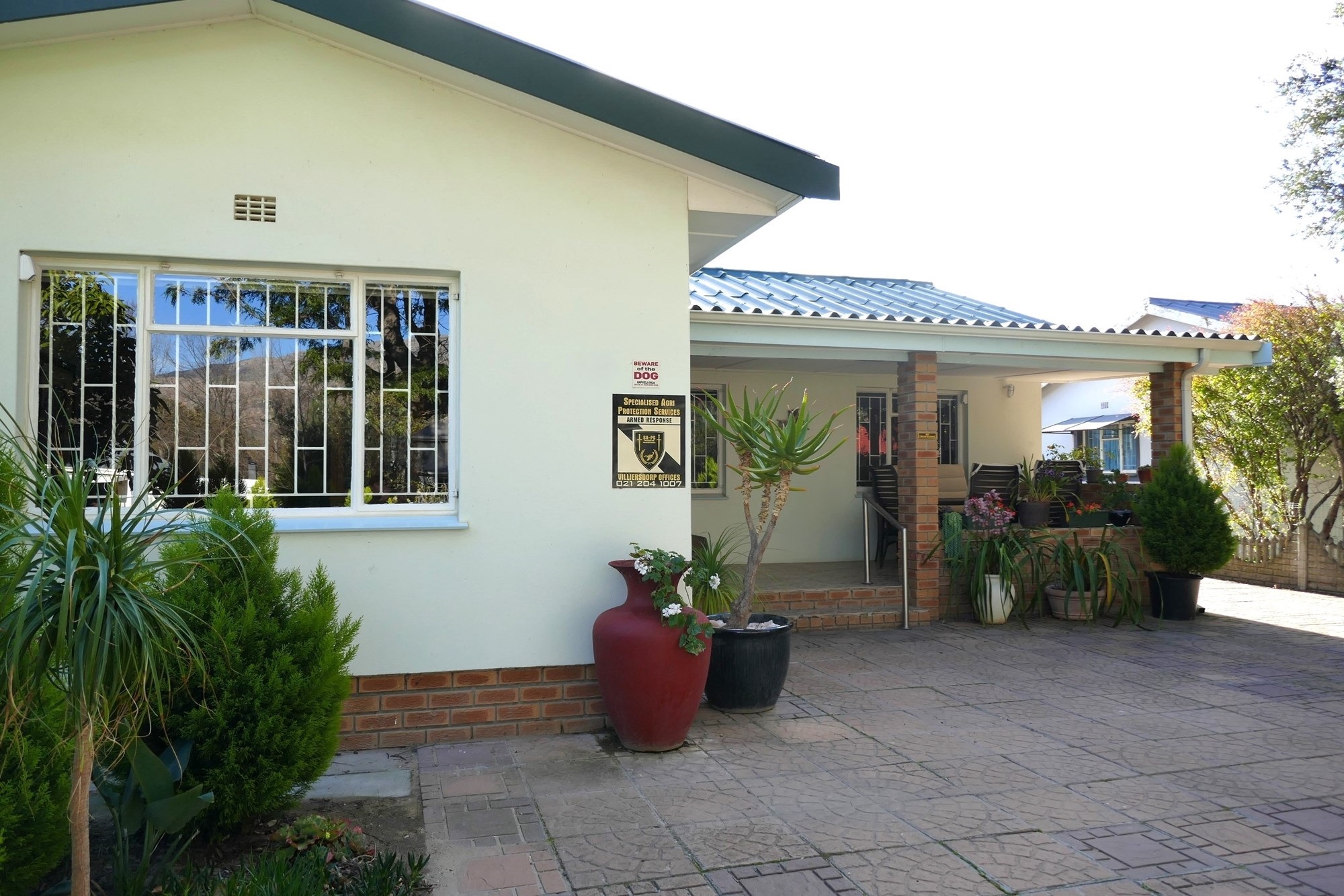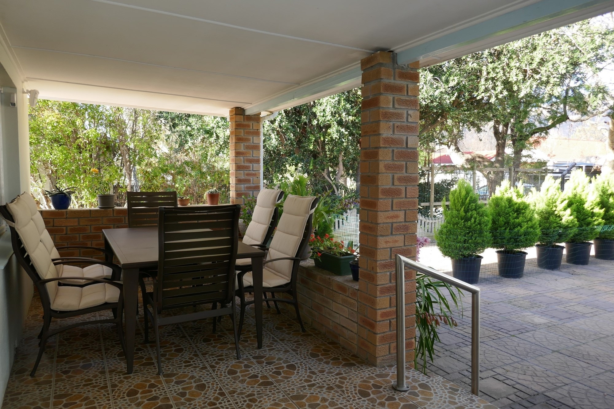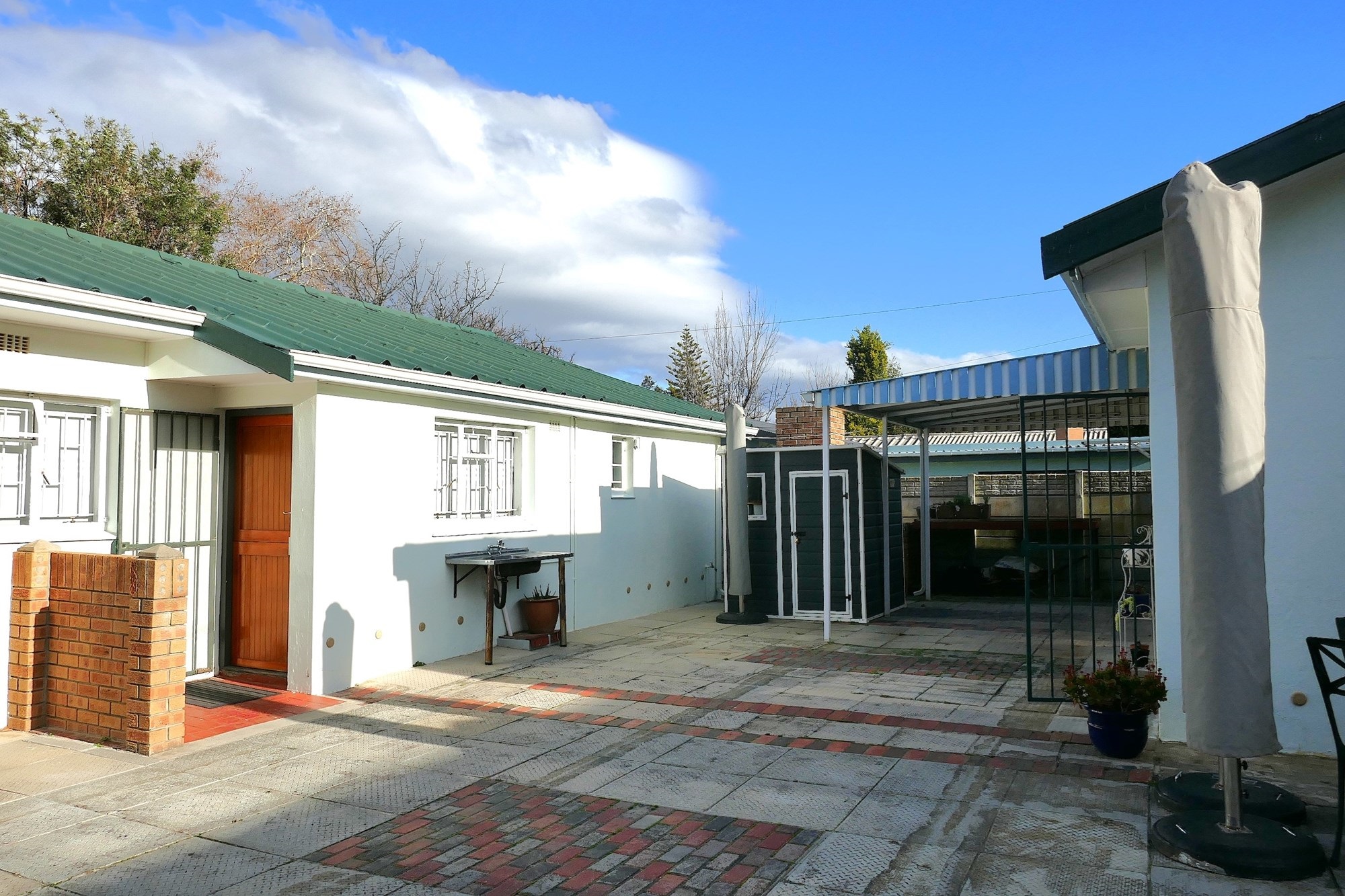 Outdoor living is equally appealing, with a covered verandah overlooking the established garden, supported by an efficient irrigation system. Paved outdoor areas include a private back courtyard with a built-in braai, creating an inviting space for entertaining or quiet relaxation. Parking is well catered for with tandem off-street parking for up to six vehicles, a single carport, and the added benefit of a reliable security system with alarm and beams for peace of mind.