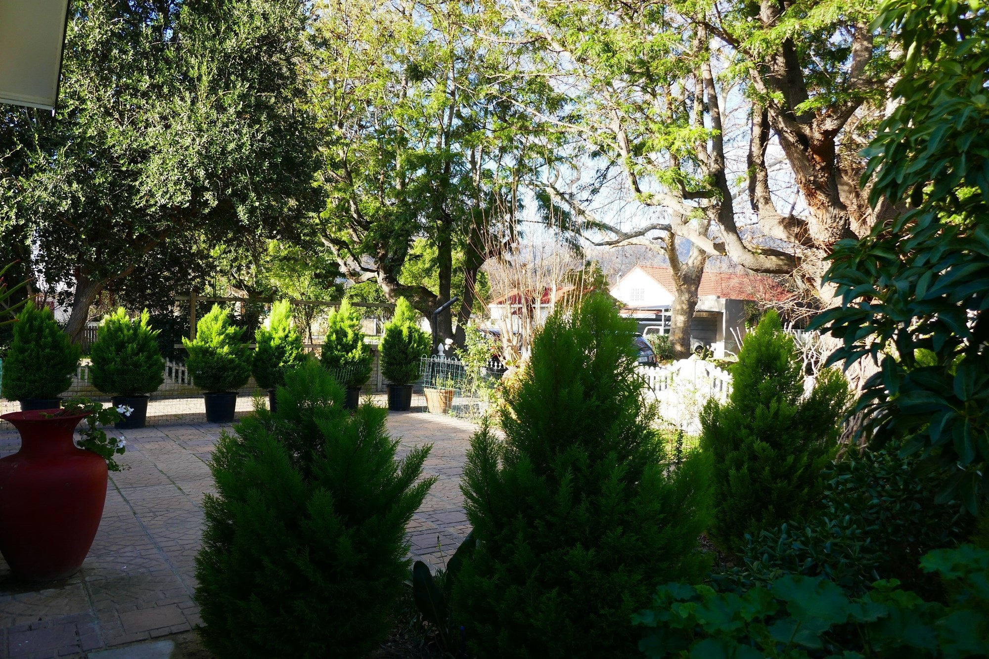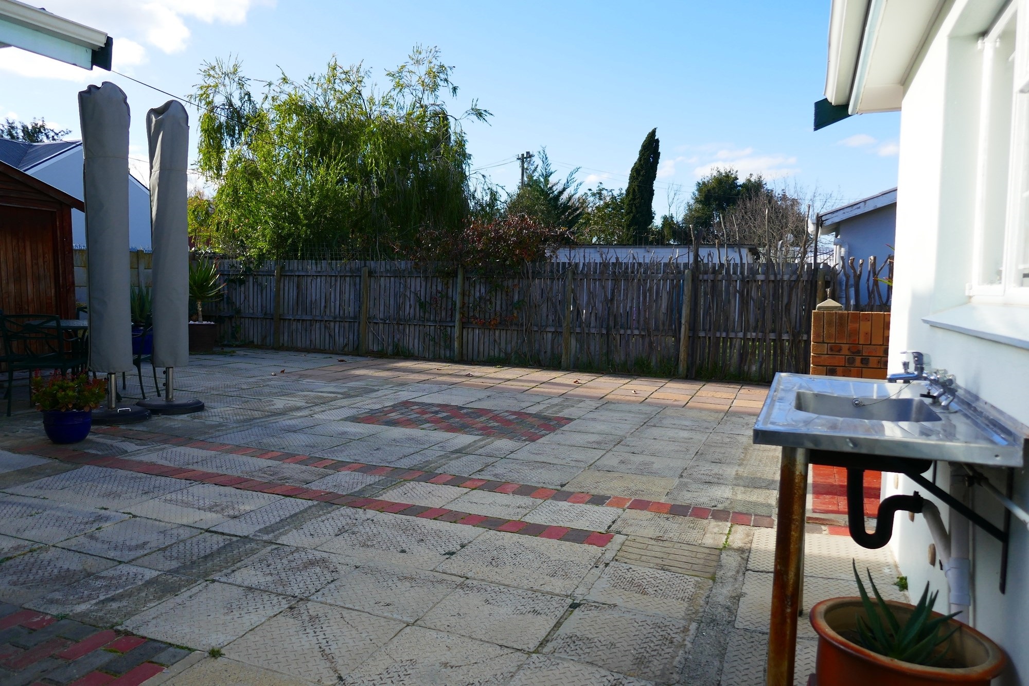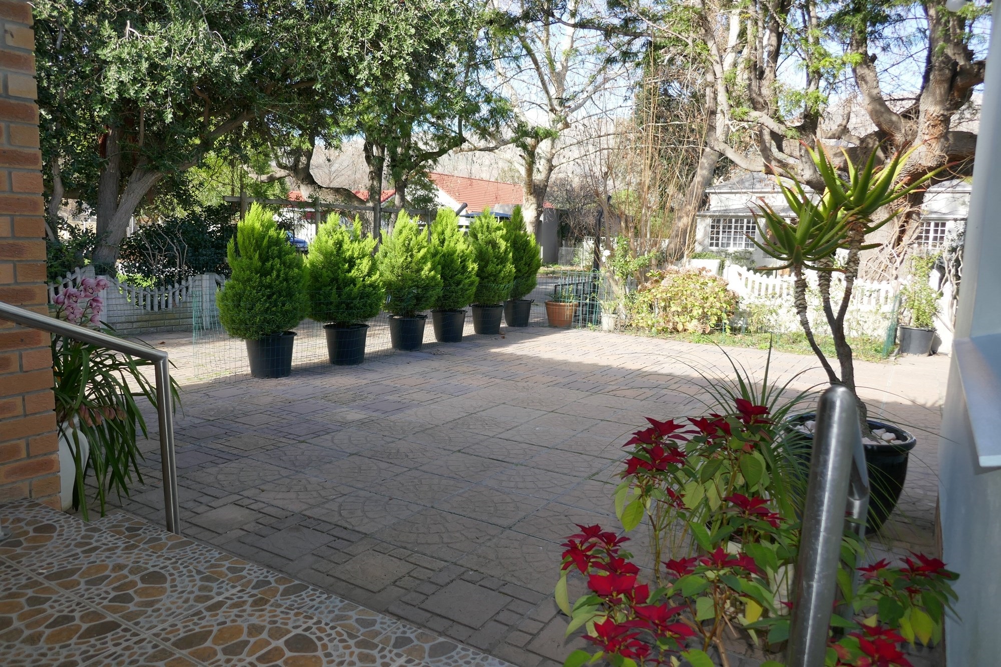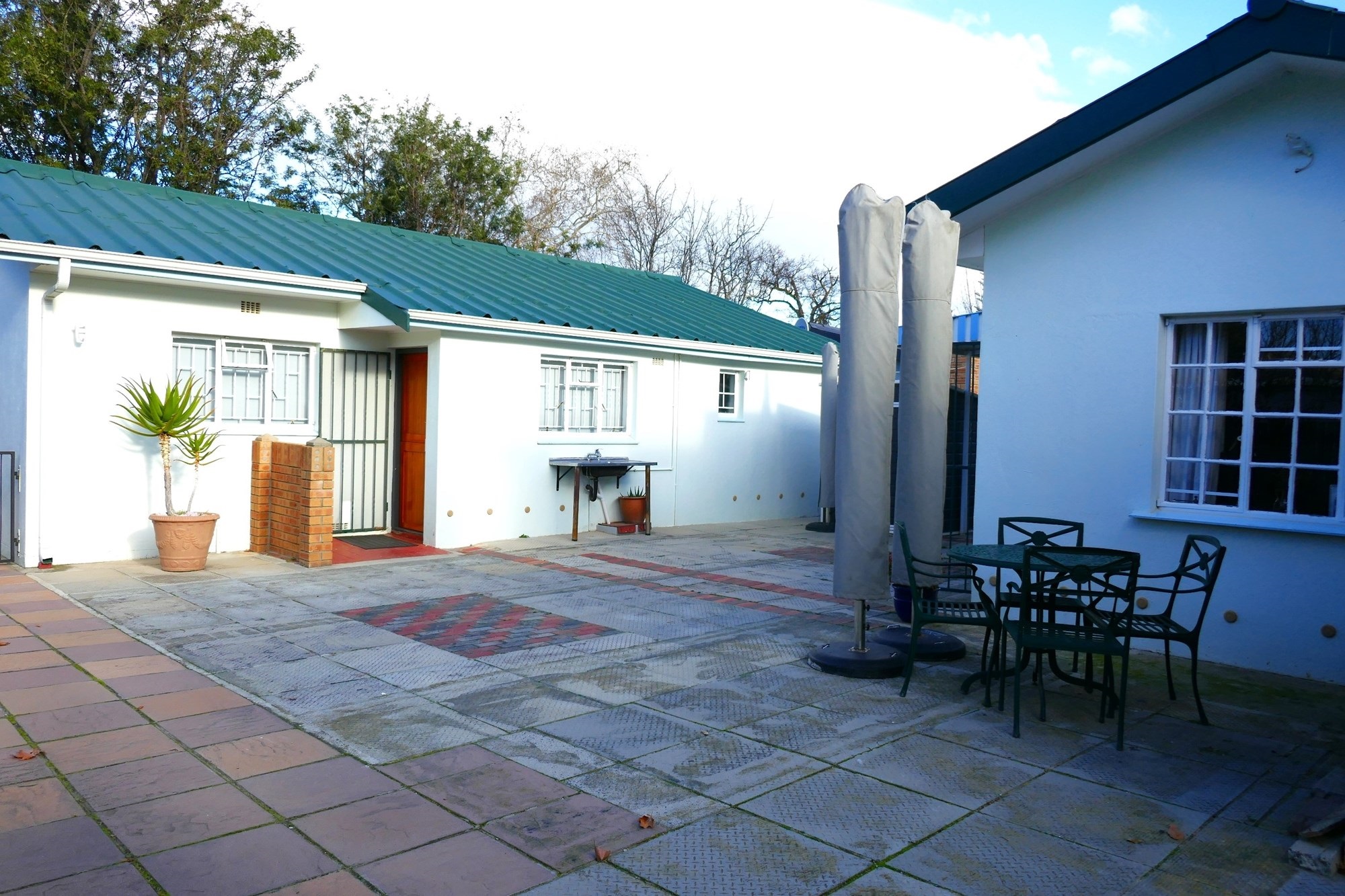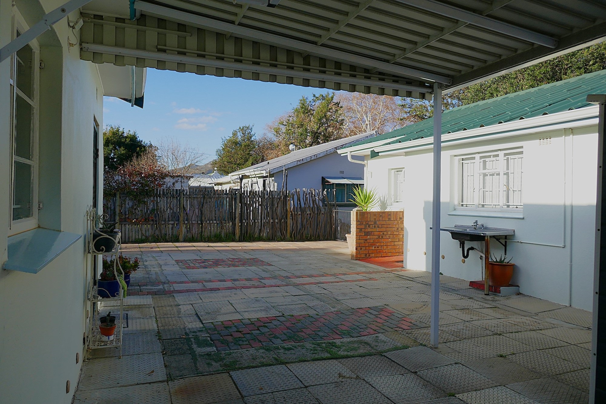 Outdoor living is equally appealing, with a covered verandah overlooking the established garden, supported by an efficient irrigation system. Paved outdoor areas include a private back courtyard with a built-in braai, creating an inviting space for entertaining or quiet relaxation. Parking is well catered for with tandem off-street parking for up to six vehicles, a single carport, and the added benefit of a reliable security system with alarm and beams for peace of mind.