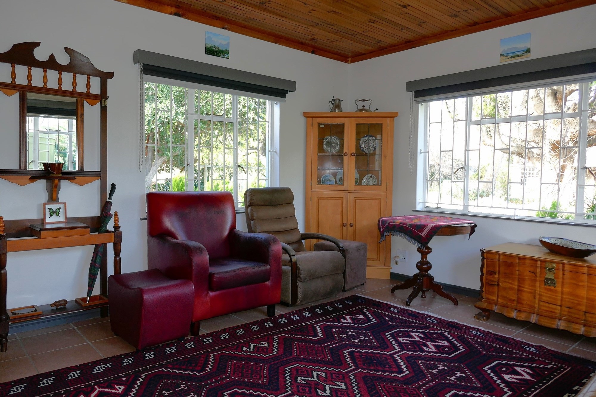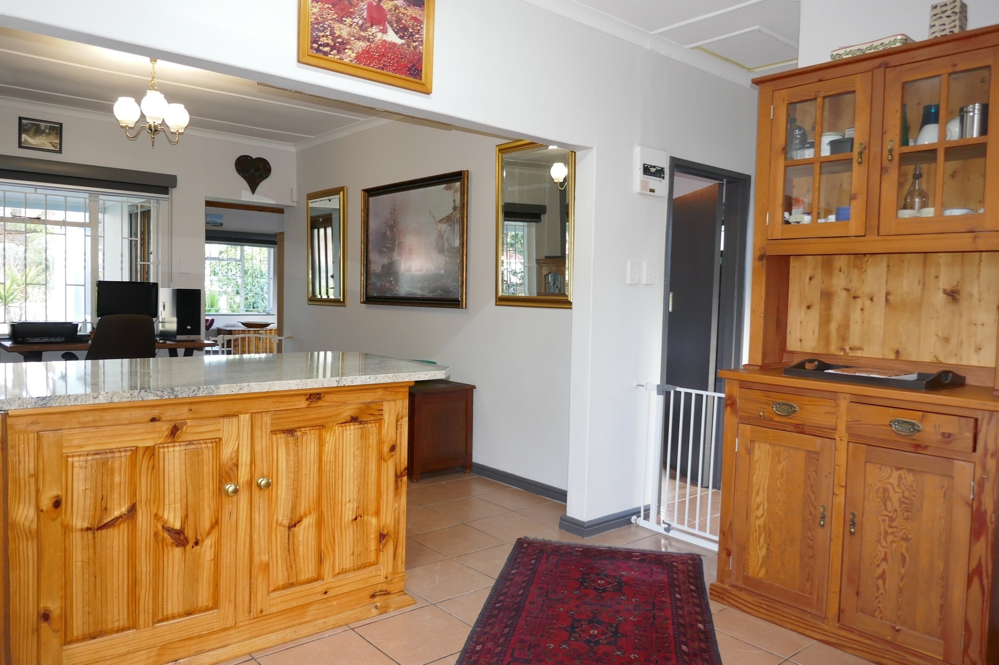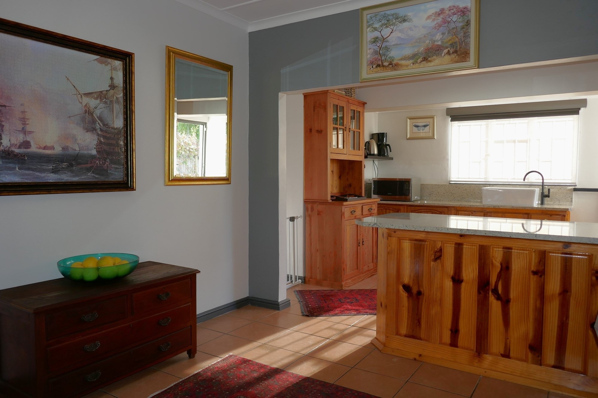 The main house features a warm and functional layout with tiled floors throughout, a spacious living area flowing effortlessly into the dining room, and a refurbished open-plan kitchen fitted with granite countertops. A separate scullery/laundry adds further practicality. Accommodation includes two bedrooms, with air-conditioning in the main bedroom, and an upgraded bathroom with shower and a separate toilet.
