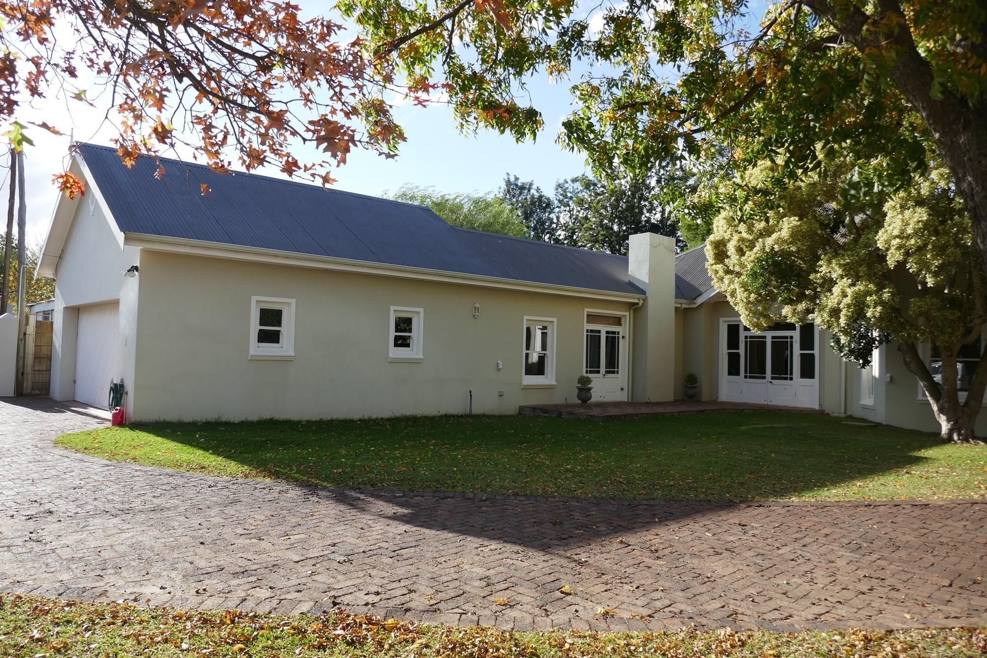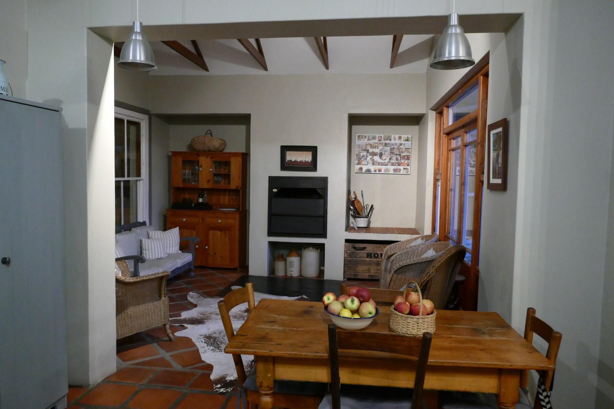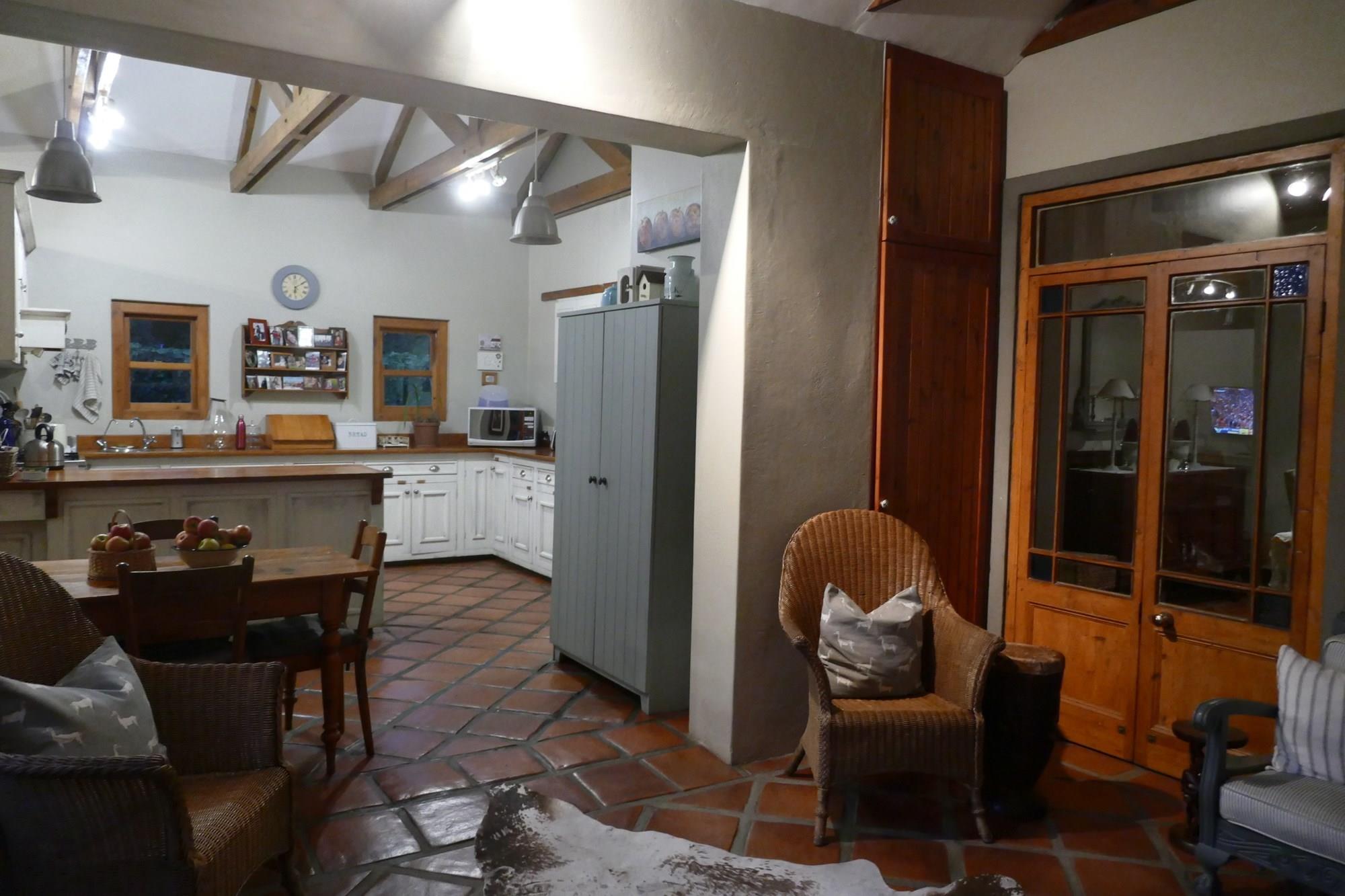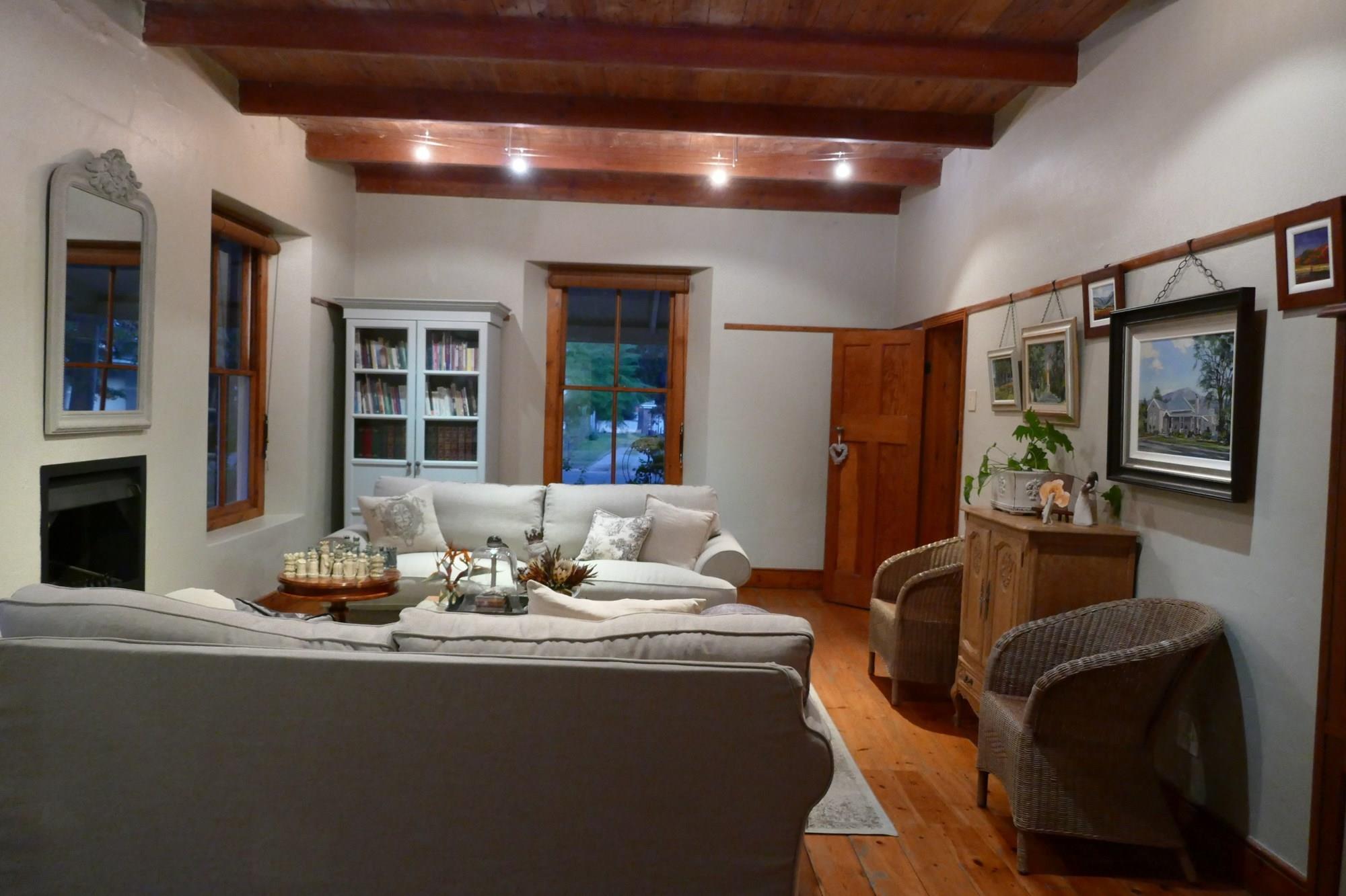 Inside, the home glows with charming wood finishes that extend along the passageway guiding you to the gracious dining room and through a generously sized lounge with a cosy fireplace. The well-appointed eat-in country kitchen, complete with an adjoining braai room and separate scullery, offers modern convenience without compromising on rustic charm. An additional leisure space features a TV room with a snug fireplace, extending from the kitchen and leading to the conveniently located home office.