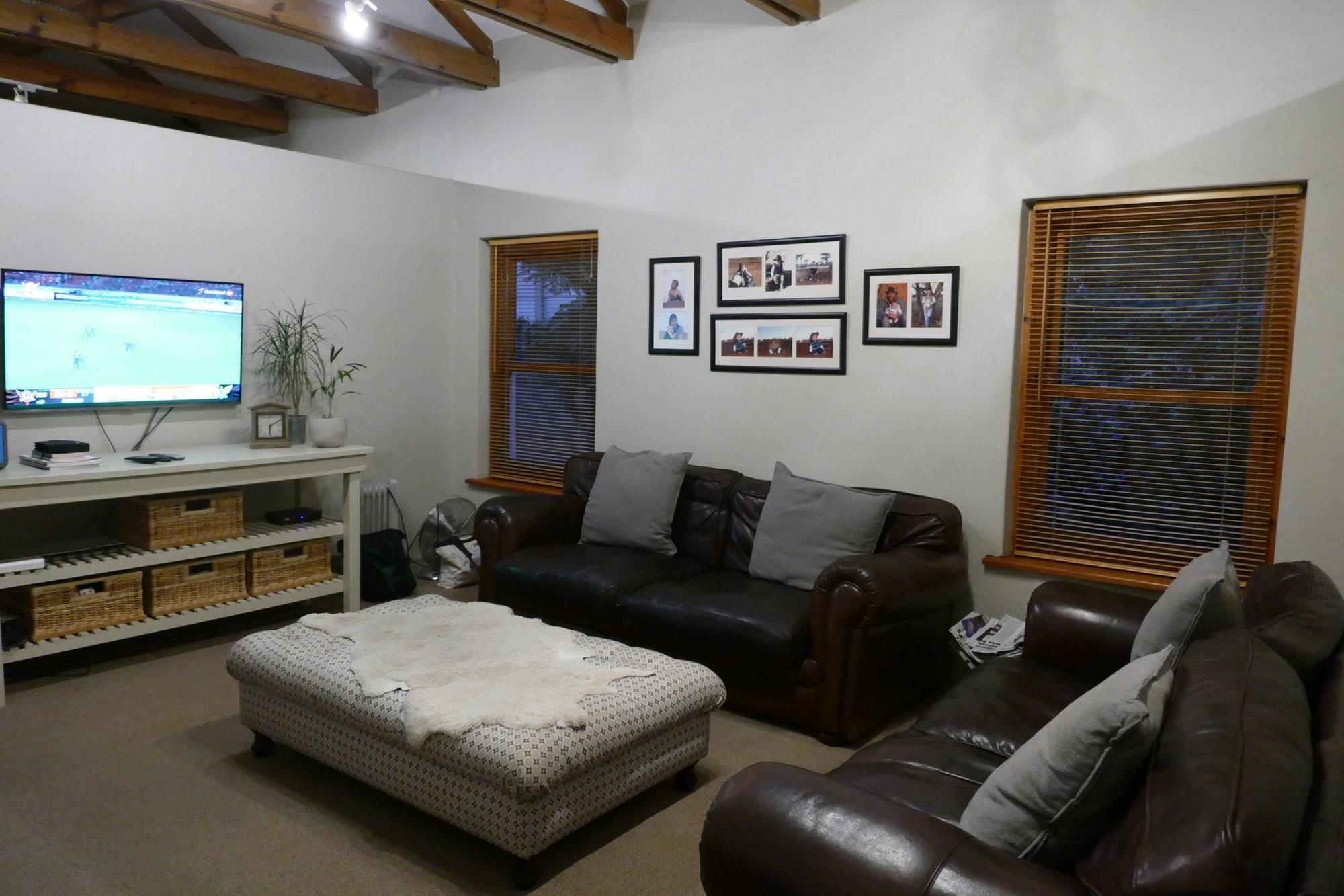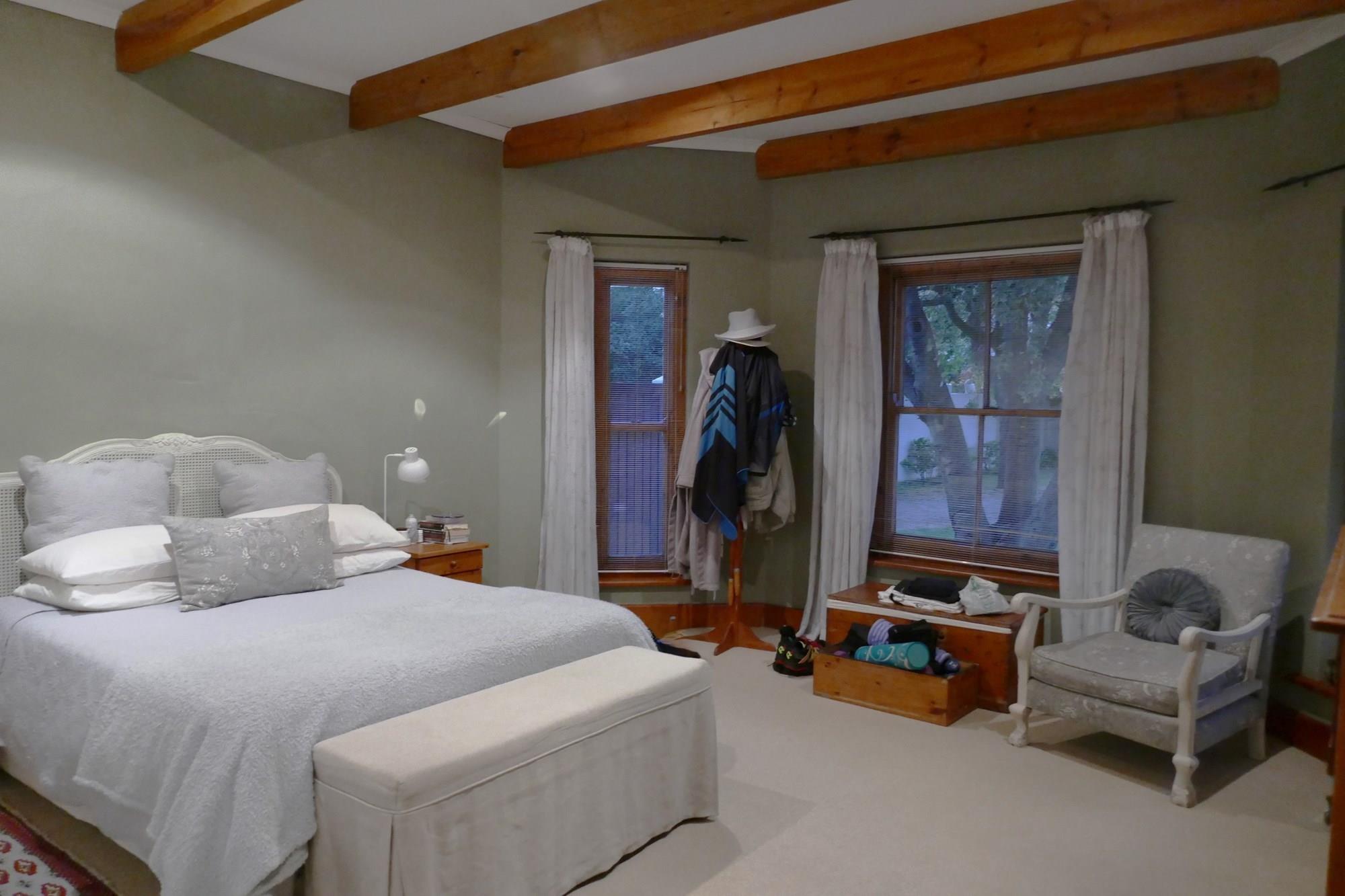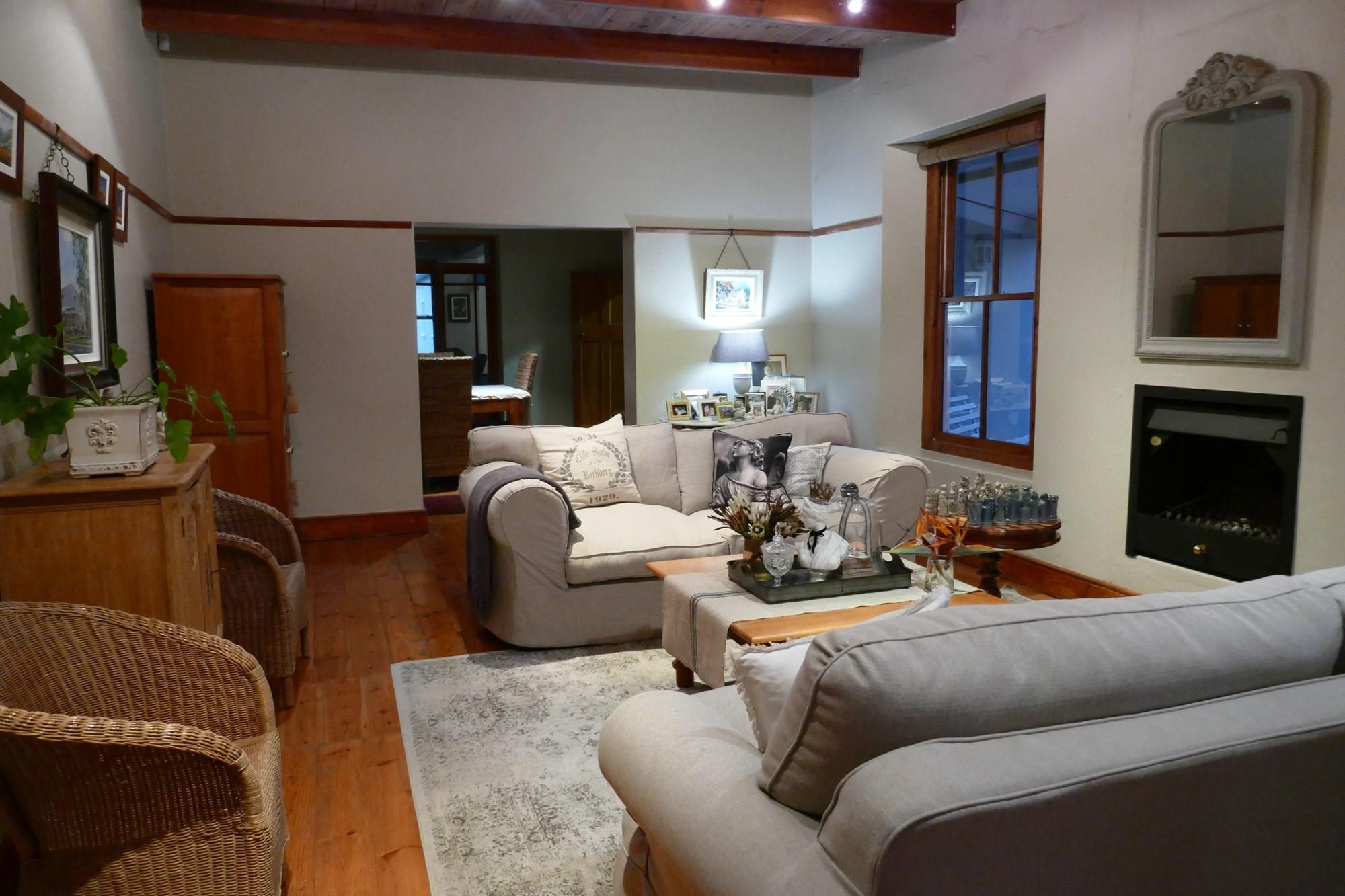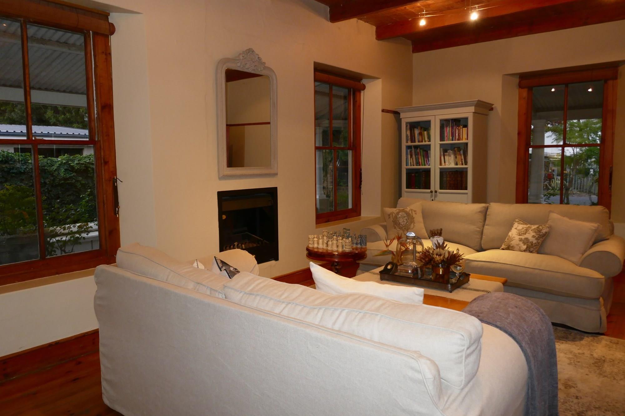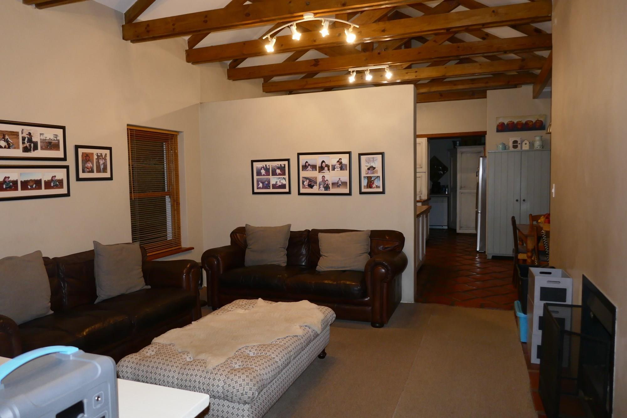 Inside, the home glows with charming wood finishes that extend along the passageway guiding you to the gracious dining room and through a generously sized lounge with a cosy fireplace. The well-appointed eat-in country kitchen, complete with an adjoining braai room and separate scullery, offers modern convenience without compromising on rustic charm. An additional leisure space features a TV room with a snug fireplace, extending from the kitchen and leading to the conveniently located home office.