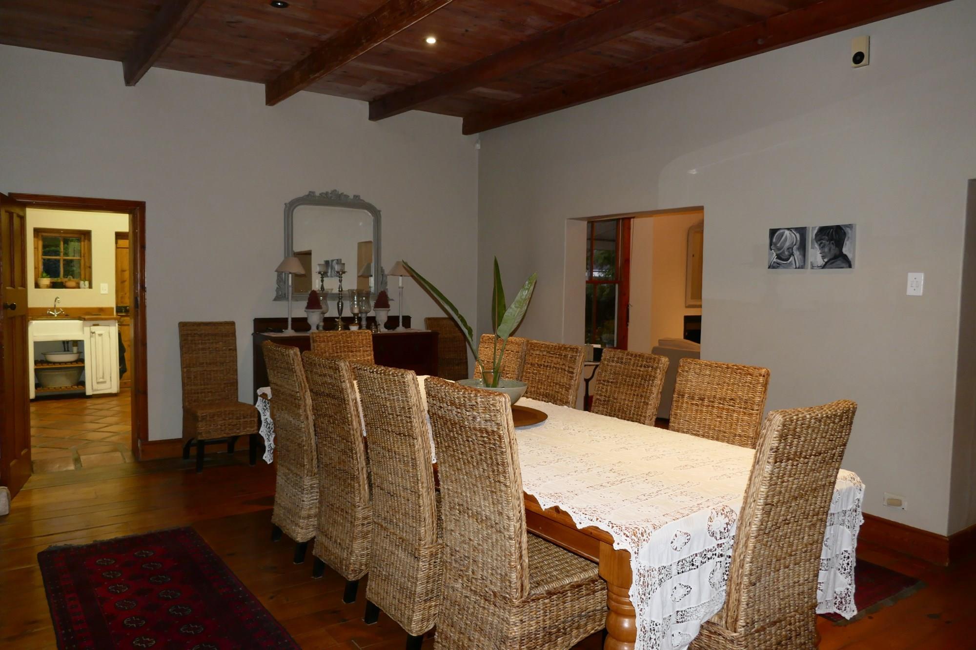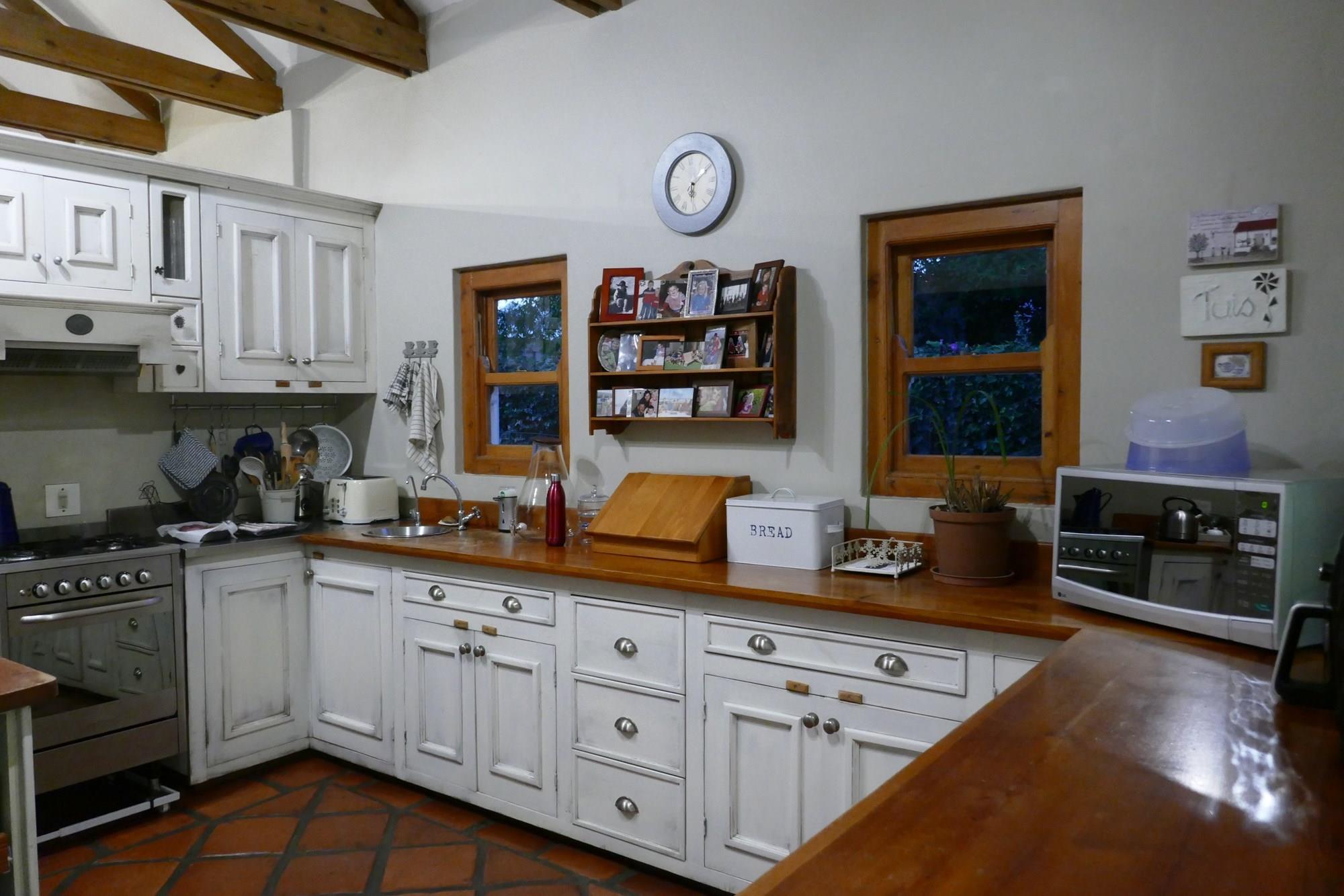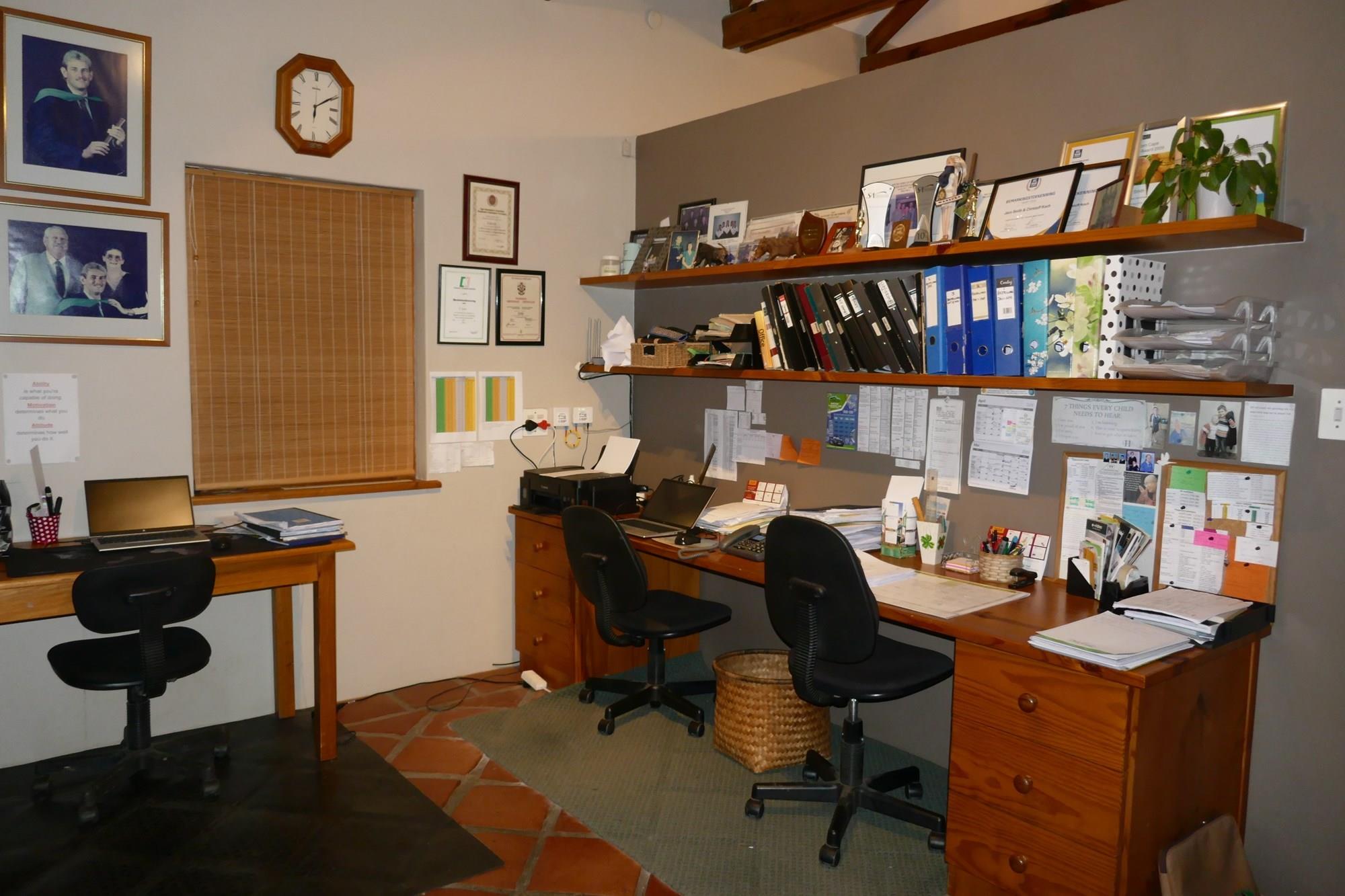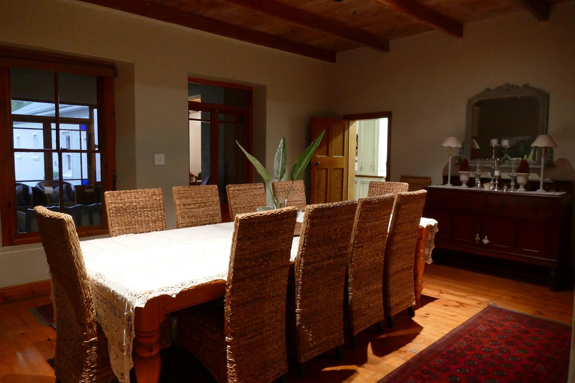 Inside, the home glows with charming wood finishes that extend along the passageway guiding you to the gracious dining room and through a generously sized lounge with a cosy fireplace. The well-appointed eat-in country kitchen, complete with an adjoining braai room and separate scullery, offers modern convenience without compromising on rustic charm. An additional leisure space features a TV room with a snug fireplace, extending from the kitchen and leading to the conveniently located home office.