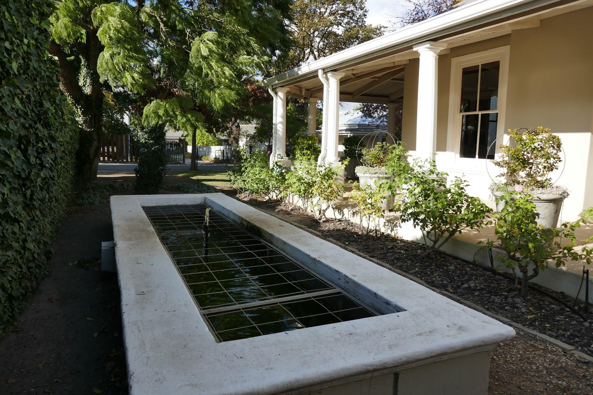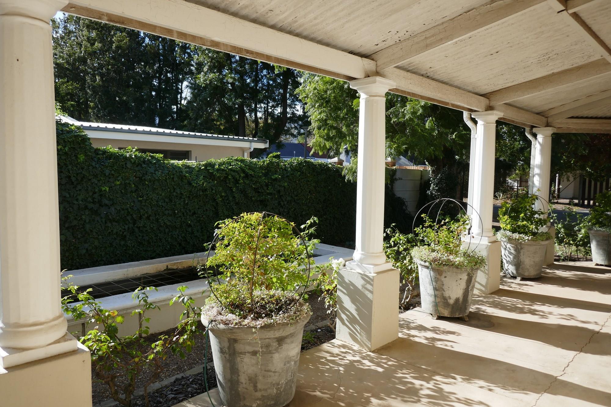 Enhanced by a wrap-around front stoep adorned with elegant columns and framed by lush greenery and a tranquil water feature, the property boasts an enchanting exterior.