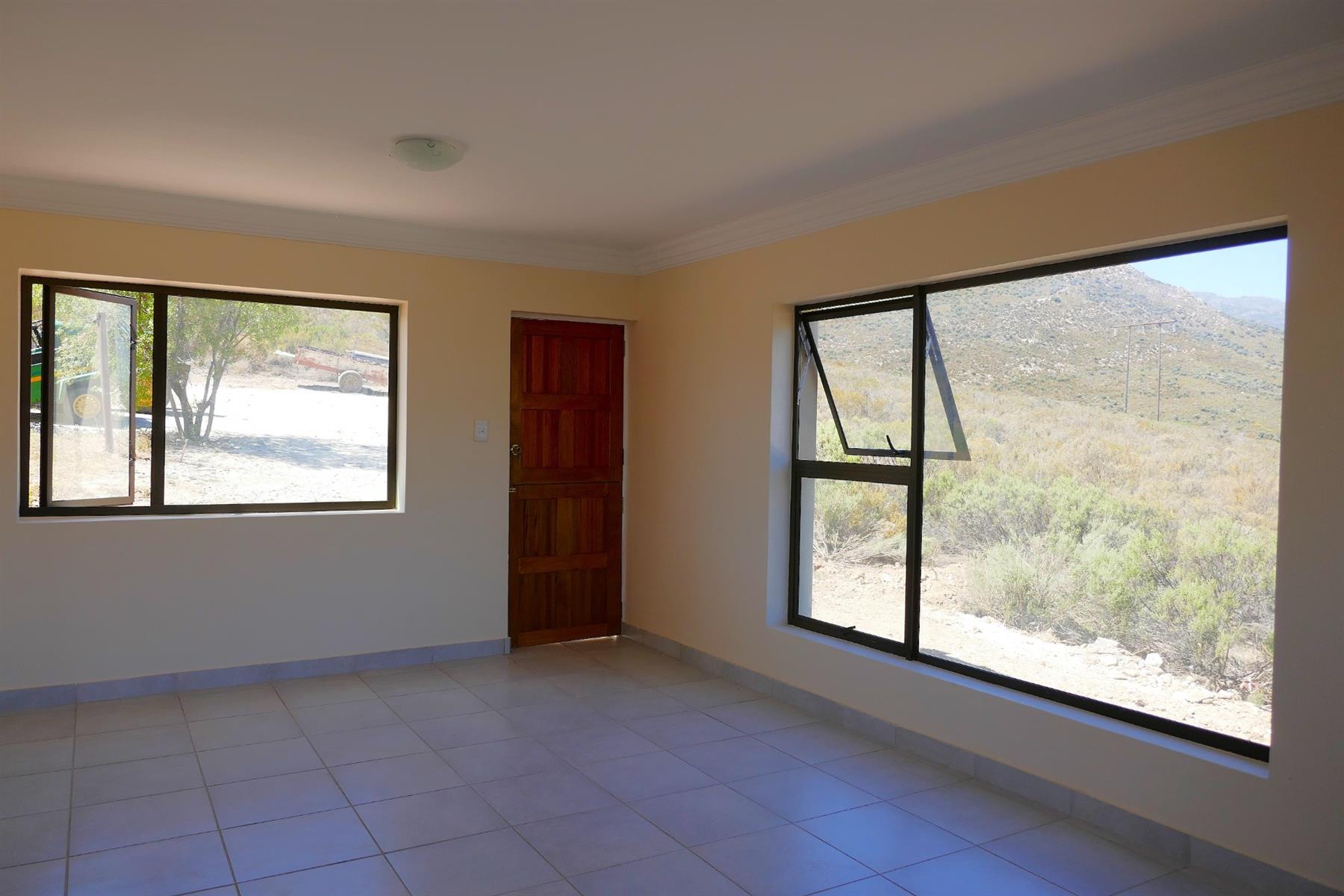 The home offers two comfortable bedrooms and a neat shower bathroom. A spacious, separate kitchen fitted with a gas stove provides practical country functionality, while the generous living area features large picture windows that frame the picturesque landscape and a door opening onto a paved entertainment area — perfect for relaxed indoor-outdoor lifestyle.