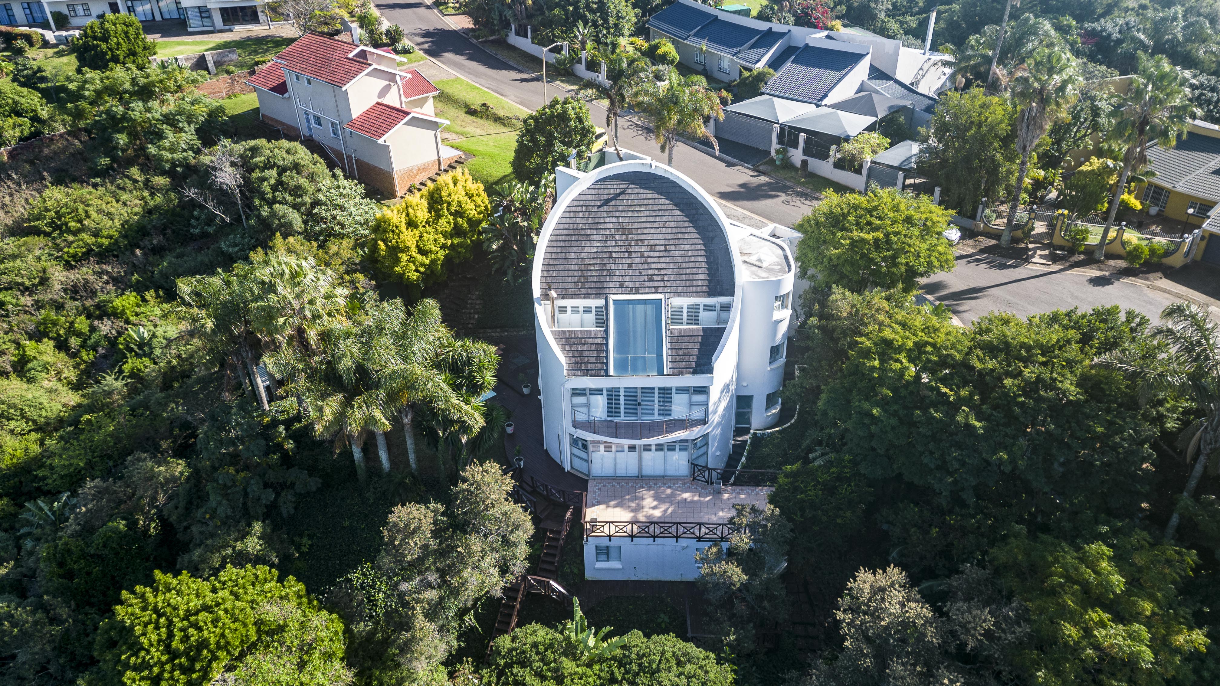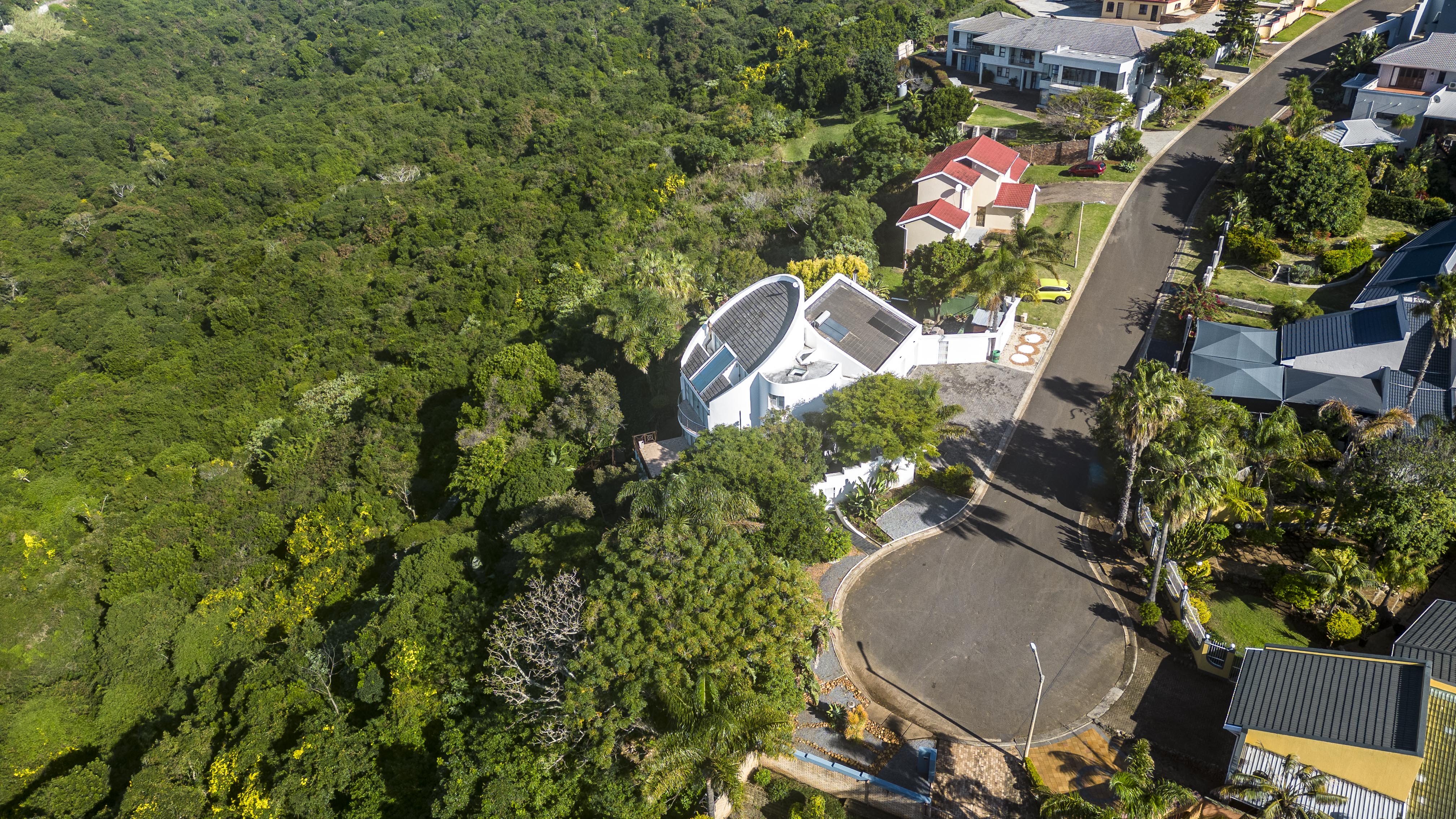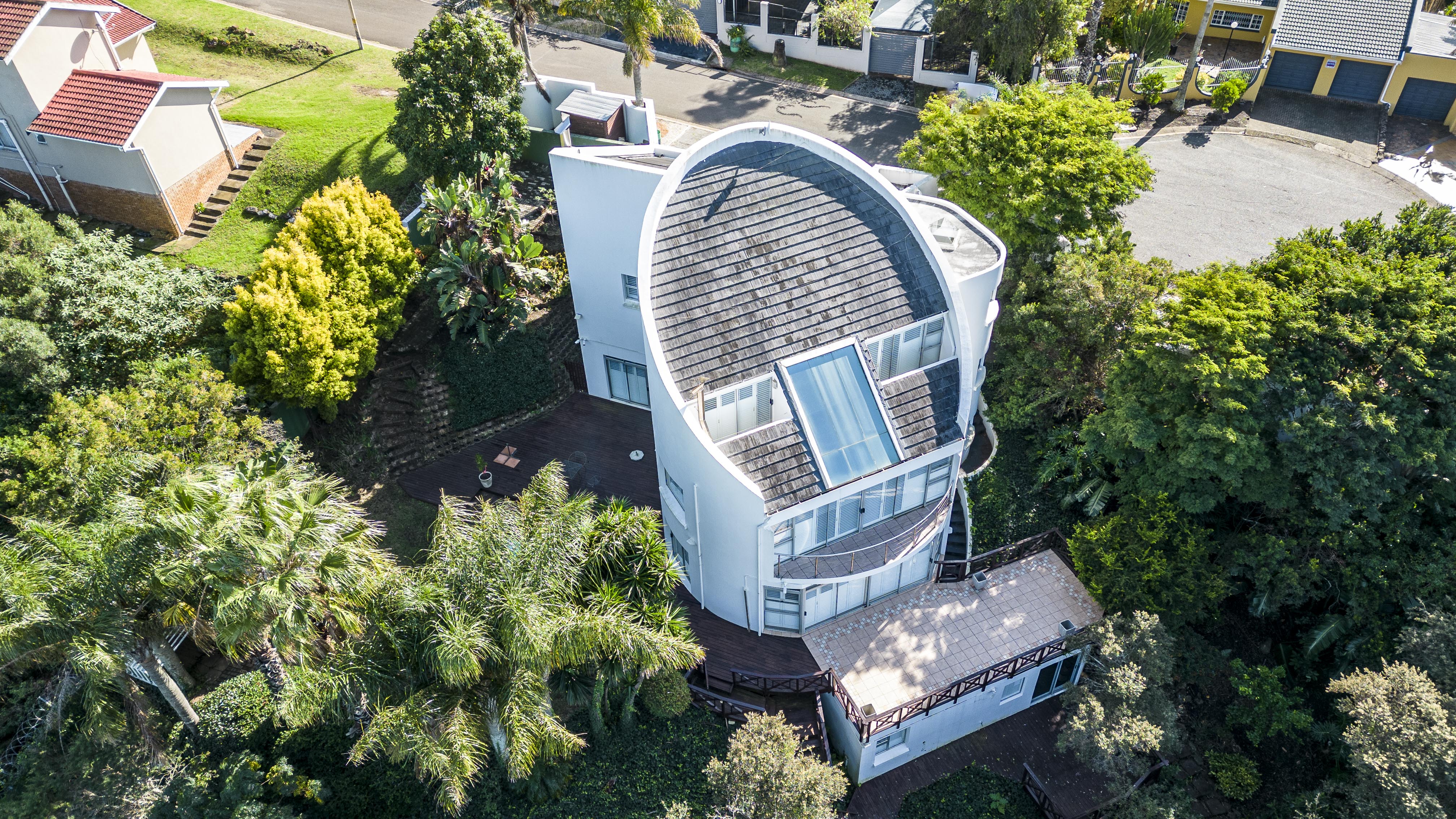 This home is a true architectural showpiece, designed with bold, modern lines that immediately set it apart. From above, the property reveals a striking curved roofline with a central skylight feature, giving it a distinctive, almost sculptural presence.