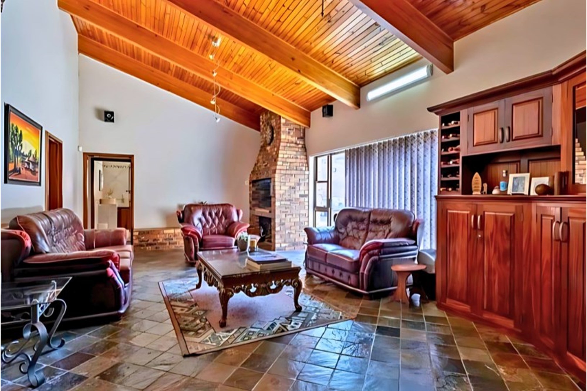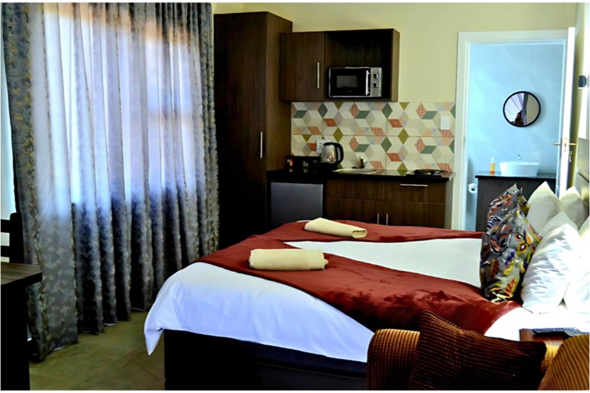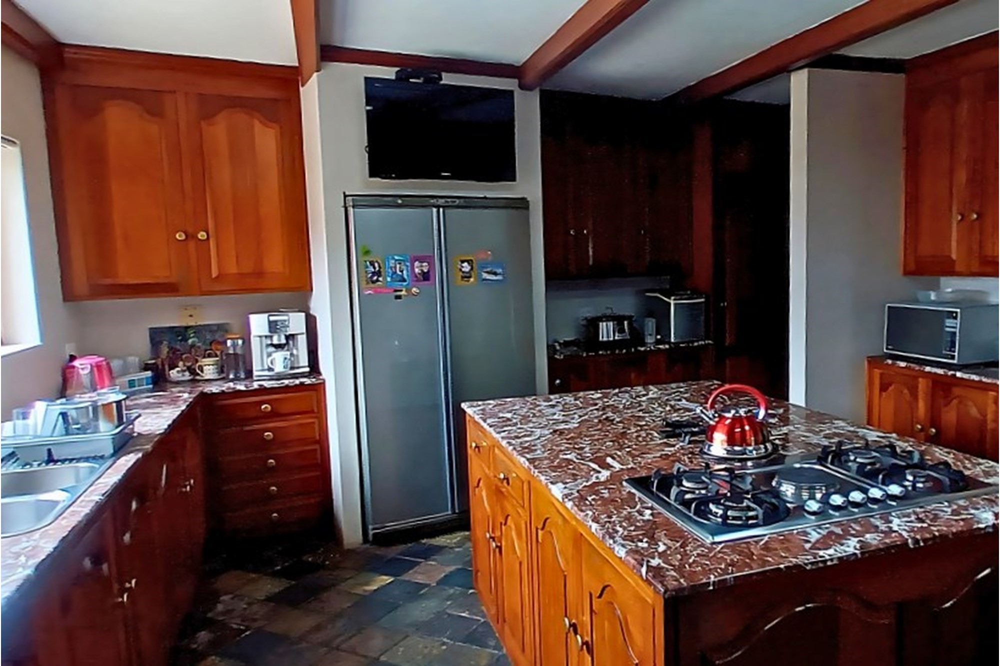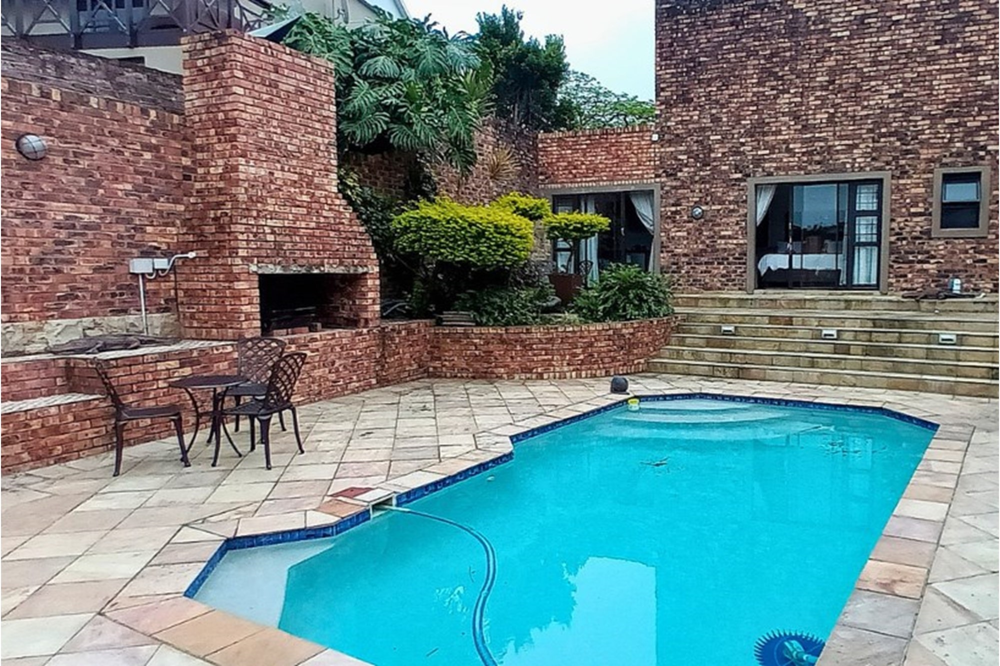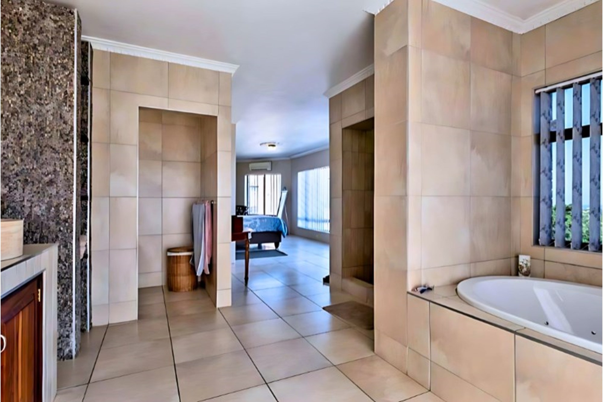 Inside, the home boasts ten exquisitely designed suites, each with its own private en-suite bathroom, ensuring the ultimate privacy and convenience. Seven of these suites are fully self-catering, thoughtfully equipped with kitchenettes, while the remaining rooms provide an elegant bed-and-breakfast-style experience. The master suite is an opulent retreat, featuring a spacious layout, a walk-in closet fitted with handcrafted solid wood cabinetry, and a lavish en-suite bathroom with a jetted jacuzzi-style bath and an oversized walk-in shower.