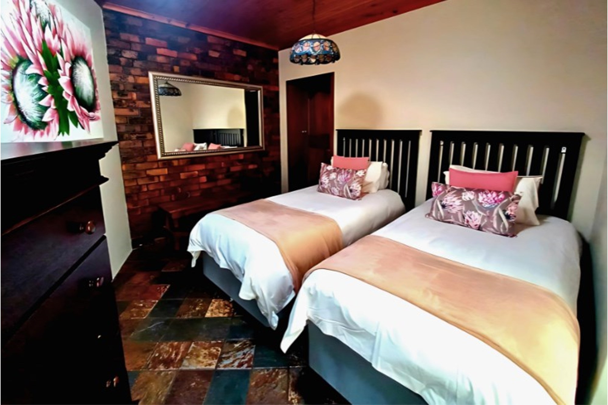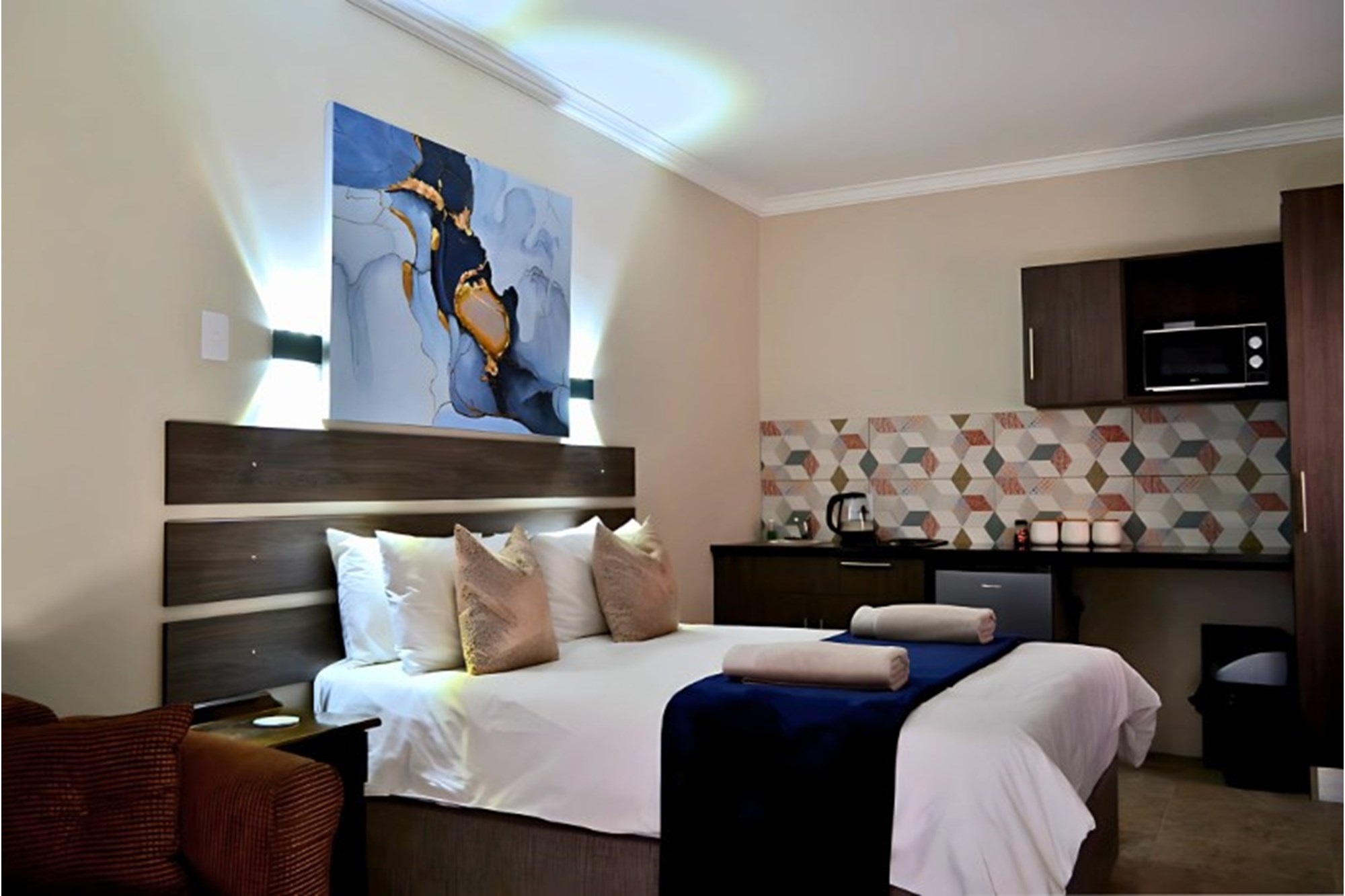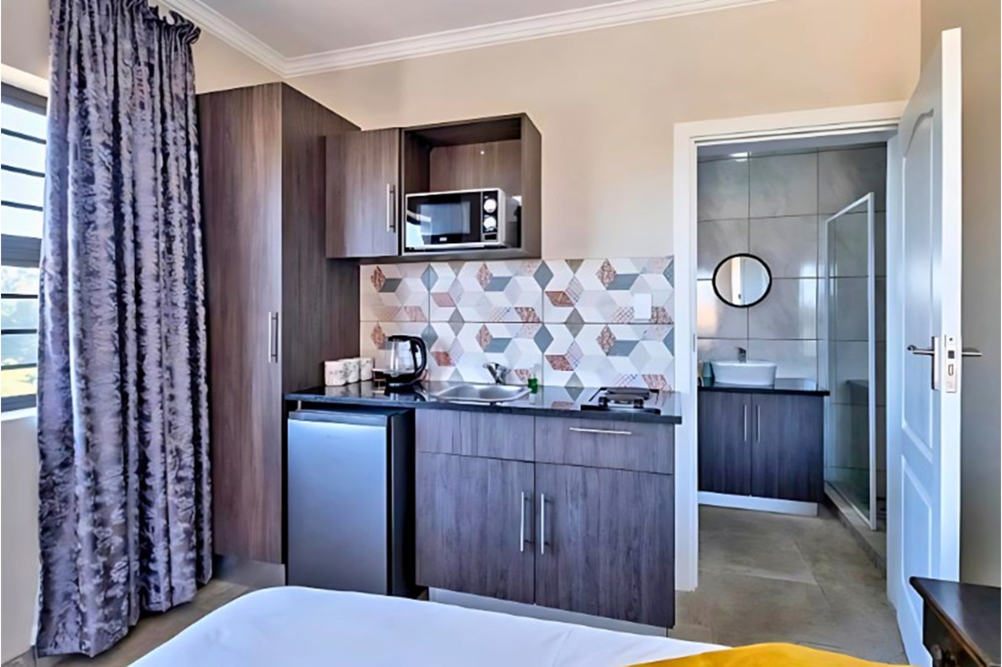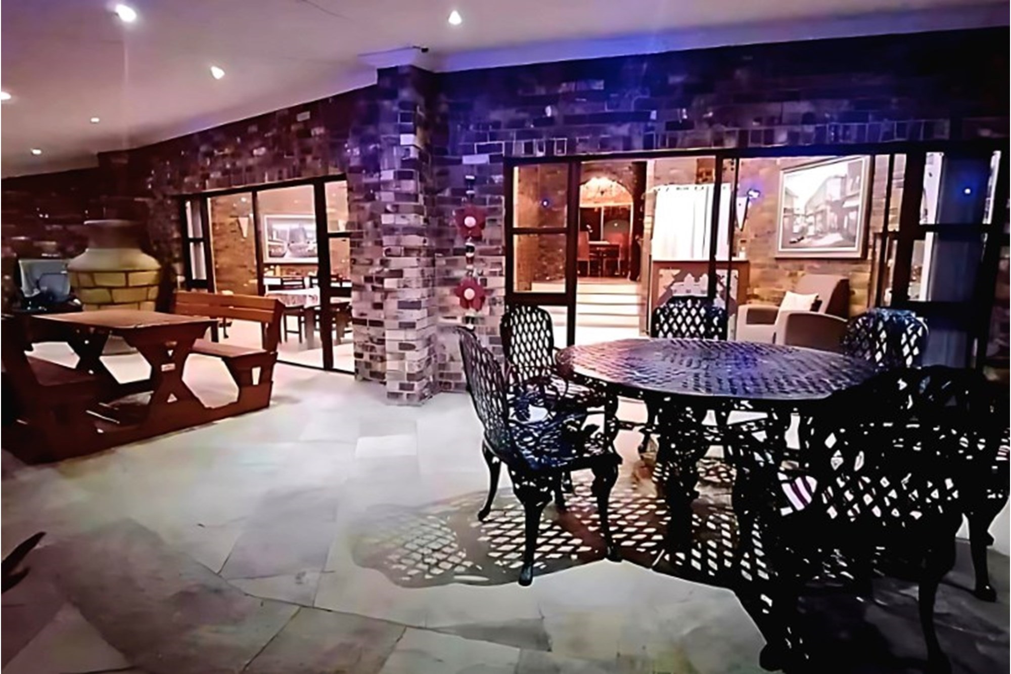 Inside, the home boasts ten exquisitely designed suites, each with its own private en-suite bathroom, ensuring the ultimate privacy and convenience. Seven of these suites are fully self-catering, thoughtfully equipped with kitchenettes, while the remaining rooms provide an elegant bed-and-breakfast-style experience. The master suite is an opulent retreat, featuring a spacious layout, a walk-in closet fitted with handcrafted solid wood cabinetry, and a lavish en-suite bathroom with a jetted jacuzzi-style bath and an oversized walk-in shower.