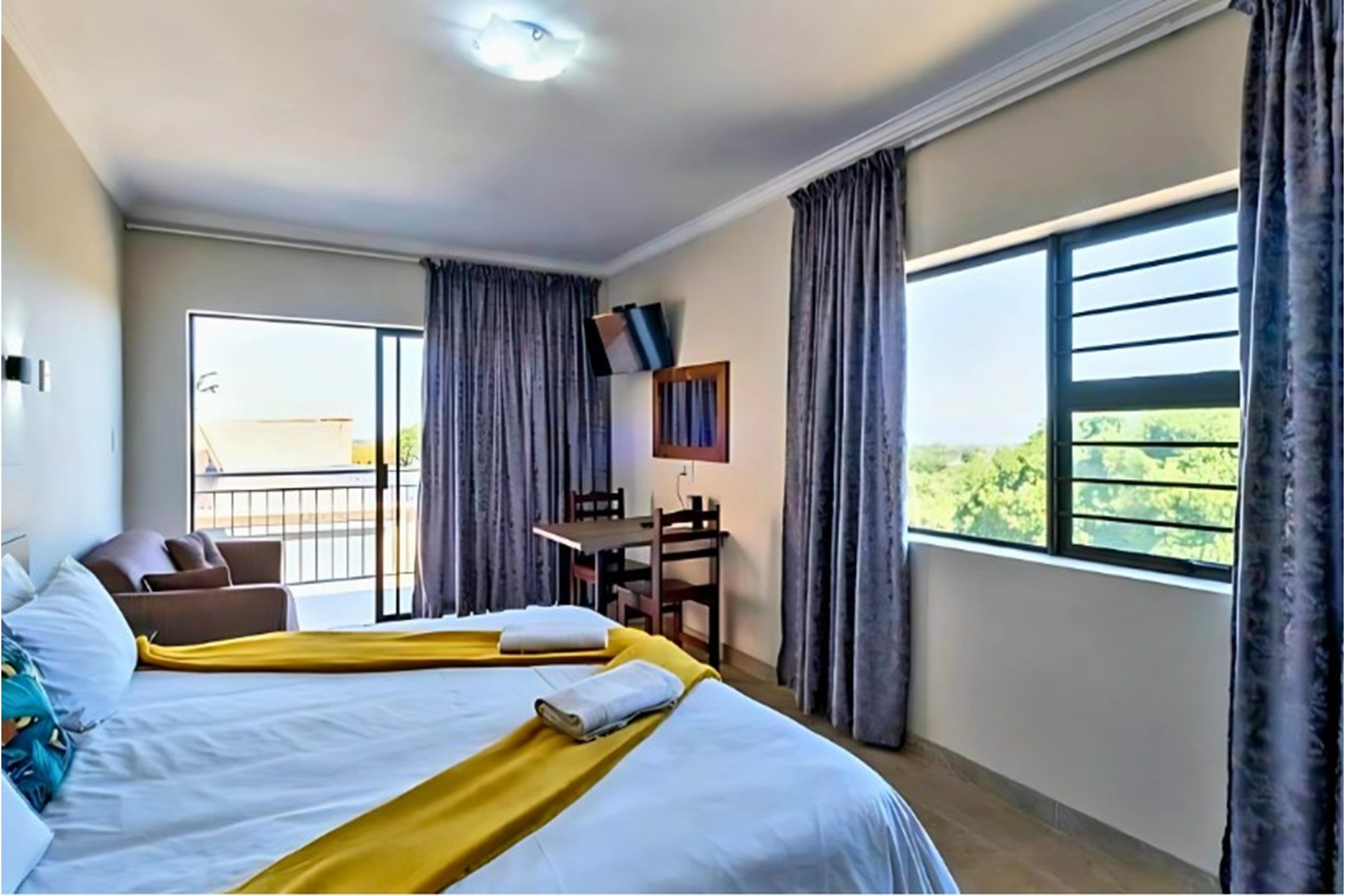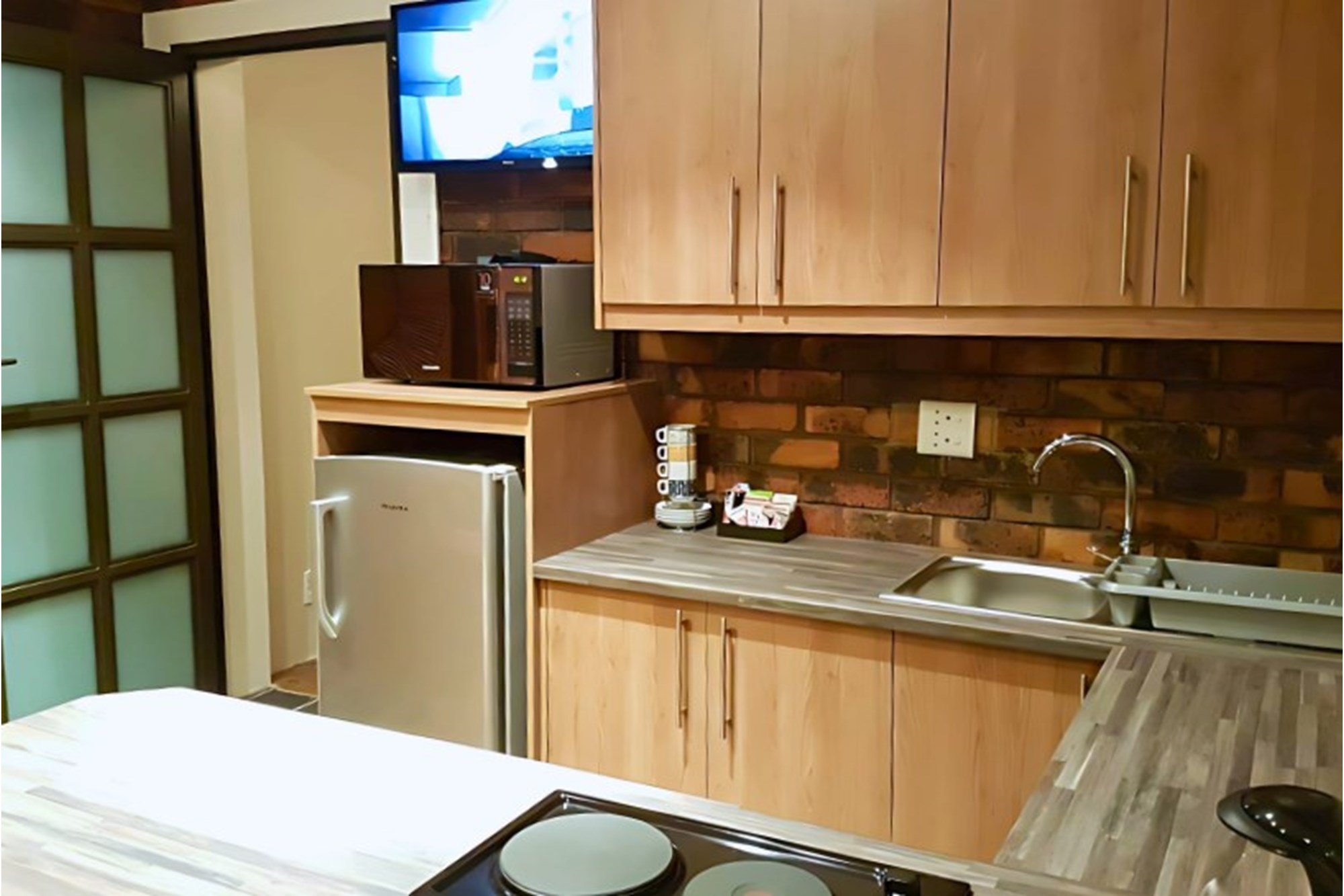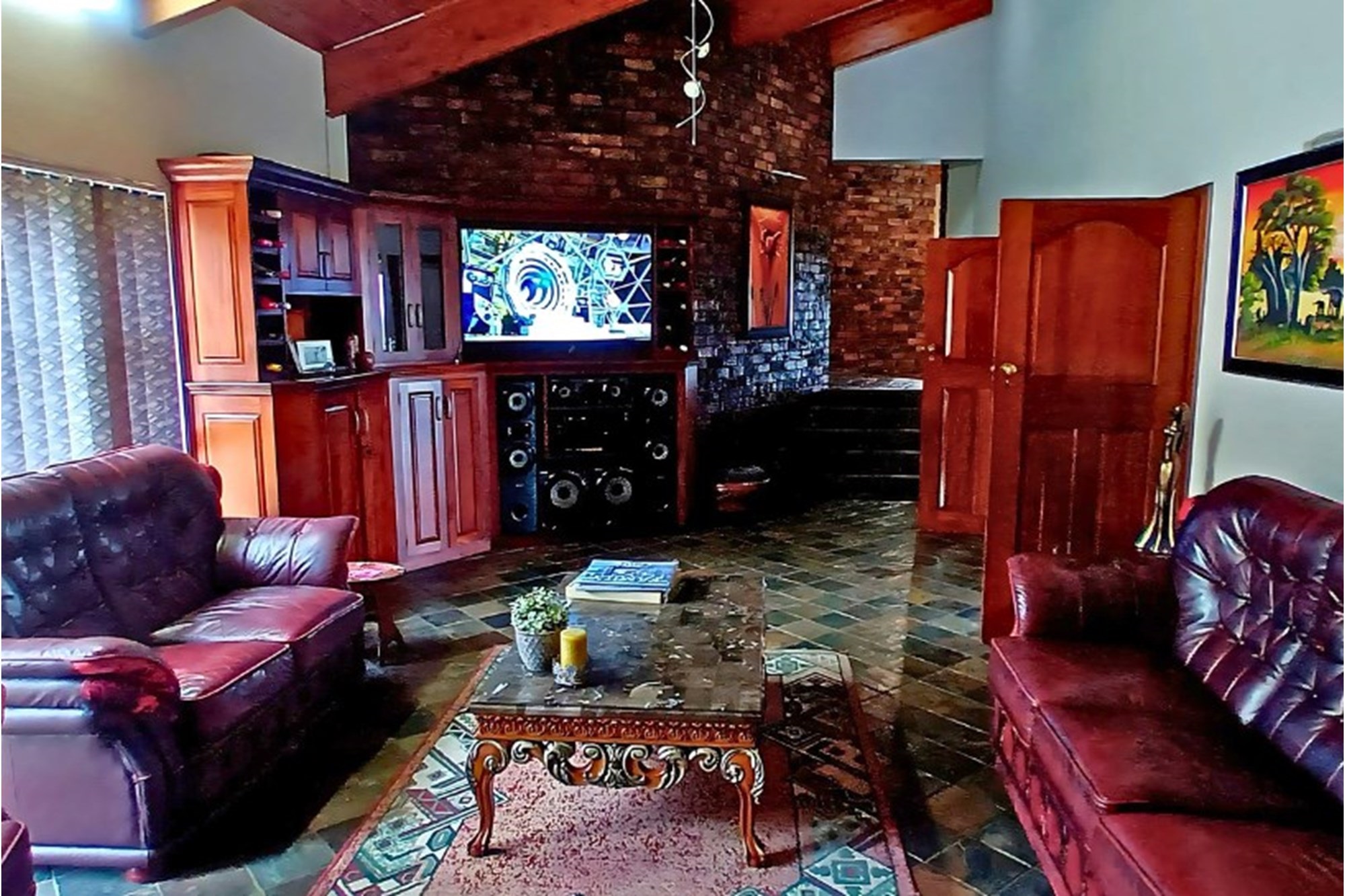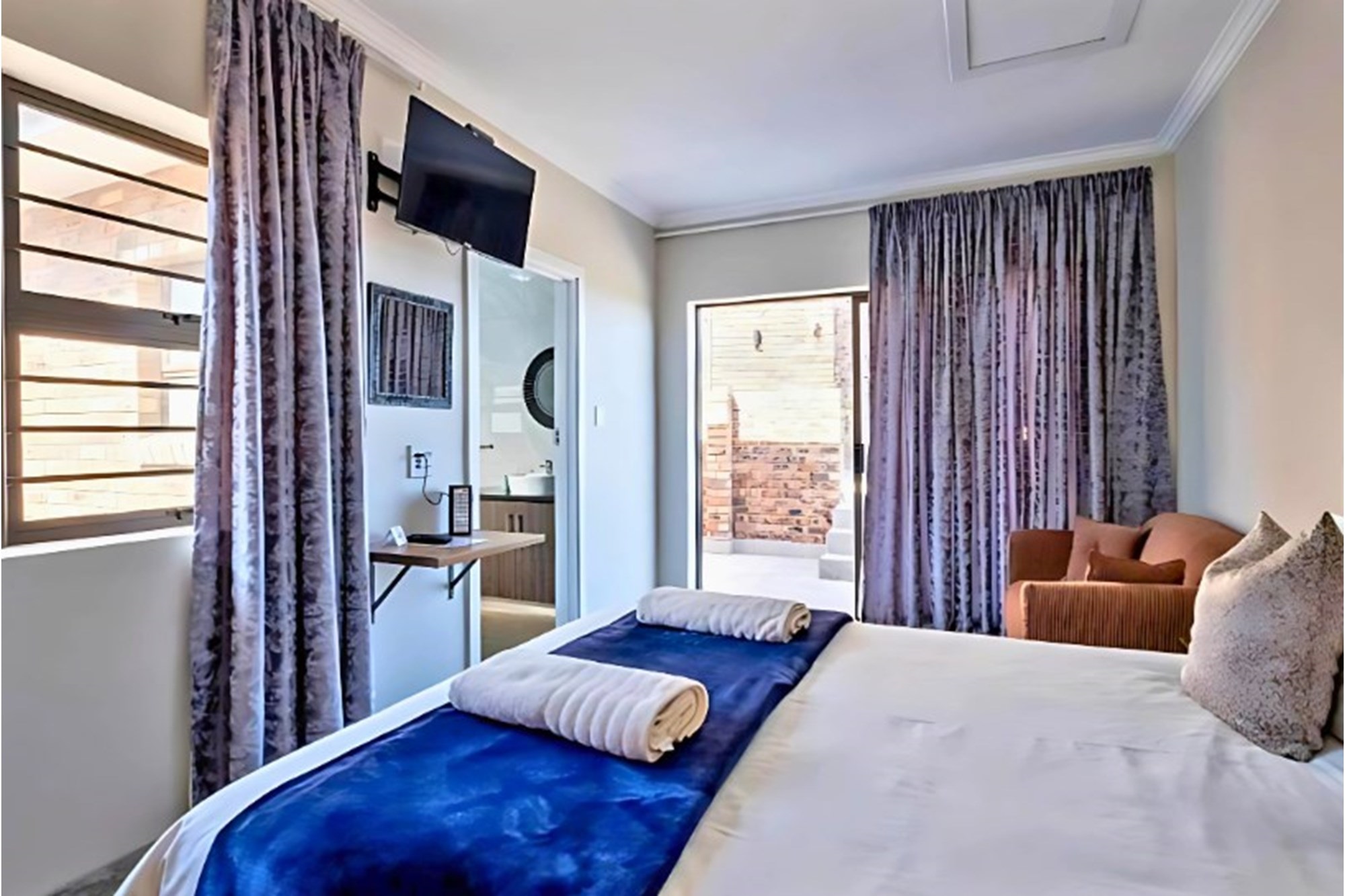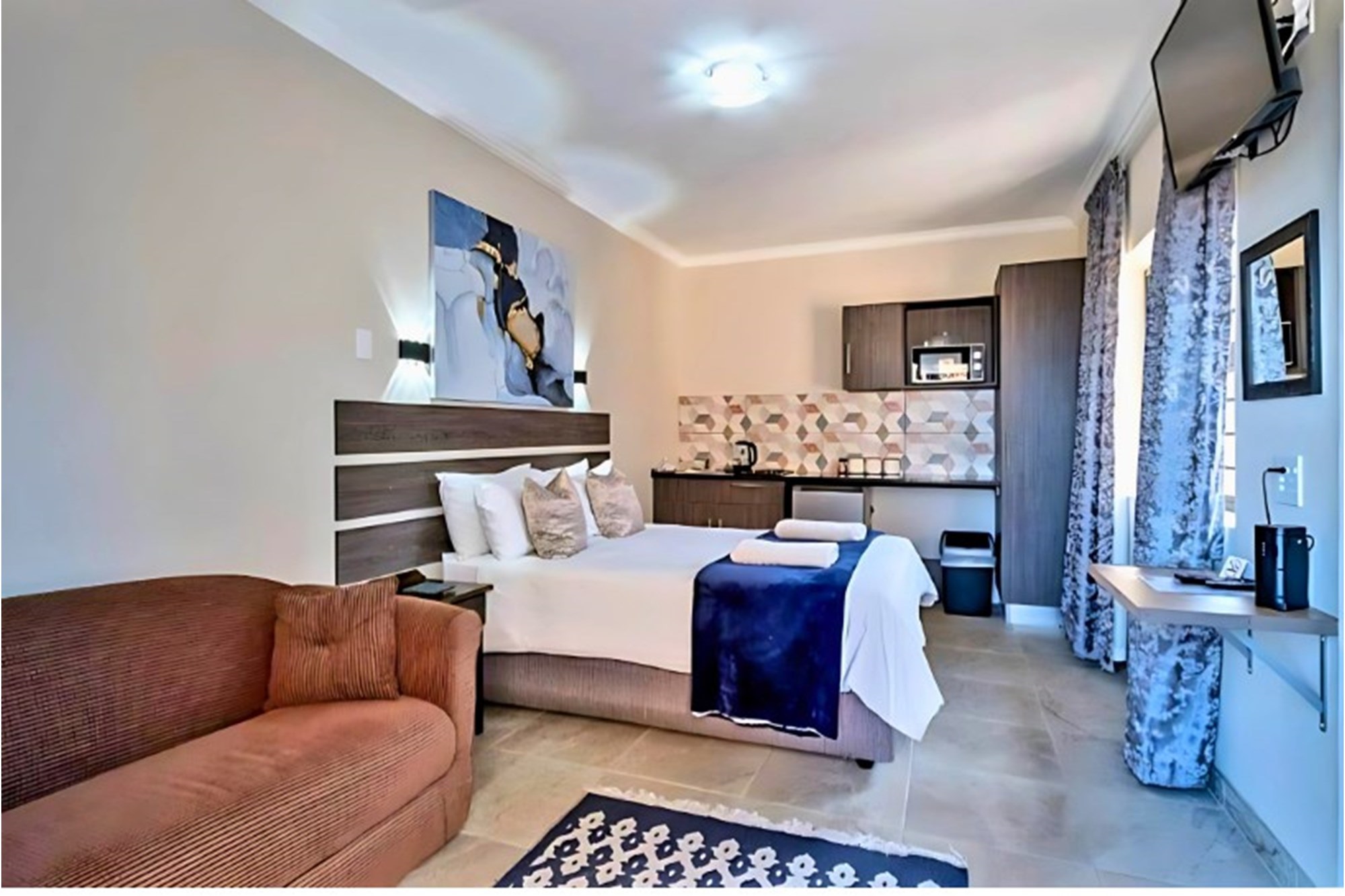 Inside, the home boasts ten exquisitely designed suites, each with its own private en-suite bathroom, ensuring the ultimate privacy and convenience. Seven of these suites are fully self-catering, thoughtfully equipped with kitchenettes, while the remaining rooms provide an elegant bed-and-breakfast-style experience. The master suite is an opulent retreat, featuring a spacious layout, a walk-in closet fitted with handcrafted solid wood cabinetry, and a lavish en-suite bathroom with a jetted jacuzzi-style bath and an oversized walk-in shower.