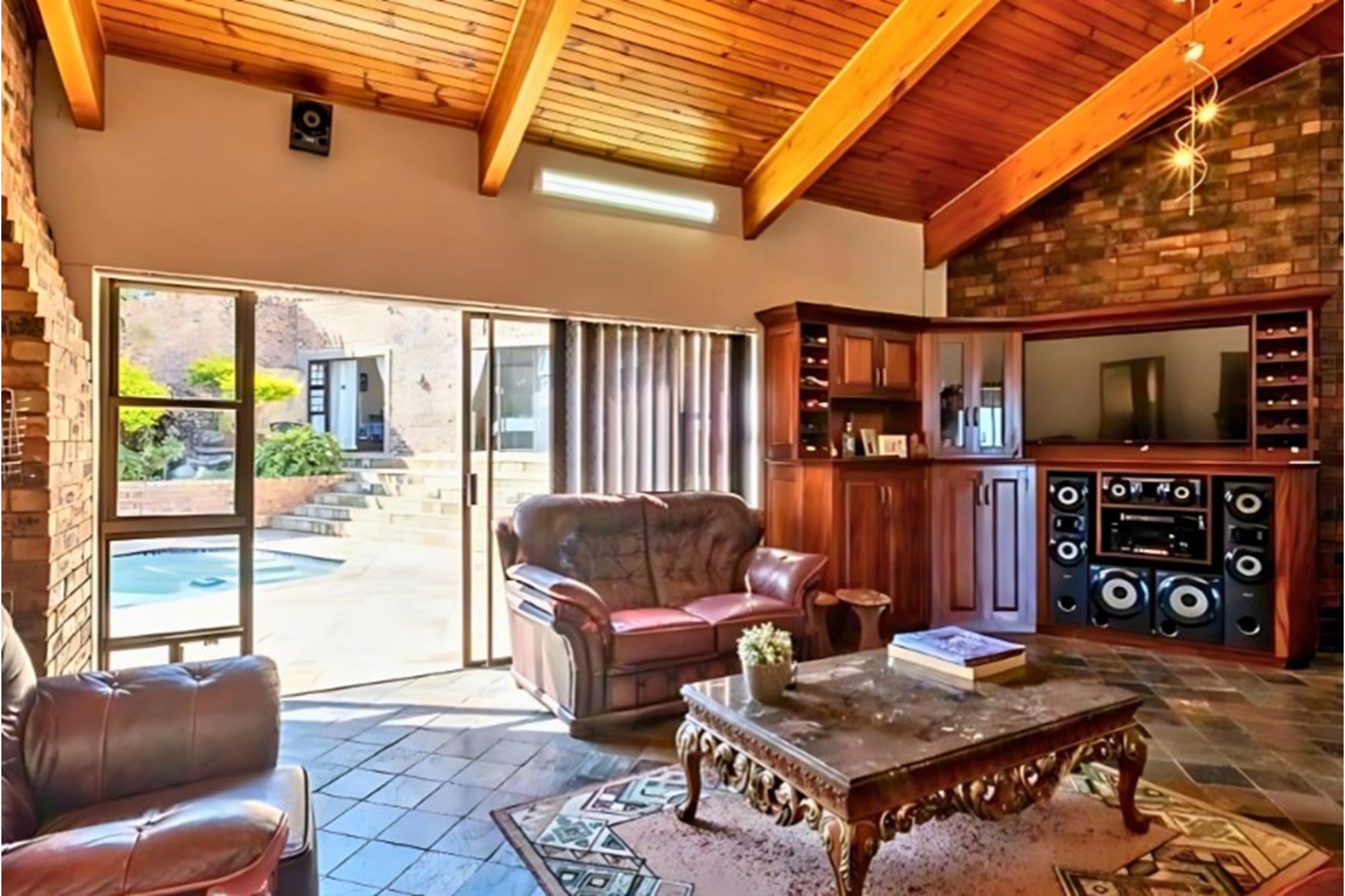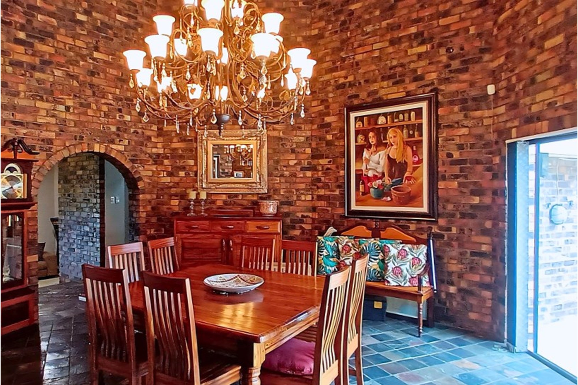 The heart of the home is its gourmet farm-style kitchen, a chef’s dream with high-end appliances, a gas stove, and a charming built-in breakfast nook. The formal dining room, illuminated by a magnificent chandelier, exudes elegance, while the spacious lounge provides a warm and inviting ambiance. A second dining area seamlessly flows towards the pool, creating the perfect space for relaxed gatherings.