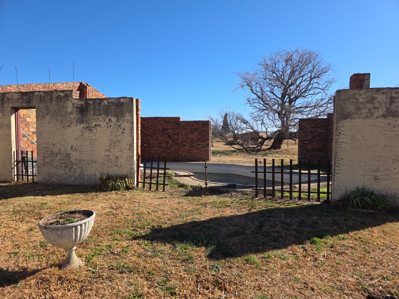 Swimming pool with unfinished walls and roof. Owner wanted to complete it so it would be a covered entertainment area.