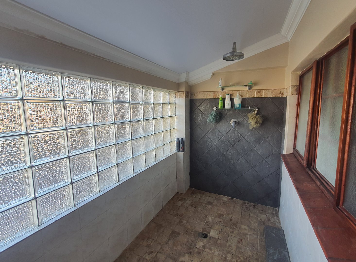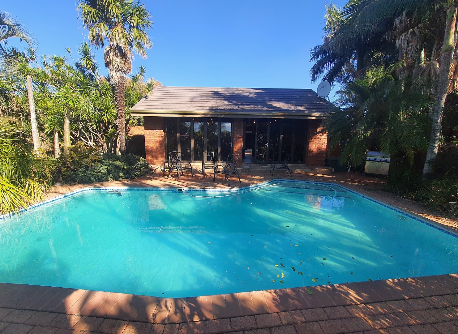 Stunning braai room with bar, granite tops, built-in projector, and stackable doors leading to a fenced swimming pool with an auto-cleaning system
