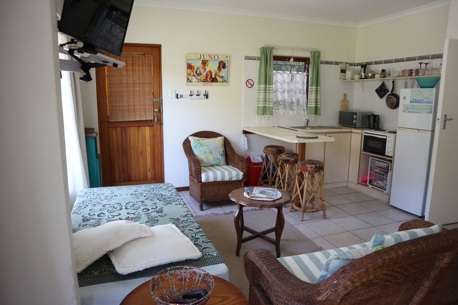 Two spacious bedrooms, both en-suite with sun streaming through the big windows into the open-plan downstairs living and dining area. The North facing bedroom has a kitchenette and a separate entrance. Can be used as an Air B&B. Can be changed back into the original 2 bedrooms. A cosy kitchen which flows into the dining area. Natural light streams through the big window in the lounge. A fireplace to warm yourselves and relax.