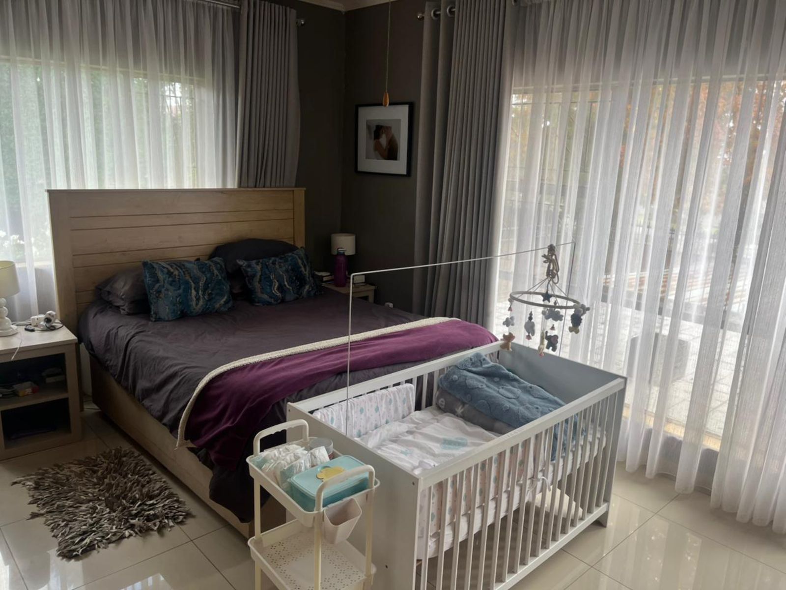 a sunlit TV room with floor-to-ceiling windows,