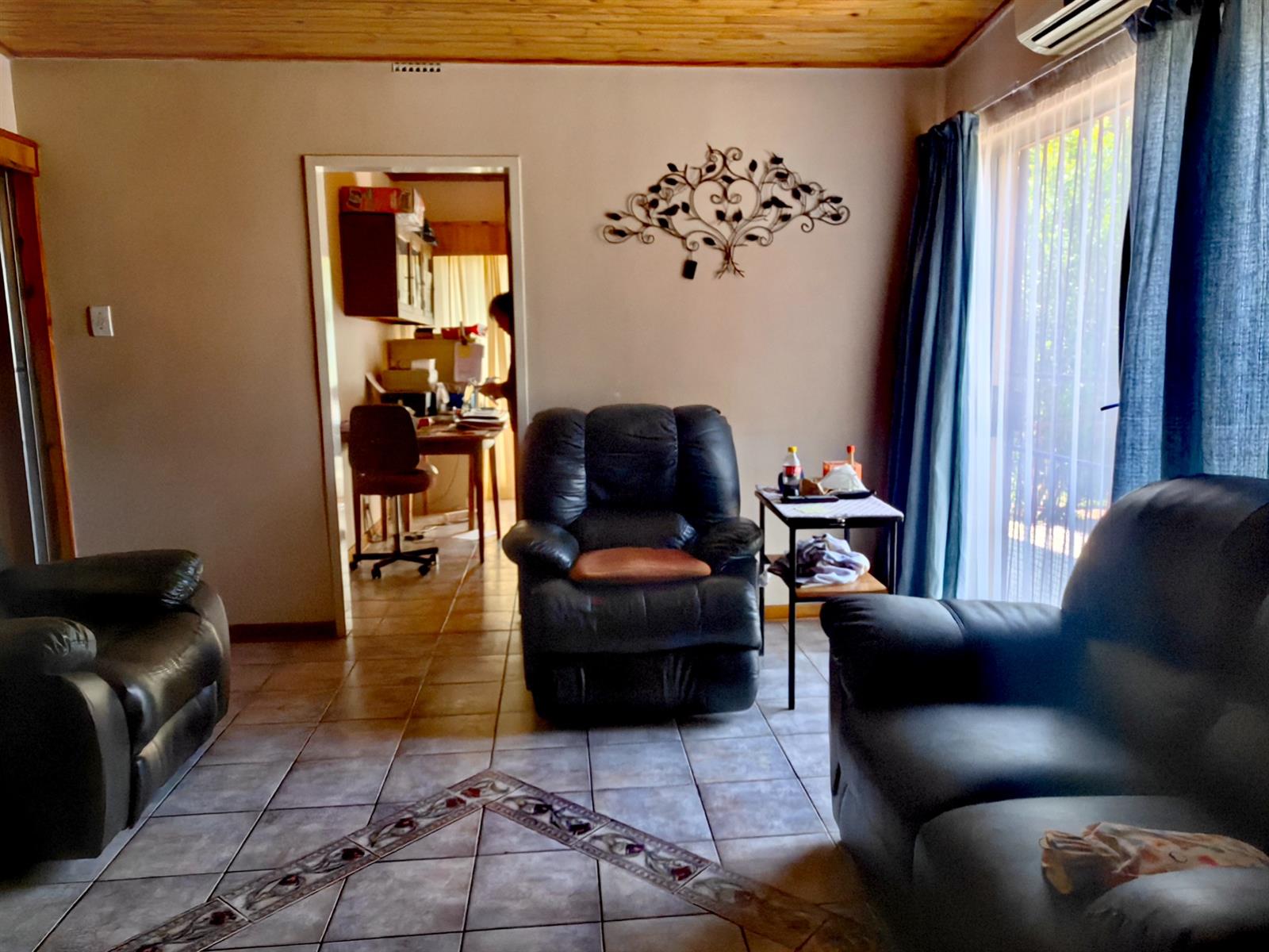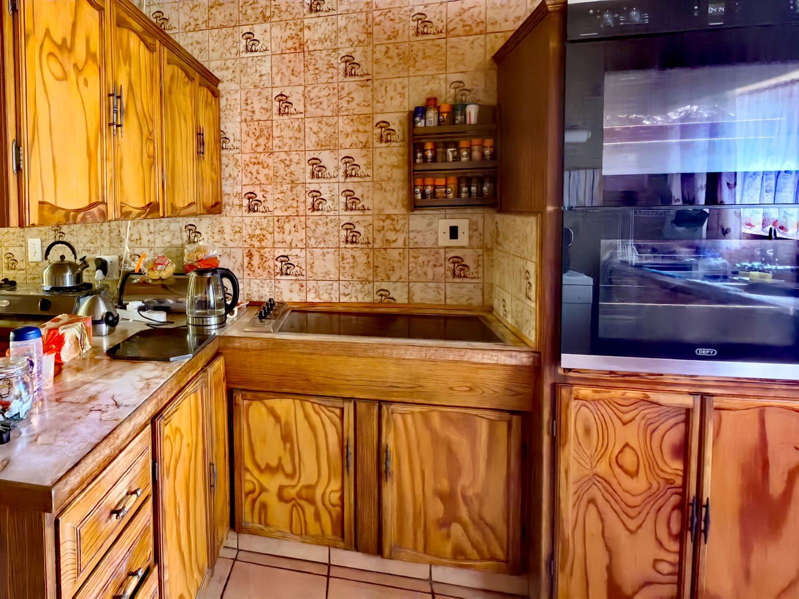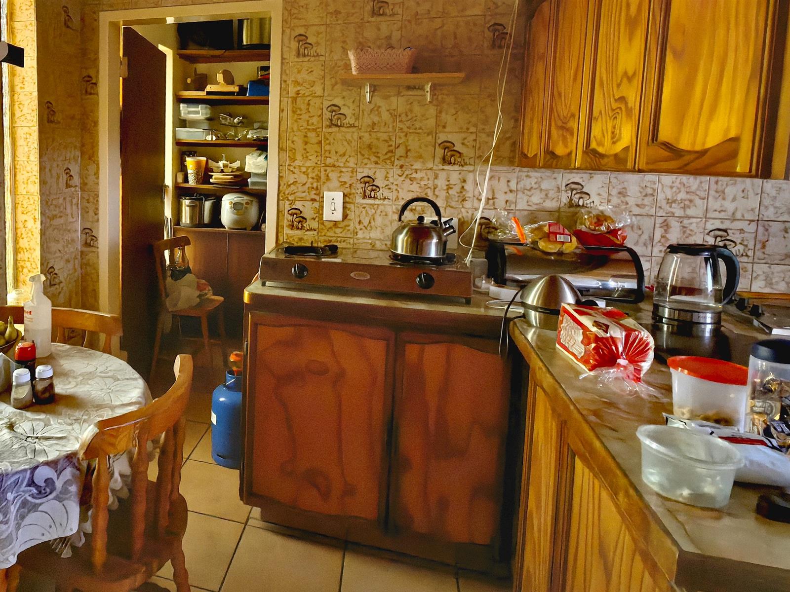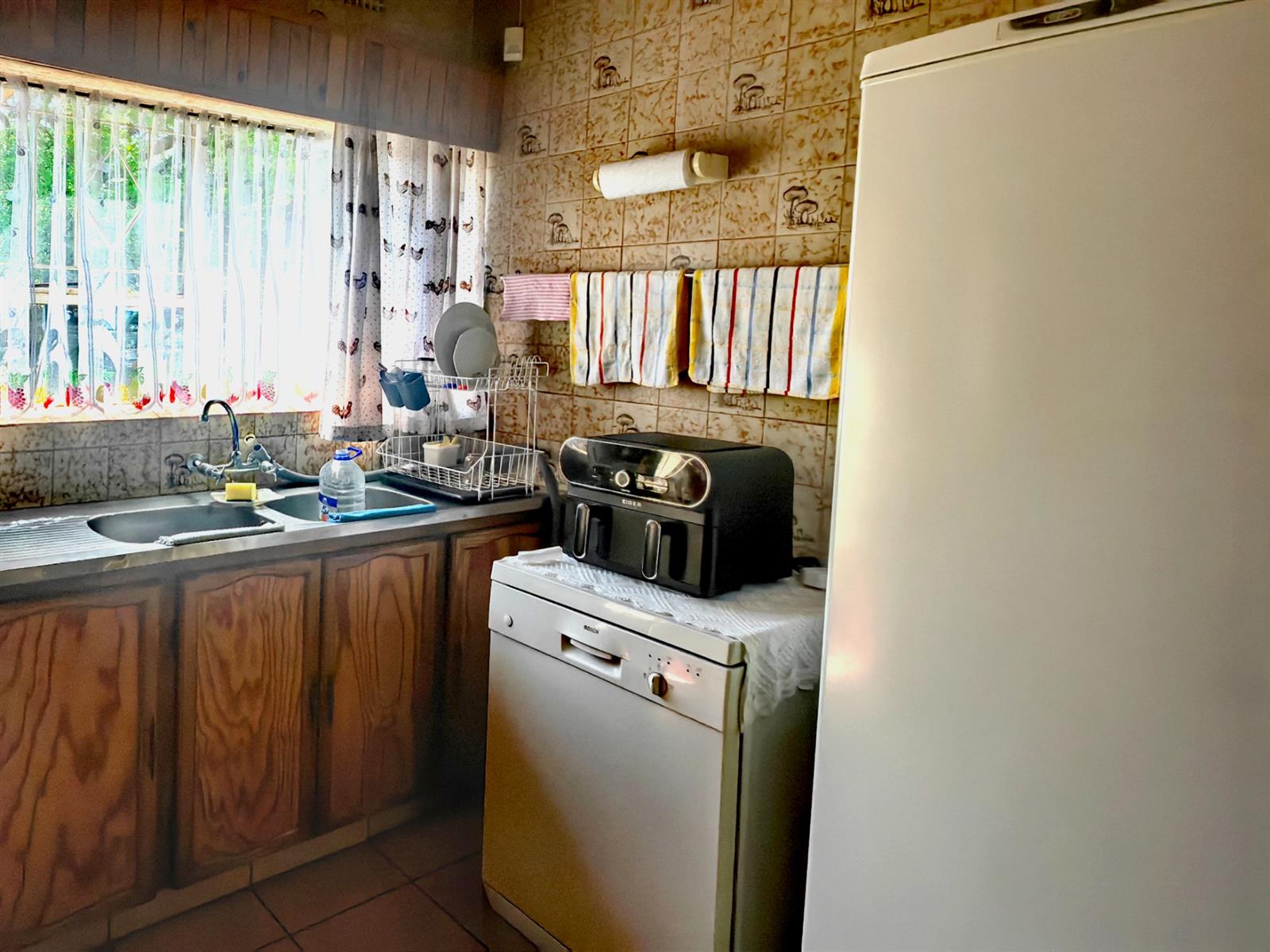Step into a welcoming, open-plan kitchen that boasts beautiful wooden countertops, built-in cupboards, an electric stove, eye-level oven, a double basin, and a pantry – ideal family cooking. Adjacent to the kitchen is a warm and inviting dining area, seamlessly flowing into a small hallway leading to a spacious and light-filled lounge, featuring large windows that bathe the room in natural light.