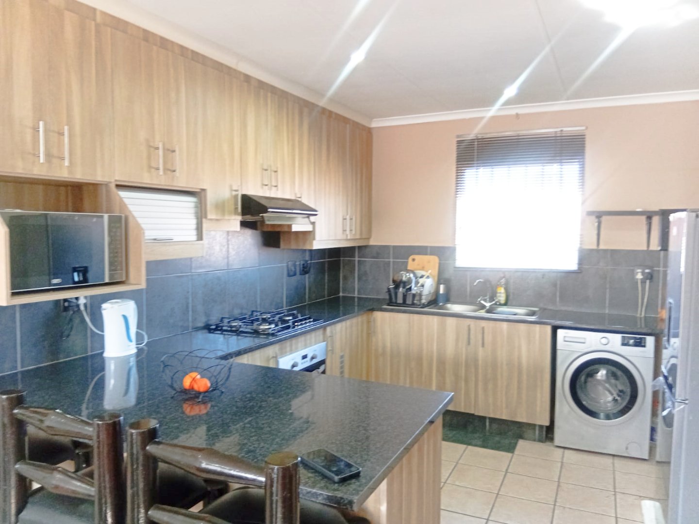 - Open-plan kitchen with ample cupboard space, provision for two appliances, and space for a refrigerator.