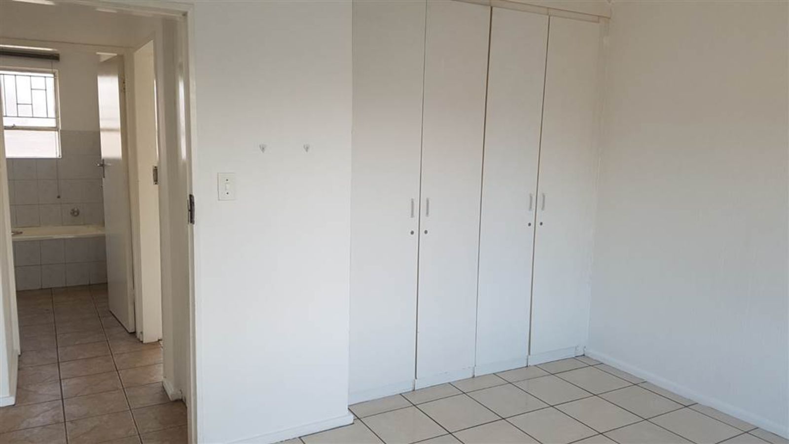 The apartment boasts two spacious bedrooms, each fitted with built in cupboards, and a full bathroom that includes a bathtub, shower, basin, and toilet for your comfort.
