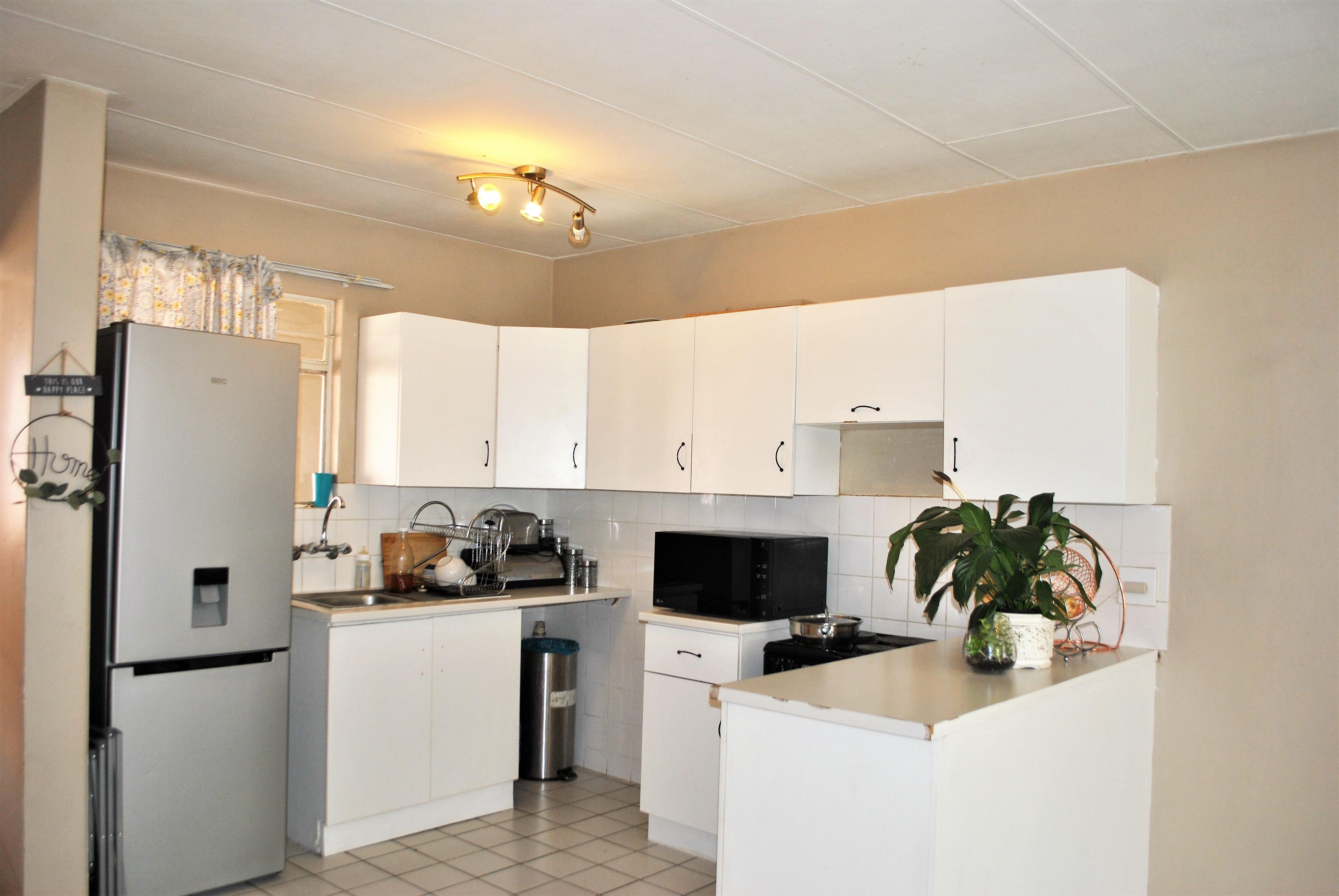 The kitchen offers ample built-in cupboards, space for a washing machine and a single-door fridge.