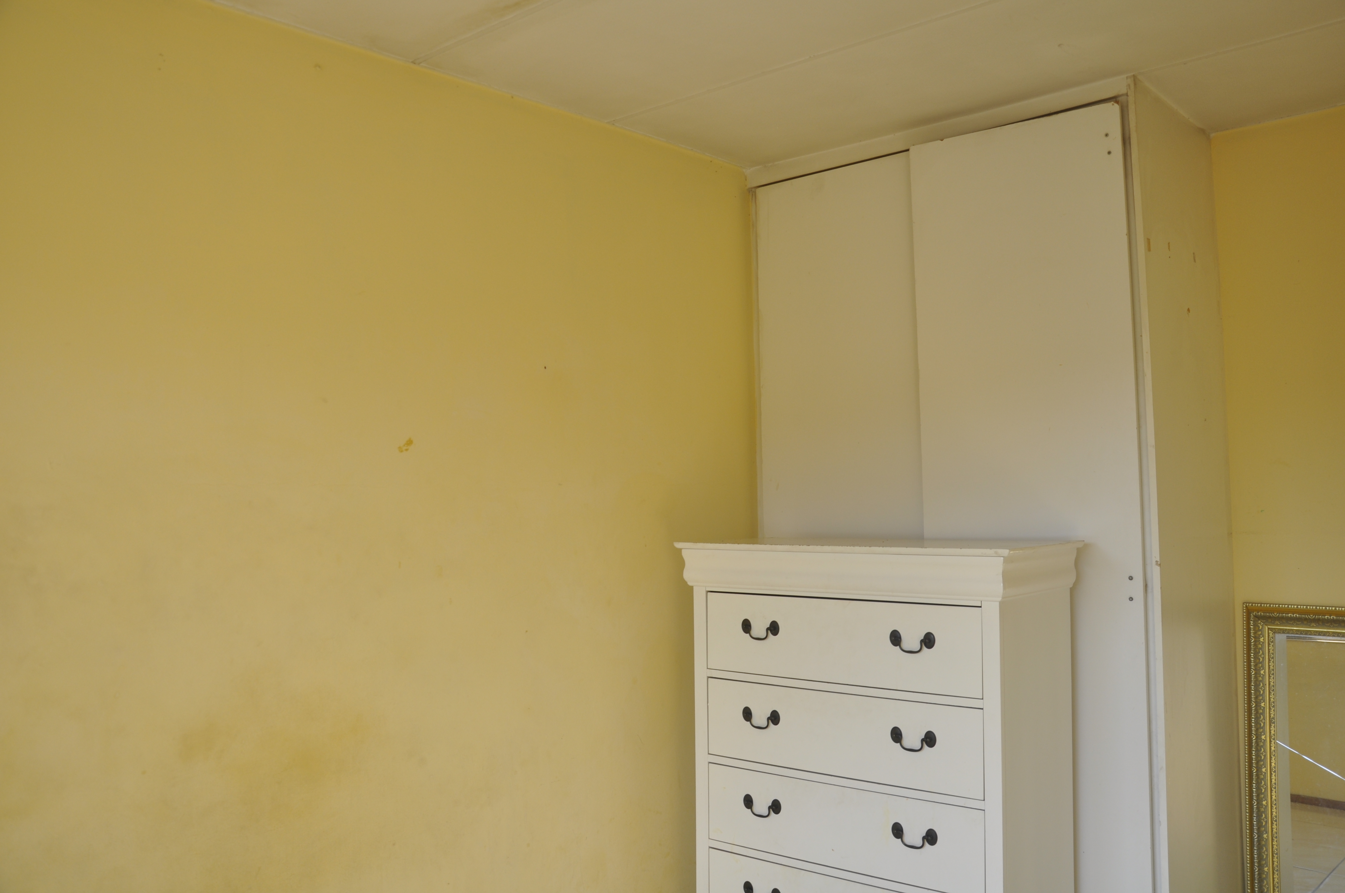 The kitchen offers ample built-in cupboards, space for a washing machine and a single-door fridge.