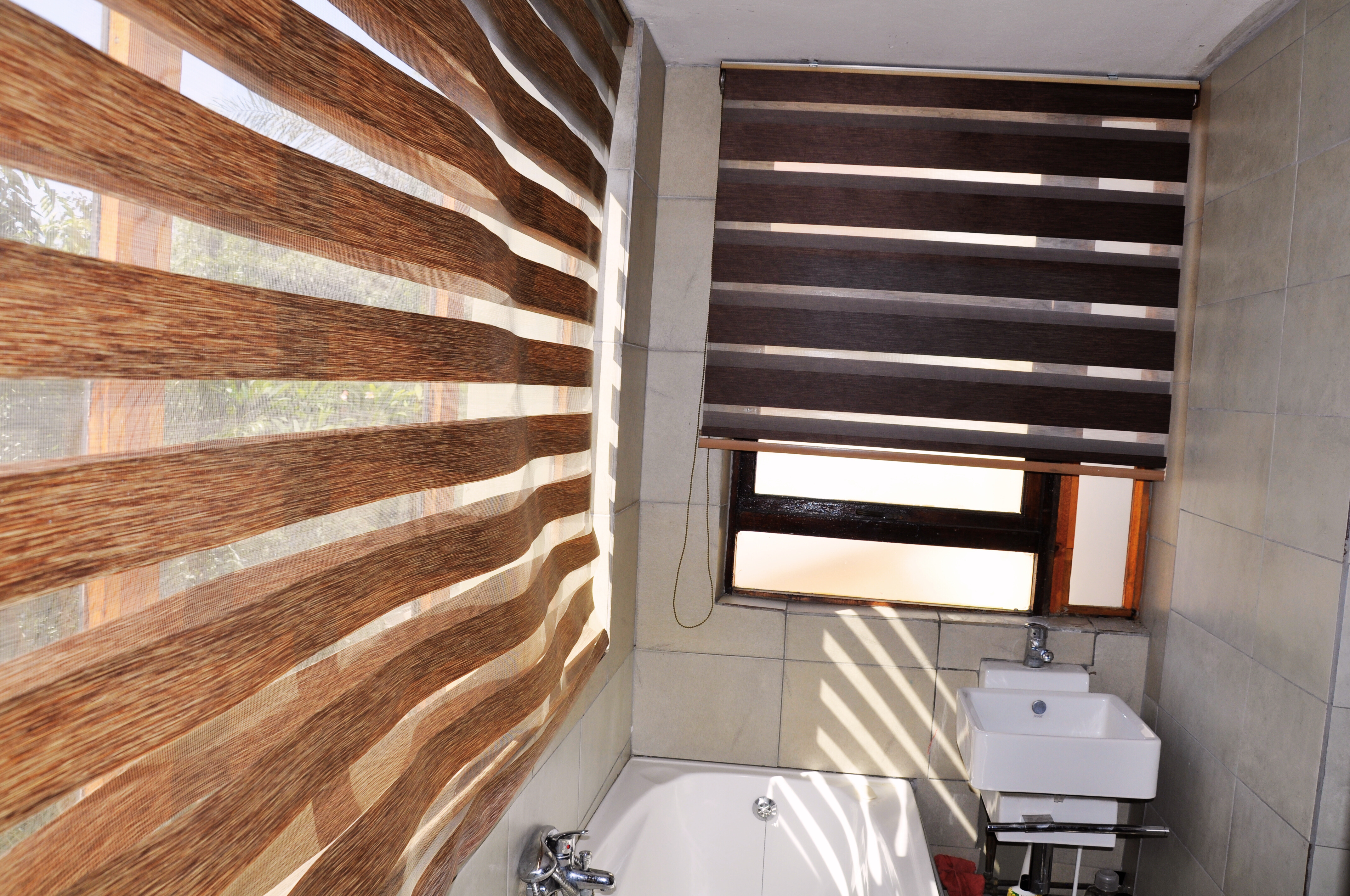Two spacious bedrooms and two bathrooms upstairs. The main bedroom has an en-suite bathroom with a bathtub, shower, loo, and basin. The entire house (apart from bathrooms) has laminated flooring.