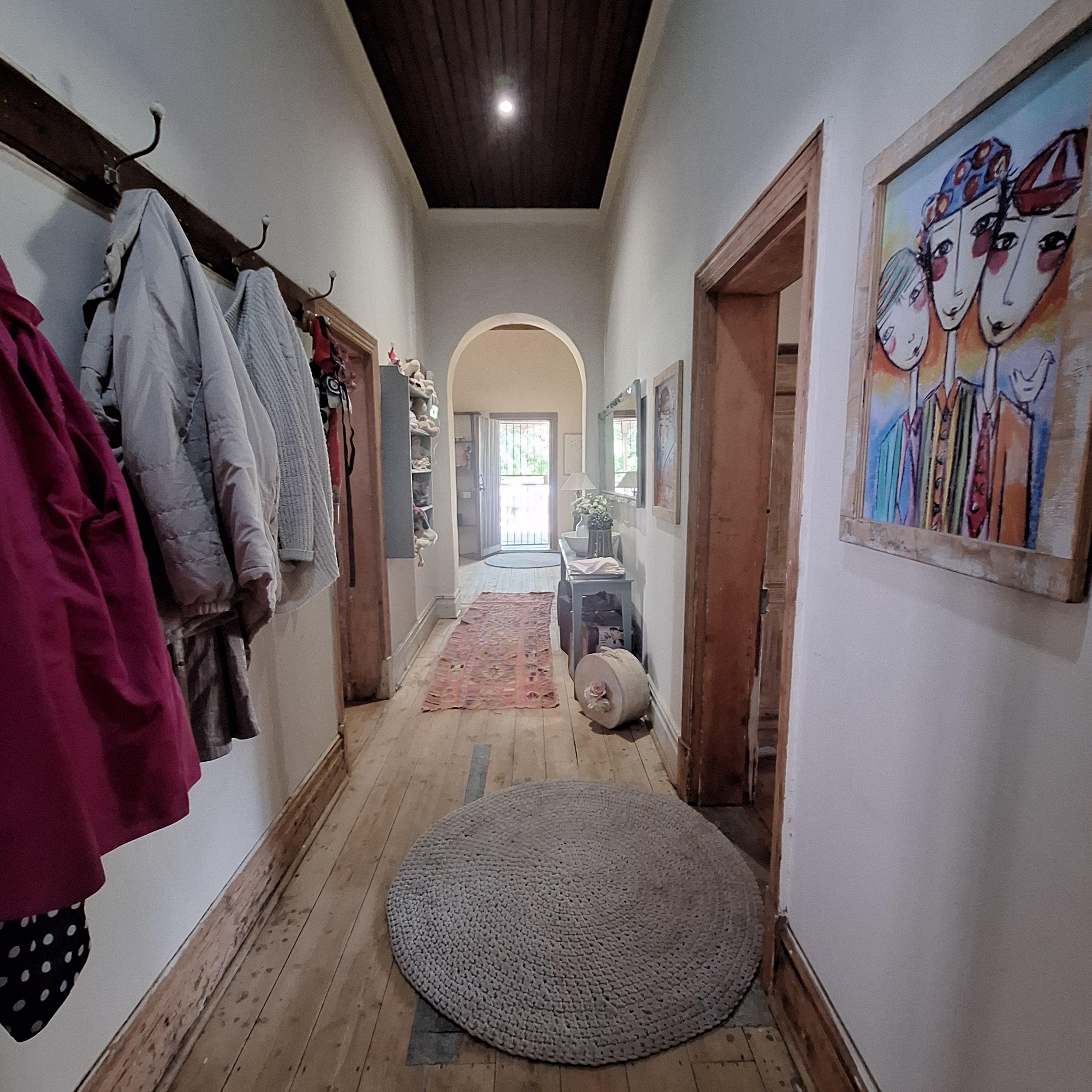 A welcoming entrance leads into a wide, wooden-floored passage, setting the tone for the home's vintage appeal. High ceilings and large windows create an airy, light-filled ambiance throughout. The formal dining room and cozy lounge, brimming with old-world charm, offer inviting spaces for entertaining or unwinding, especially with their doors opening up unto the veranda.